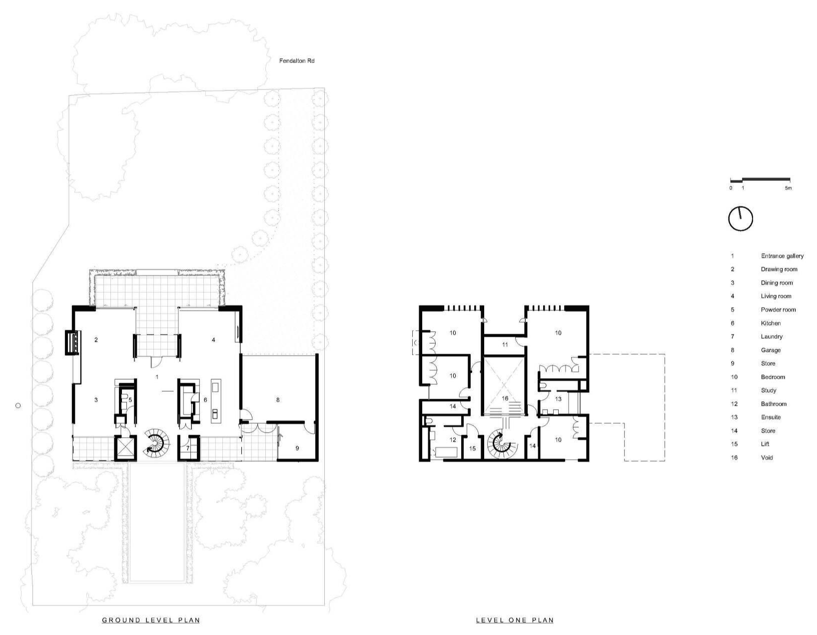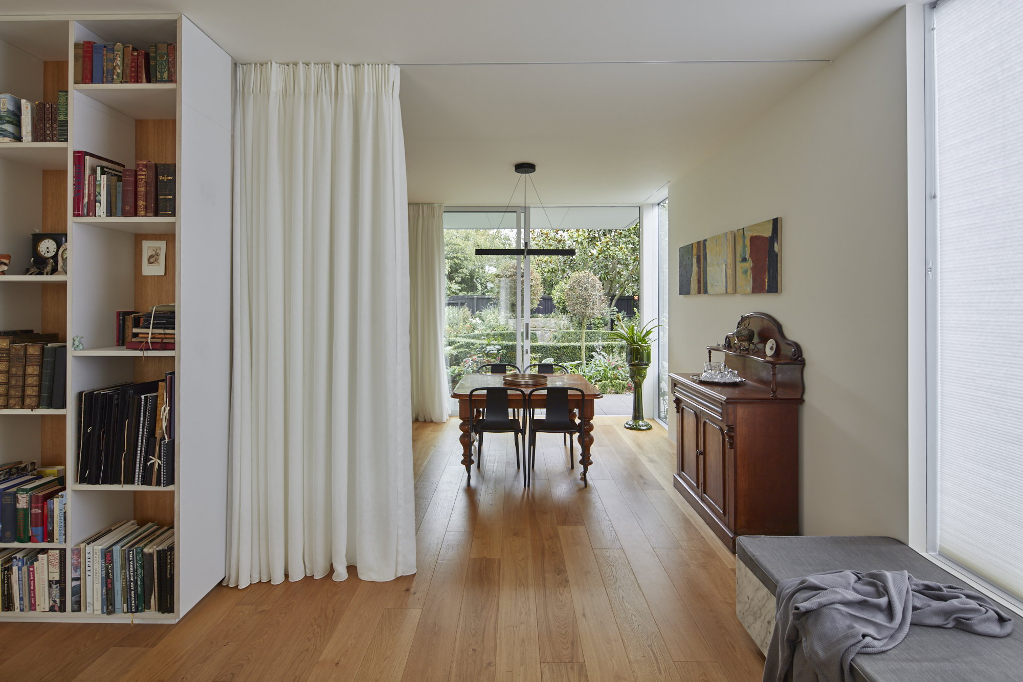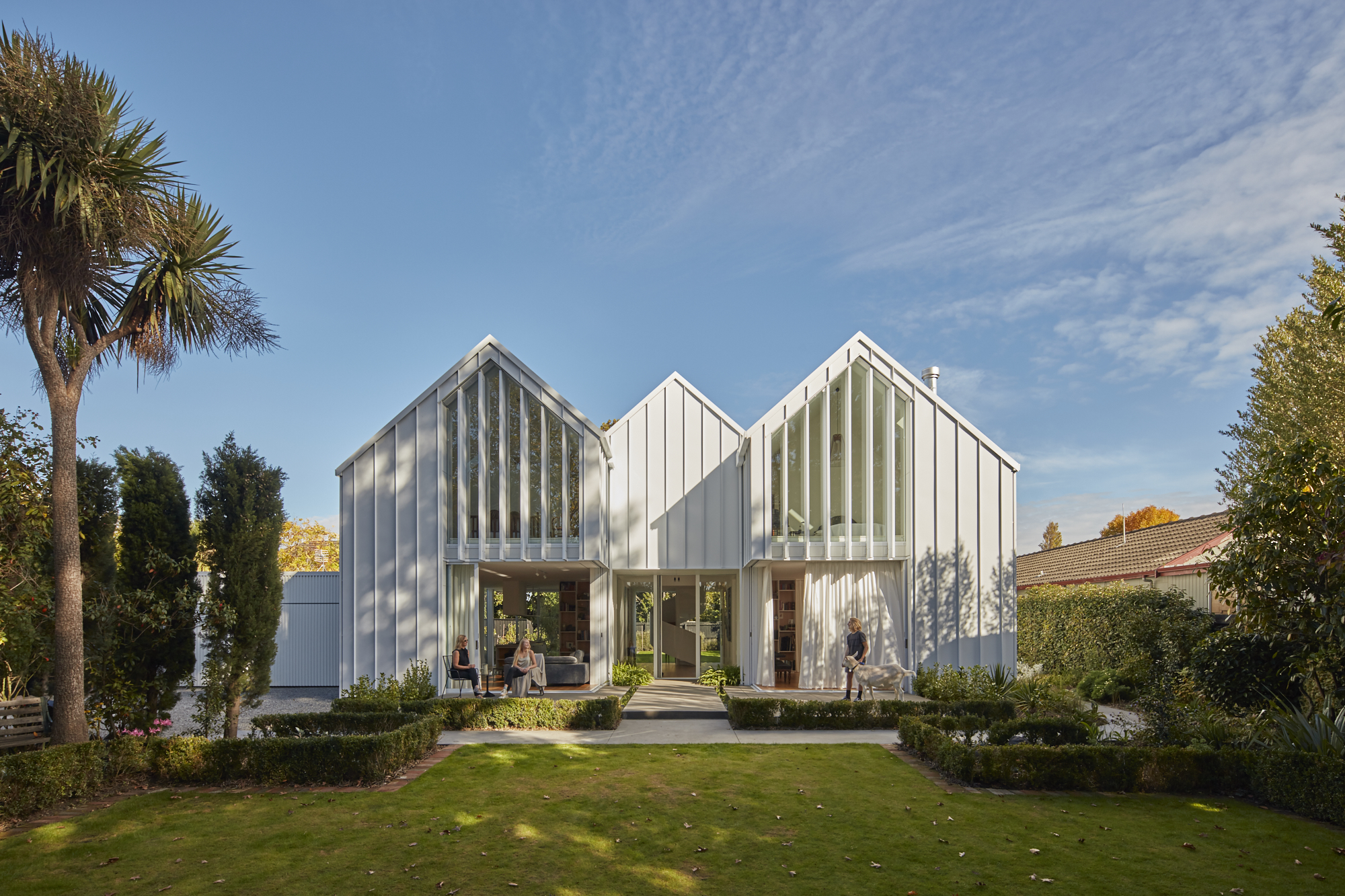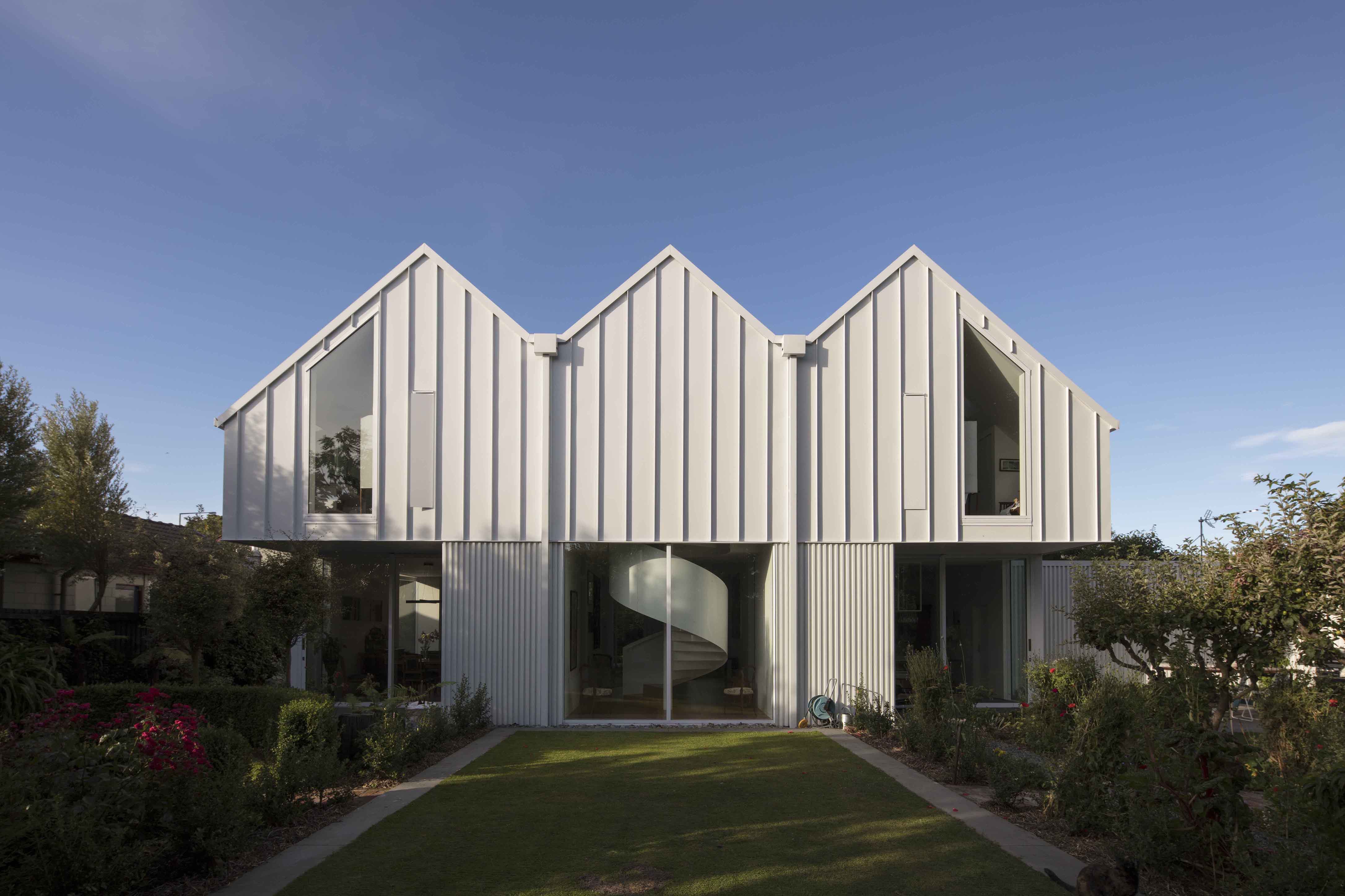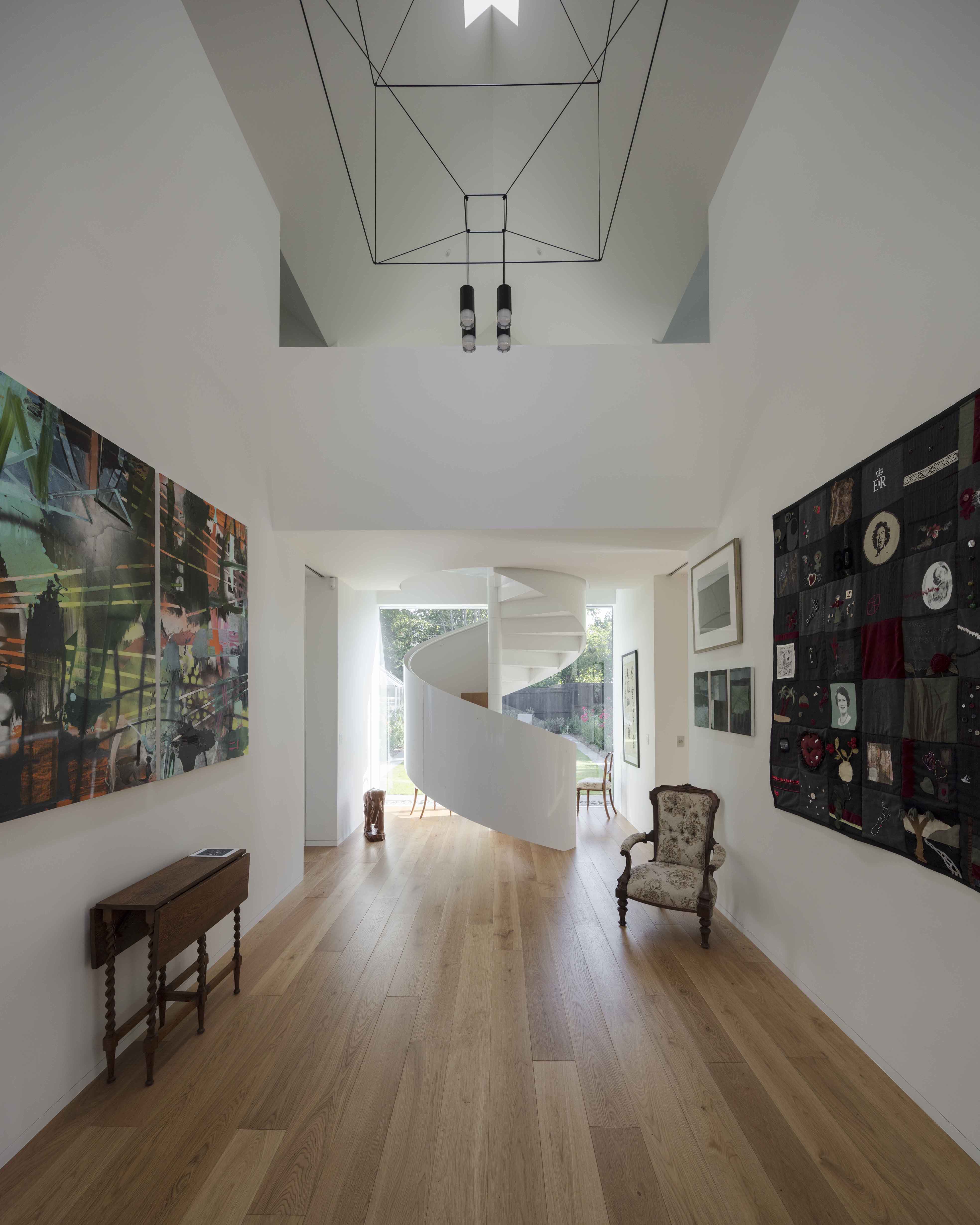 The Fendalton Road project explores the love and memory a retired couple have of a home and site they have occupied for over thirty years. A two level 1910 home was destroyed in the devastating 2011 Christchurch earthquake, and subsequently demolished. A new home was required within the footprint of the original. An existing formal garden adorned the level site and was to remain untouched for the new home. The owners’ established connections to the site and space were at the forefront of this project. The new home, with its white, triple-gabled roof, looks to honour the memory of the spatial relationships of the original home. The design was required to enhance and celebrate these conditions. For the owners, the space is reminiscent of the historic home, but revived by a bold contemporary reinterpretation. The entry hallway is a central hub to the home - enhanced and widened with a ceiling higher than eight metres - it now provides a versatile space for entertaining. The house functions as an airy gallery-like space for the owner’s art collection, and antique furniture - all from their original home. The ground floor spaces are connected through an open circulation but can be manipulated into smaller, more intimate areas by closing large pocket sliding doors, curtains and retractable windows. The programme places the ground floor living areas and kitchen in their original locations but seeks to highlight the existing garden by reordering the spaces to provide a stronger connection to the landscape. This association, that was once limited by traditional window openings is strengthened with full height openings that provide site lines to the front and back garden throughout the house. A sculptural spiral staircase connects the two wings, and the home is future proofed with the inclusion of a passenger lift, serving four bedrooms and two bathrooms on the upper floor.