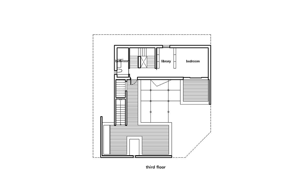 평면계획: 이전 주택계획에서는 인지하지 못했던 특징을 이번 설계를 통해 알게 되었다. 그것은 우리의 주거는 기본적으로 외부공간과의 단방향이 아닌 양방향 고려를 우선으로 하기 때문에, 필연적으로 지상층을 기본으로 계획된다는 것이다. 상부, 하부층은 지상층에 귀속된다. 물론 건축이 땅과 만나는 방식은 건축의 기본적인 출발점이지만, 우리나라 건축에서 그 위상은 다른 국가의 건축계획보다 훨씬 더 강력한 동인으로 작동한다. 설계 중반에서부터 인지된 이 사실로 인해, 적층계획 또한 지상 1층에서의 경험을 최우선으로 했다.