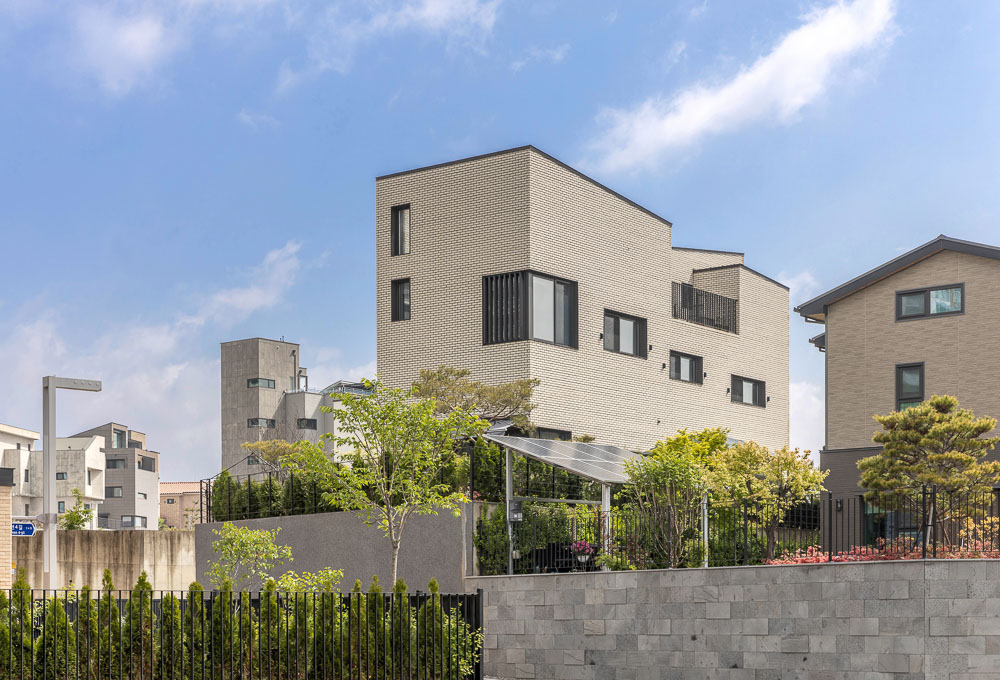 What I was most worried about was the movement line on the second floor requested by the client’s son’s family. Unlike other houses, they wanted the laundry and toilet areas to be accessed first when entering the house, then the room, and finally the cozy kitchen and living room. This configuration was the exact opposite of the one of his parents right below them. The skeleton of Troy was completed by using a long straight staircase to balance the difference between the upper and lower floor heights and arrangements, and the upper and lower floors were connected in a structured way. The appearance of two equally bright brick masses slanted from east to west, inserted between the two floors, illustrates that the two generations coexist vertically and harmoniously.