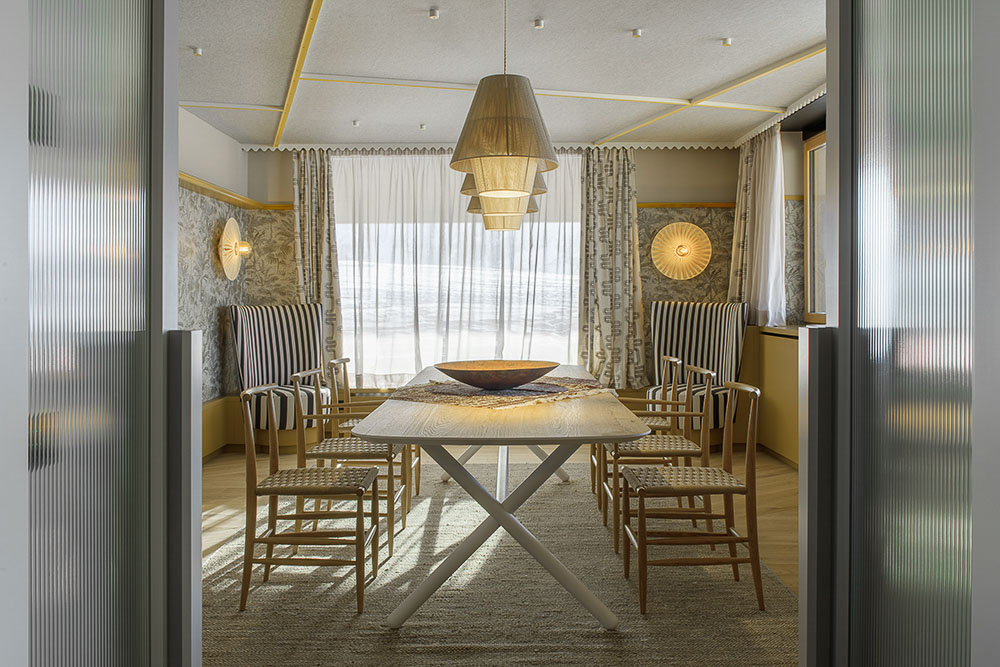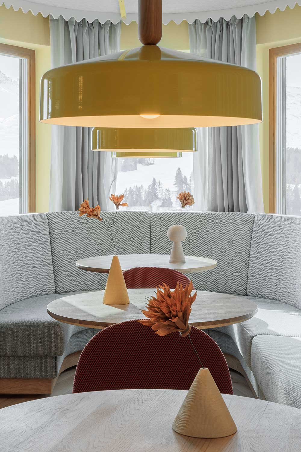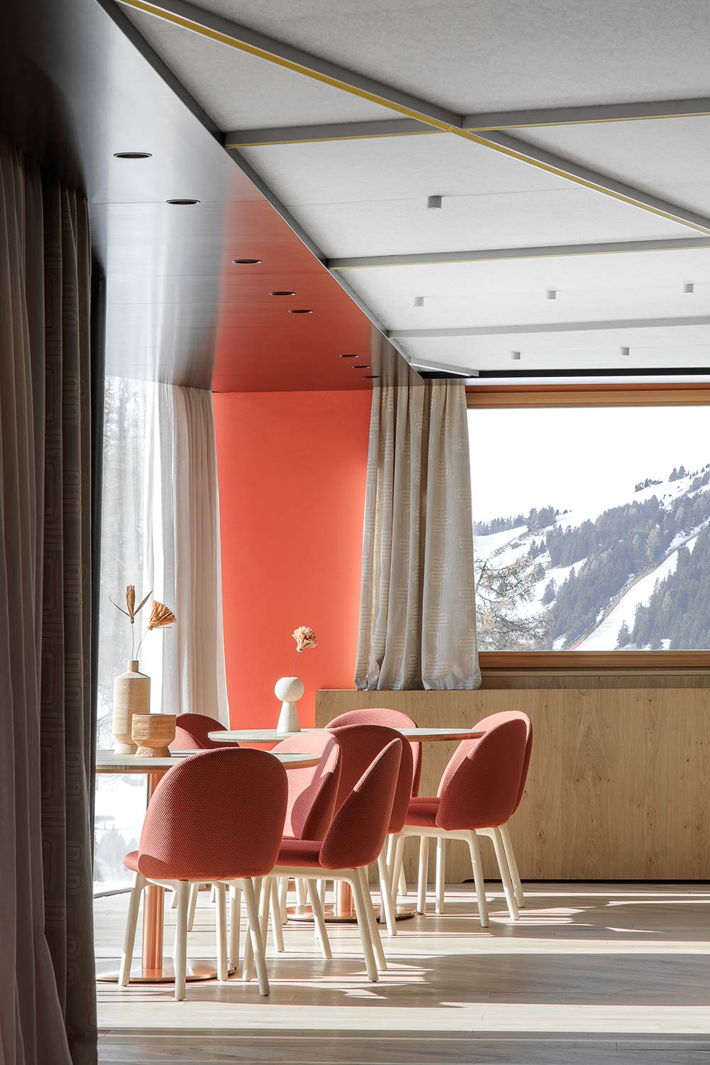 At the ground level, down the length of the building, a clearly defined throughway unravels a succession of common areas: entry, reception, shop, lounge, bar and dining hall all participate in the colorful exchange between guests, visitors, outdoor enthusiasts and the Sattler family. The eclectic convergence of materials, textures and fixed furniture elements string the programs together and rescripts the collective memory of traditional alpine interior spaces. While the wood lined dining alcoves with banquette seating conjure up the hospitality of long-established lodge interiors, the monolithic, cloudy-grey marble of the buffet table and bar counter anchor the defining moments of gastronomical delight at the center of this spatial continuum. Similarly, the characteristic coffering of the alpine wood is revisited with an all-enveloping surface of acoustic-felt panels partitioned by notched, intersecting yellow moulding profile. In tandem with the overhead paneling, the braided texture of the oak planked flooring weaves together the mirrored angles of the hotel’s footprint in a subtle tete-a-tete between old and new.