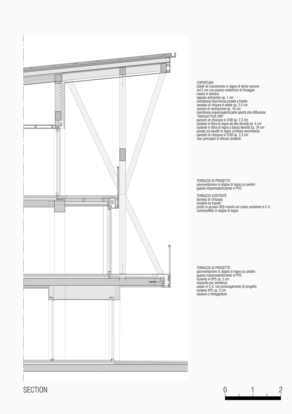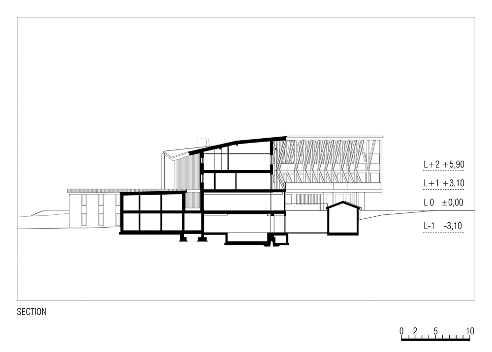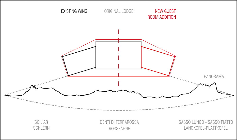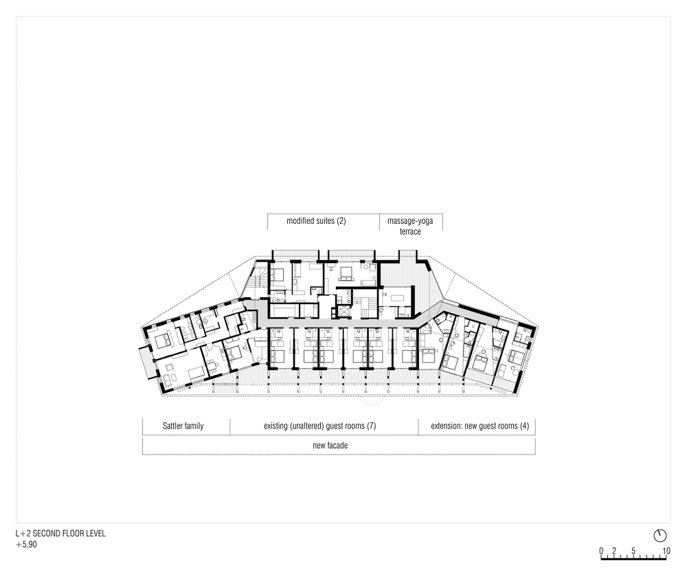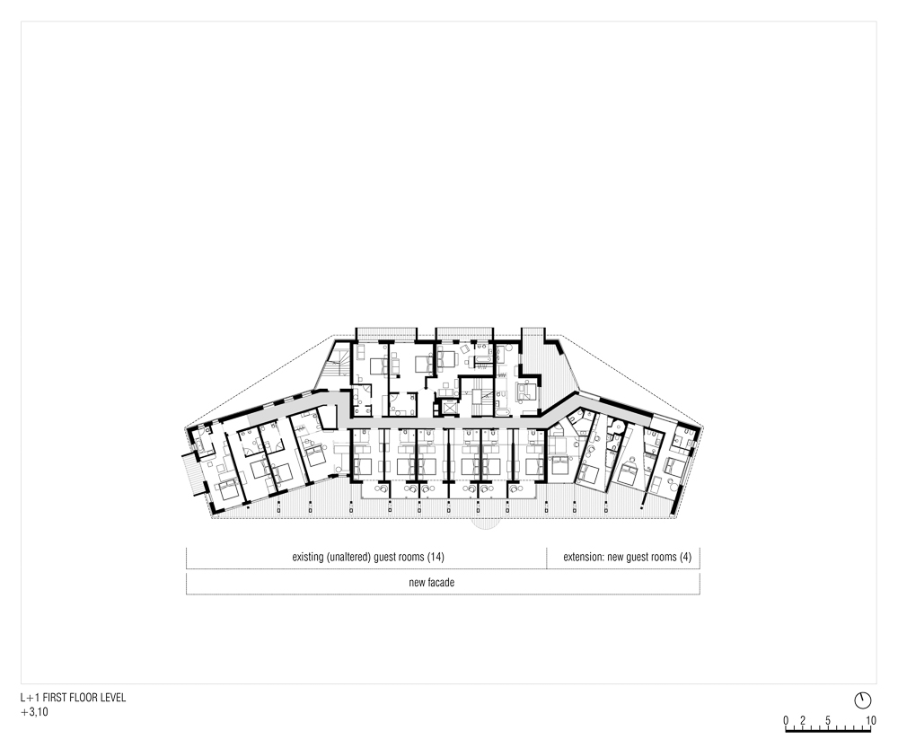새롭게 증축된 부분은 기존 건물의 축을 따라 서쪽 날개를 미러링하여 전체적으로 대칭을 형성한다. 바깥쪽으로는 굵은 톱니 모양의 낙엽송 목재 스킨은 큰 경사의 목재 지붕 및 목재 기둥과 함께 과거의 무수한 수정 사항을 응집력 있는 건축물로 포함하는 하나의 질서체계를 만든다. 높이 7.5m의 나무 기둥 13개가 55m의 남향 파사드를 따라 2개 층에 걸쳐 있다. 이 기둥은 지붕을 고정하면서 손님들이 건축물과 풍경을 만나게 하는 중간 틀의 역할을 한다. 1층 테라스는 건물의 두 모서리를 가로지르는 직선을 그어 통풍이 잘되는 이중 높이의 열린 복도로 계획하여 객실의 내부 공간을 외부로 확장한다.