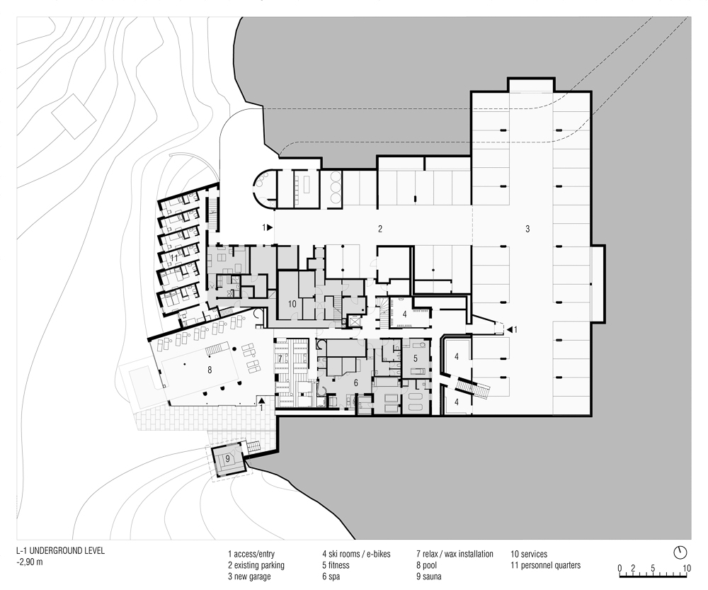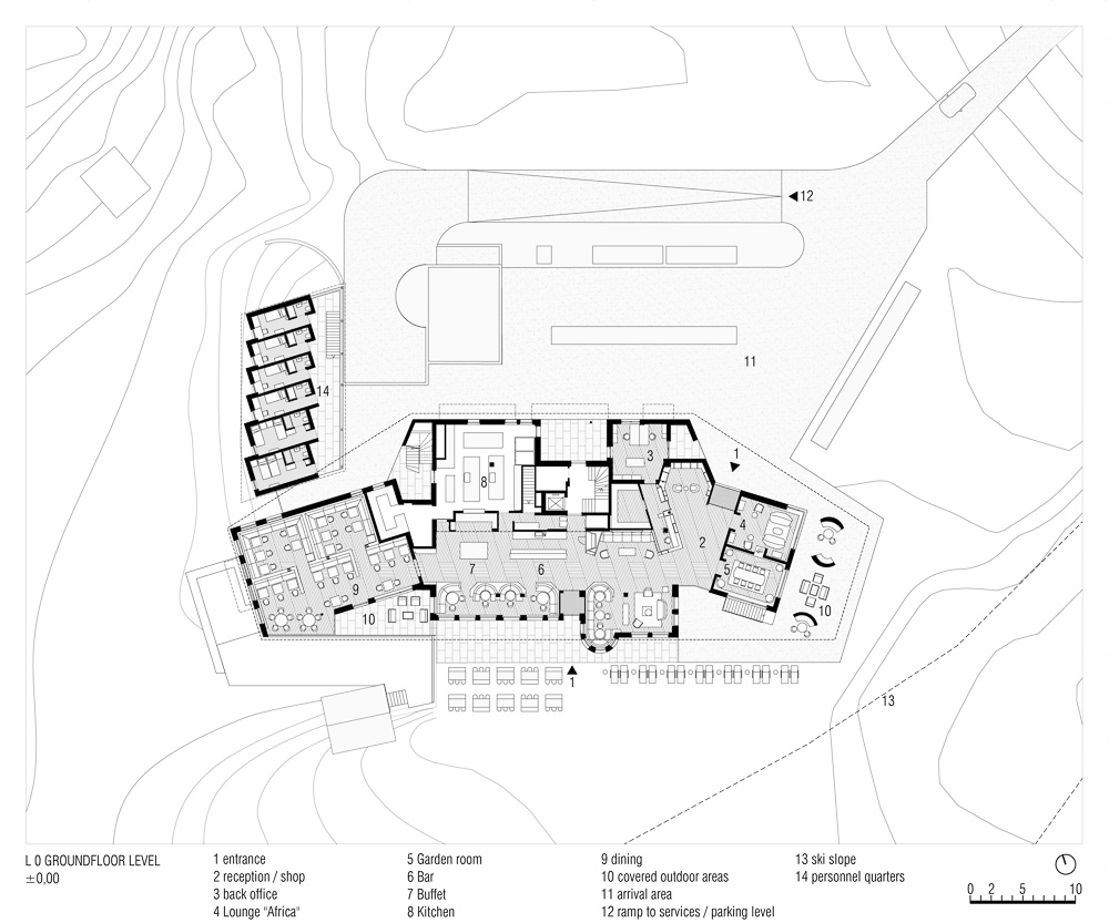 1층은 출입구, 리셉션, 상점, 라운지, 바, 식당 등 일렬로 놓인 공용 공간은 투숙객과 방문객, 야외 애호가, 건축주의 가족 간에 다채로운 교류를 하게 한다. 재료, 질감, 고정 가구 요소의 다양한 조합은 프로그램을 하나로 묶고 전통적인 고산 지역의 실내 공간을 기억하게 한다. 나무로 마감된 식당의 벽은 오랫동안 자리 잡은 산장 인테리어를 연상시키는 반면, 뷔페 테이블과 바 카운터의 모놀리식 흐릿한 회색 대리석은 이 공간의 중심에 미식이라는 즐거움의 결정적인 순간을 고정한다. 유사하게, 고산 목재의 특징적인 코퍼링은 교차하는 노란색 몰딩 프로파일에 의해 분할된 음향 펠트 패널의 전체를 둘러싸는 표면을 통해 다시 살펴보게끔 한다. 오버 헤드 판넬과 함께 오크 판자 바닥의 질감은 호텔의 발자국의 거울 각도를 함께 엮어 오래된 것과 새로운 것 사이의 미묘한 사담을 만들어 낸다.
