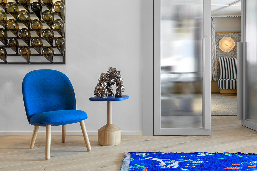 Embedded within the interiors of the hotel lie stories, family heirlooms, and a celebration of contemporary artistic endeavors and artisanal know-how. The reception, shop and lounge area are designed as a full-height, thickened wainscoting of oak panels and deep blue recesses that collect a disparate range of subjects much like a cabinet of curiosities. The juxtaposition of people, animals, books, art, objects and hospitality accoutrements explore the folkloric otherness of the local culture.