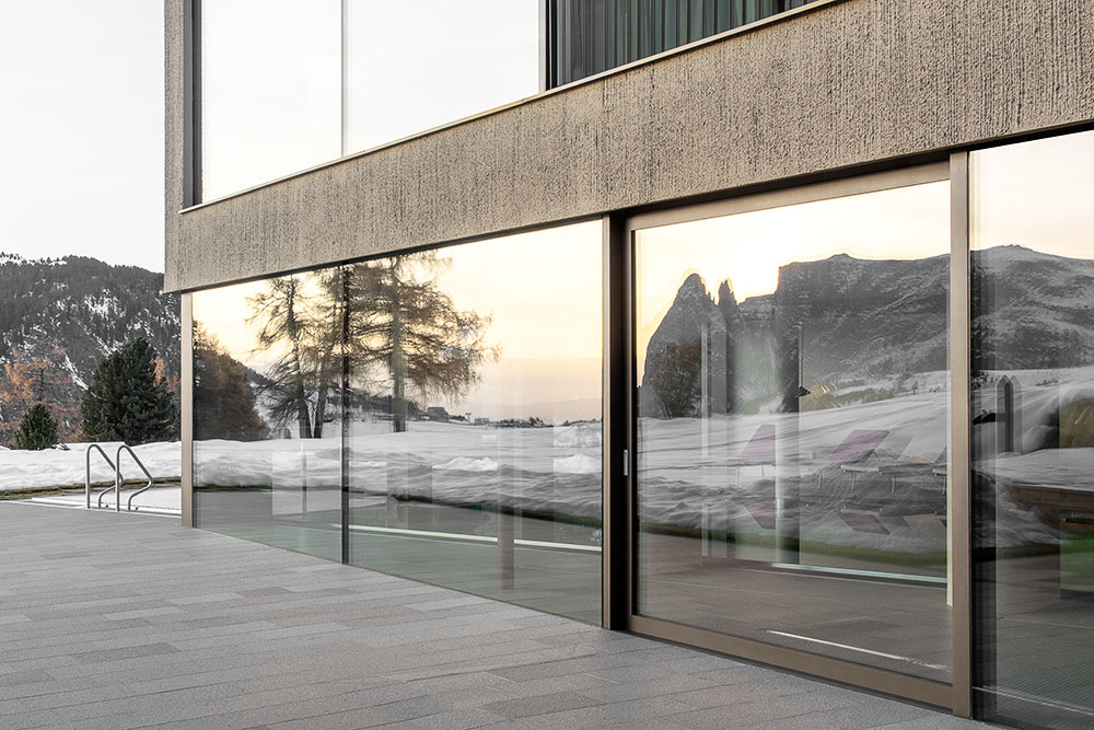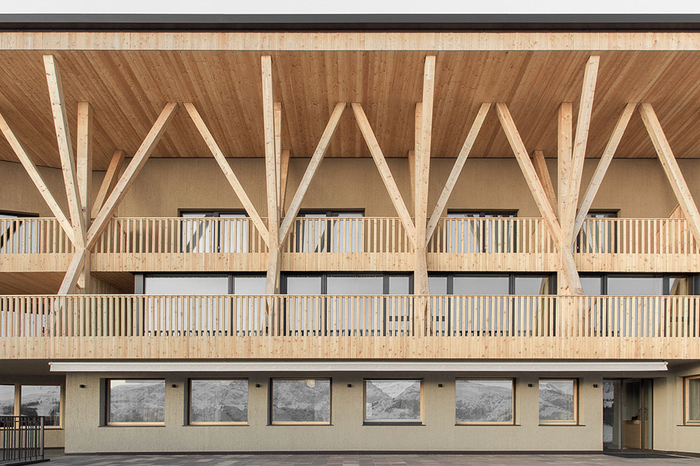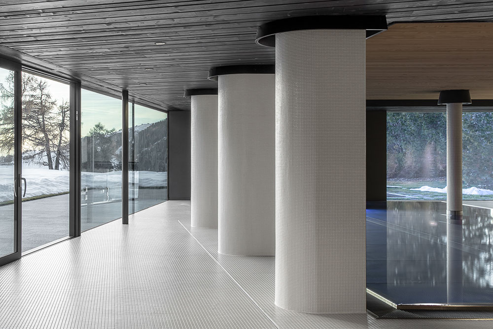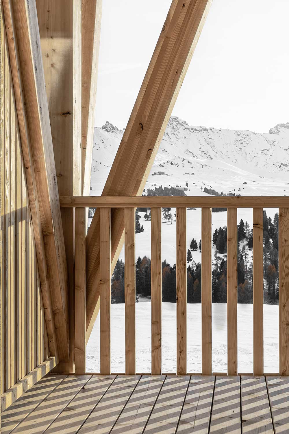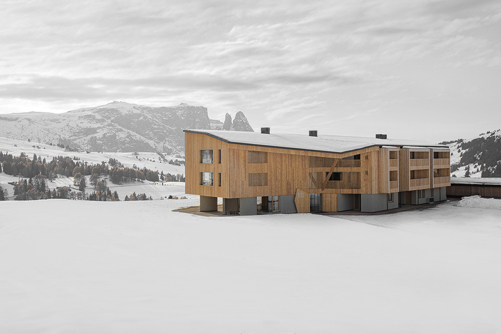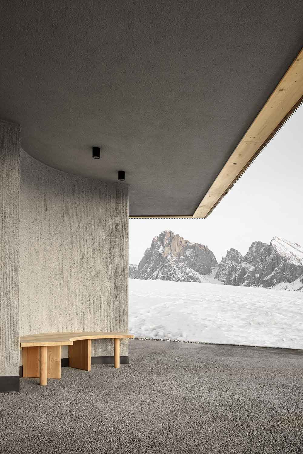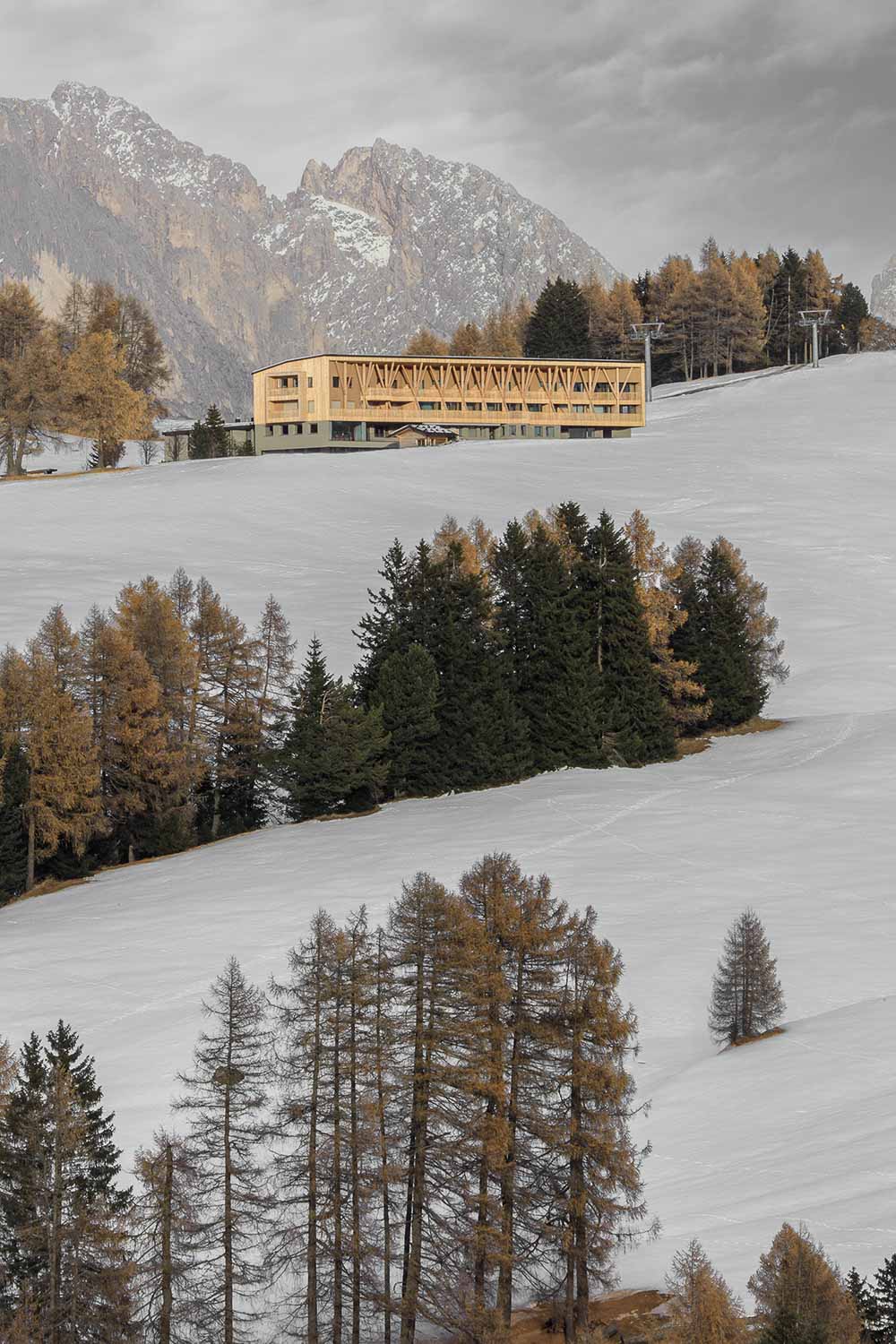 Positioned on the Alpe di Siusi plateau at 1,900m above sea level and set within South Tyrol’s Dolomites UNESCO World Heritage site, the hotel’s humble origins date back to a simple 1930s mountain lodge. Granddaughter to the founder of the original Icaro lodge, Angelika Sattler commissioned MoDusArchitects to overhaul the structure and reimagine its identity. The various interventions include an underground parking extension, the separate staff quarters, a guest room addition, the reorganization of all the common spaces including the pool area, and the sweeping, giant order colonnade of wood along the main facade that intercepts the breathtaking mountain views.