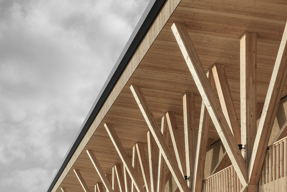 In plan, the new addition mirrors the existing west wing along the axis of the original lodge to forge a symmetry of parts to the whole relationship. On the outside, the thickened saw-toothed larch-wood skin, together with the large pitched wooden roof and the timber columns, constitute an ordering system that subsumes the myriad of past modifications into a cohesive architectural body. The 13 branching wood columns 7.5m high that march down the 55m length of the south-facing facade and span over the two upper floors are structural elements that tie the roof into place and serve as a middle-ground frame through which guests measure themselves up against the architecture and the landscape. The first floor terrace draws a straight line across the two far corners of the building to define an airy, double-height loggia that extends the interior spaces of the guest rooms outwards.
