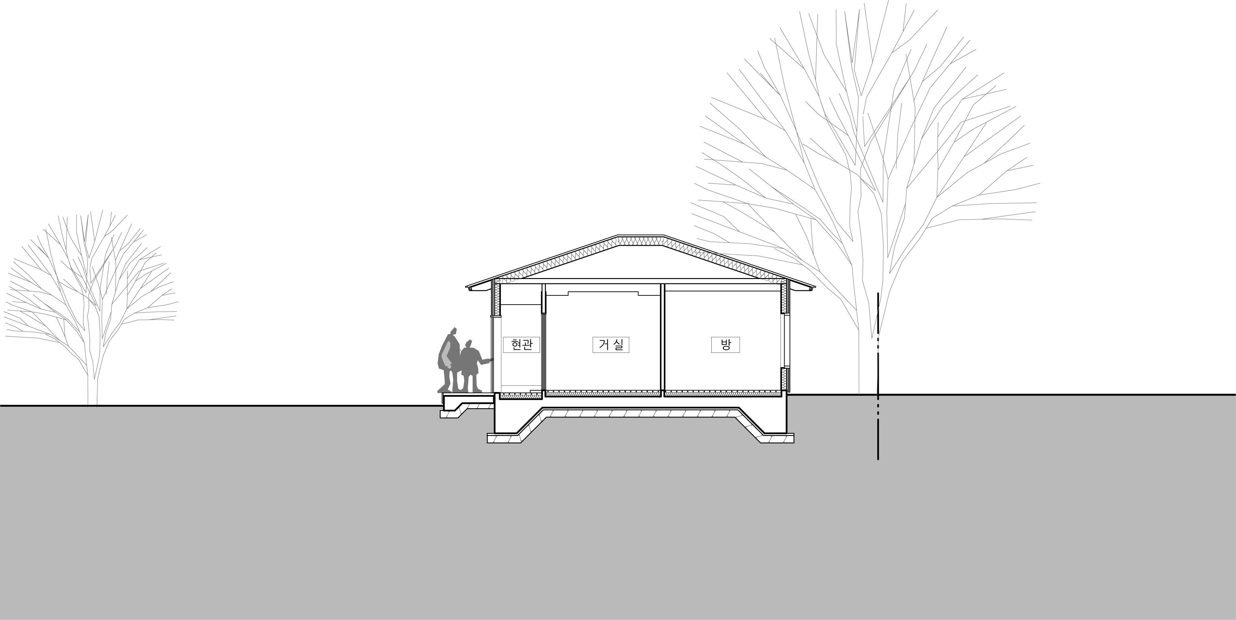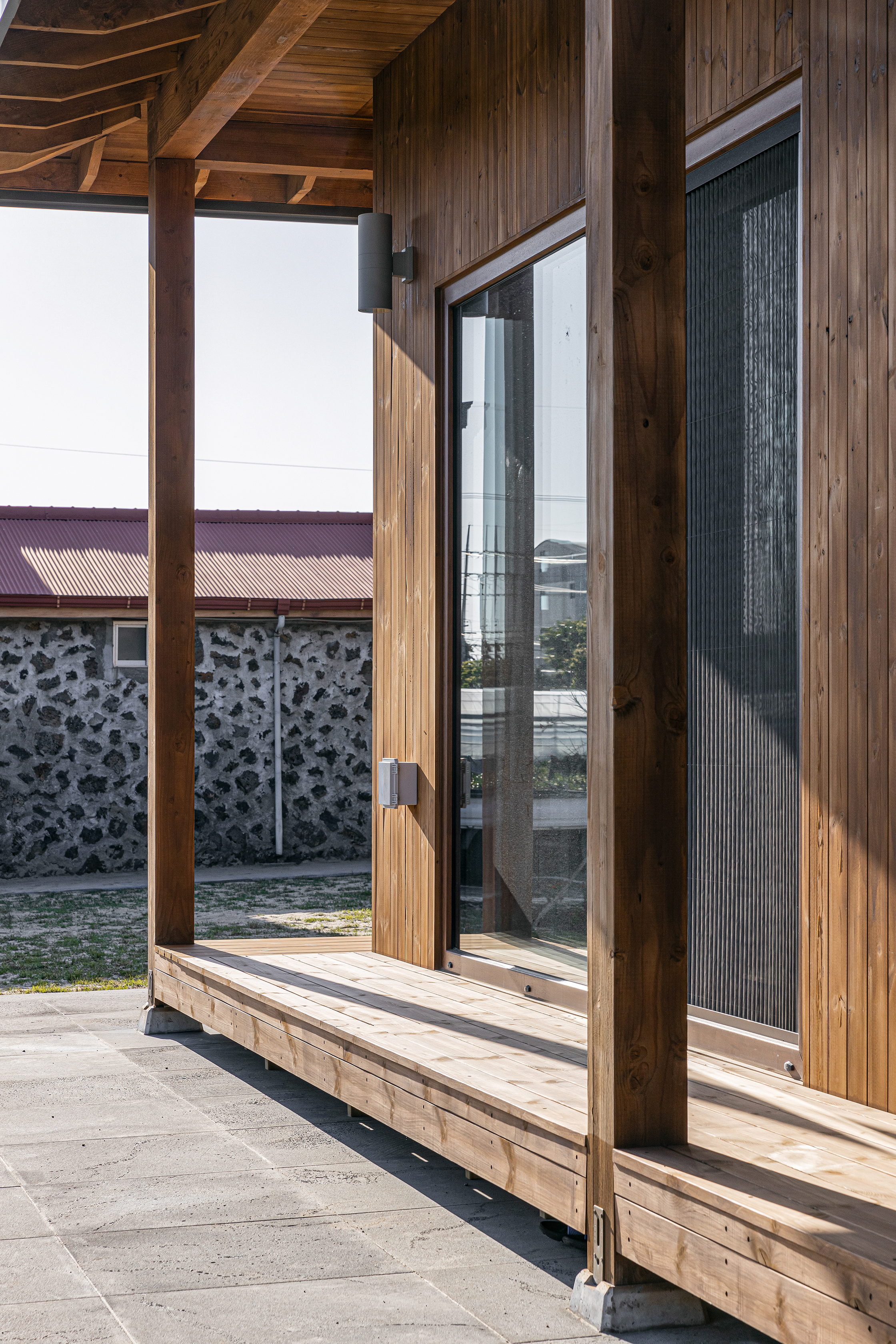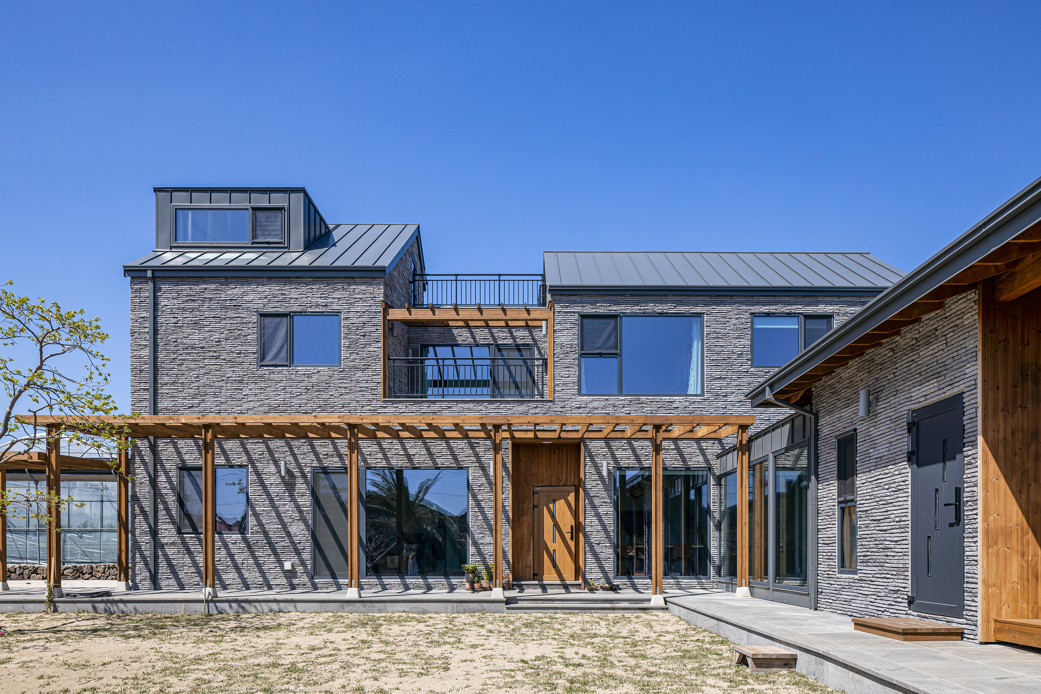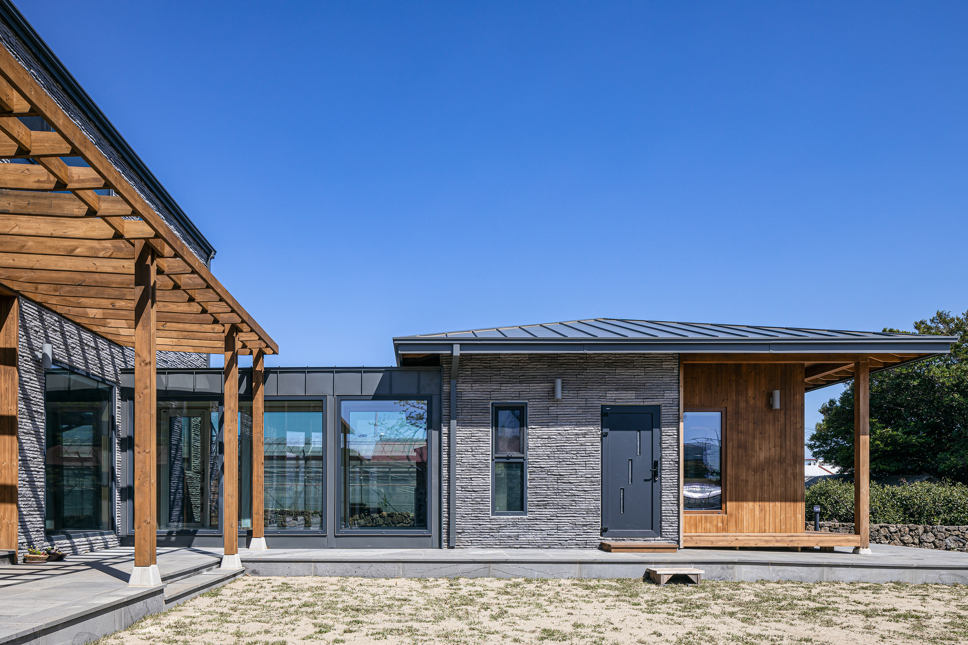 The client came to Seoul from Jeju Island when he was young, and now he has reached the age of retirement beyond middle age, returning to the place where he was born and raised again, off the coast of Seogwipo, and behind Hallasan Mountain to build a house with his mother and father. It was named ‘Jehoga’ after the owner's name, ‘Jaeho.’ His parents are not the only ones waiting for him who went up to Seoul a long time ago. The house with memories, the nutmeg tree he rode when he was young, became a magnificent folding screen, and the tangerine trees my father used to take care of, stone walls, the path he walked on to school, and the house was old, but the trees grew up well and became great arms to embrace a new family. Many things there remained the same. As such, I wanted to protect the memories that his family had made together and many of them. In addition, the space for the family did not necessarily have to be new. In particular, the warehouse building on the left side of the site built by the owner's father was not bad in location, and the interior timber frame was quite impressive. Therefore, it was actively recommended to use it as a workplace or cafe in the future, and it was reflected in the deployment plan. The client, wife, father, mother, and son who can be together. It must be a family, but everyone has lived in different spaces for decades. Of course, the most important thing is the space to be with each other, but now the space that you like and need is inevitably different. Composition of internal and external spaces for each member of the family was also essential. An old house site and basalt that my father had been guarding for a long time. Basically, after securing a pleasant living environment, I wanted to protect the existing and familiar things as much as possible. The materials in the house stained with hands, the tangerine trees that always appeared over the window when I woke up, and the windowsill was lowered so that you could see them even if you were older, and a Toenmaru was also prepared under the warm sunken rafters. However, using some internal materials as they are was not realized by disagreement with the contractor. So, for now, the location of the parent's consent was maintained. The eldest son of the head family and the eldest daughter-in-law, the head of the owner couple Hyun's family, and a separate ritual room for various family events for the eldest daughter-in-law and a sufficient size water kitchen were requested. In particular, it is a good thing for a father and son to live together, but since they have lived apart from their son for a long time, appropriate spatial separation was also needed. Therefore, the parents' building was set up as a separate house in the existing house location and connected to the kitchen of the main building with a corridor of communication. It planned an outer space for the owner, an outer space connected to the water kitchen, and a tangerine tree yard for small things to be used as a greenhouse in the future. For privacy, the space for the son who will live together is composed of a studio on the right and east sides of the second floor, and a separate entrance and exit route are prepared. It is a house where not only family members but also people can gather for family events such as ancestral rites, and usually there is an outside space for each father, son, daughter-in-law and grandson, so they can live their own lives. As such, the old and the new seem to have no choice but to coexist.