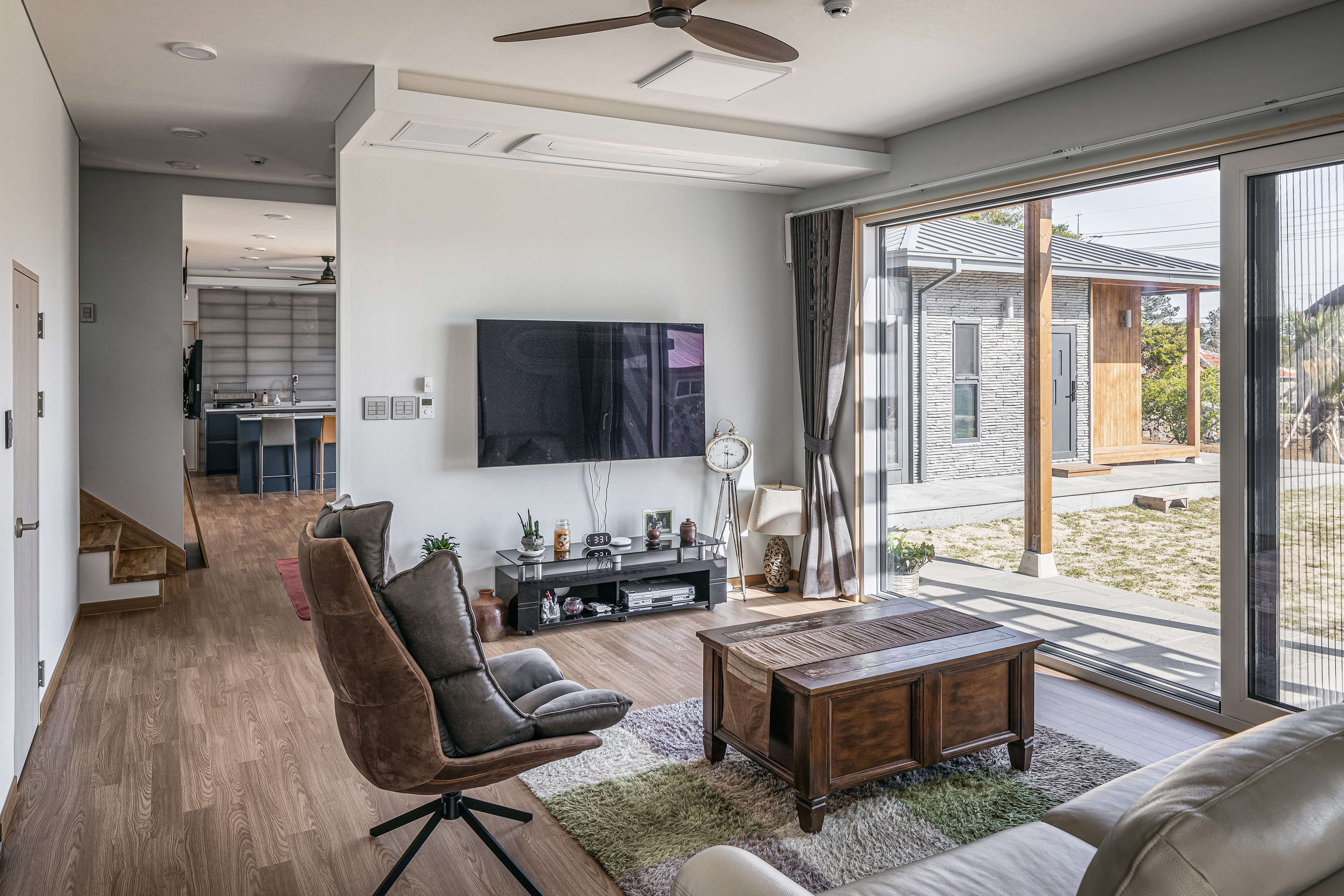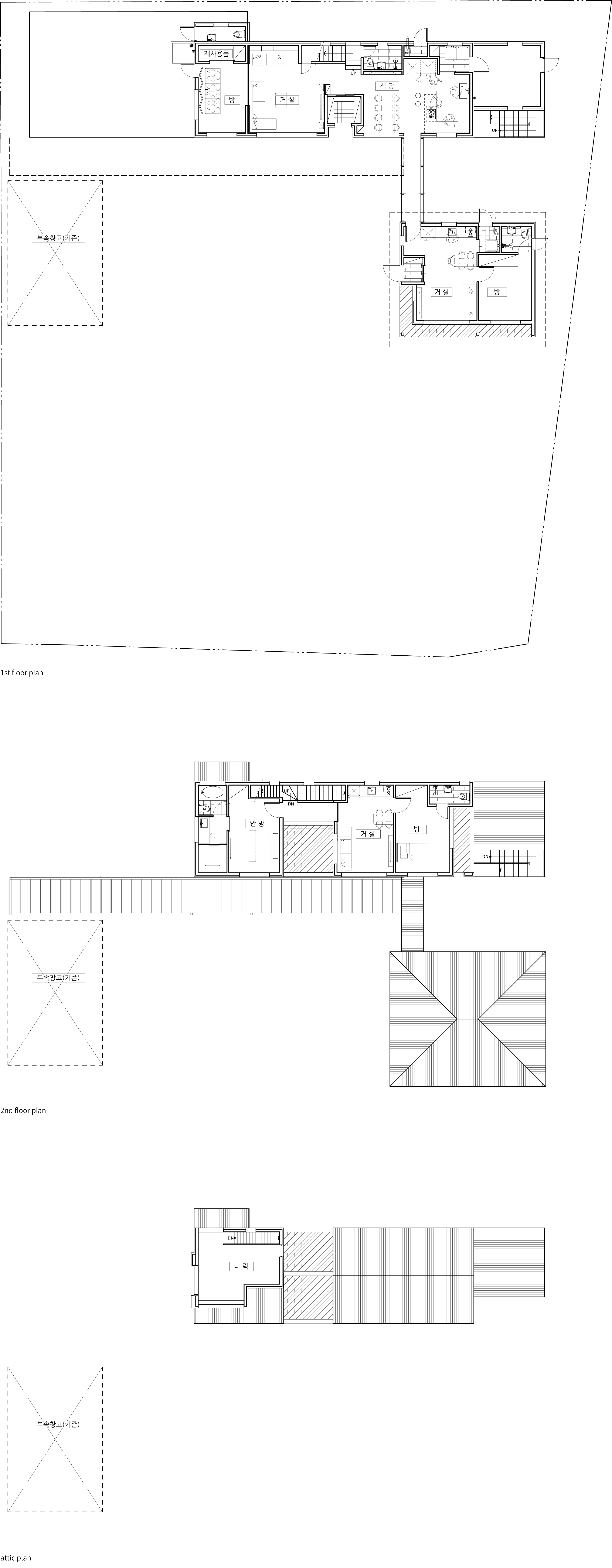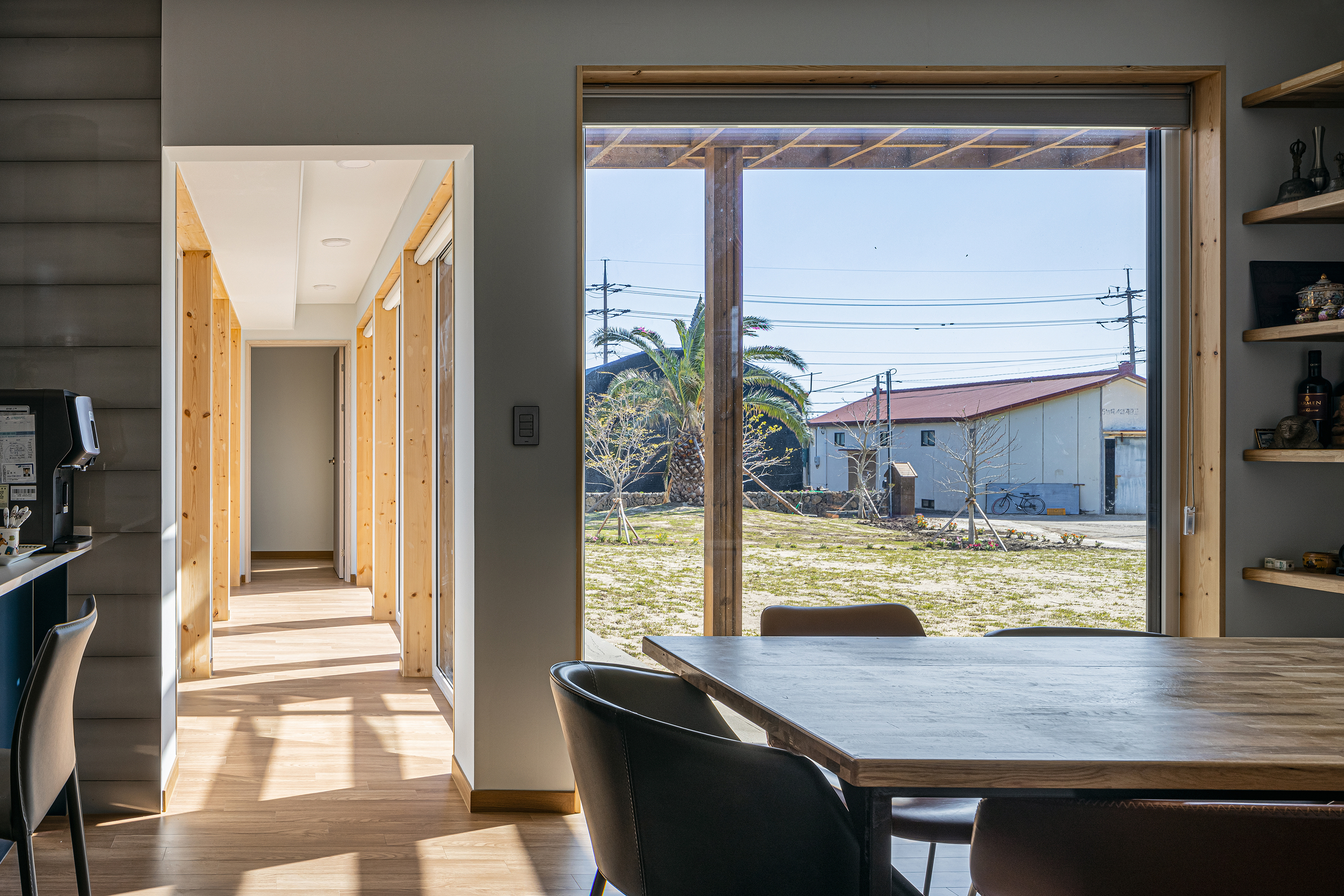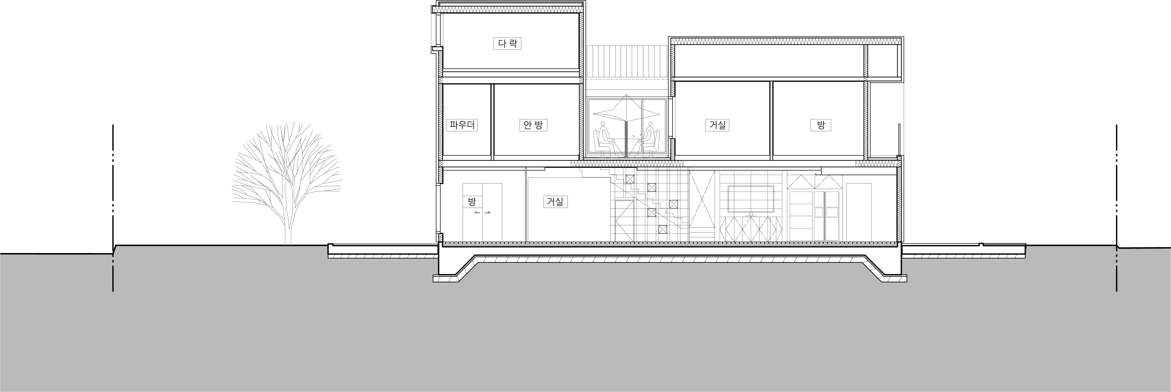 The client came to Seoul from Jeju Island when he was young, and now he has reached the age of retirement beyond middle age, returning to the place where he was born and raised again, off the coast of Seogwipo, and behind Hallasan Mountain to build a house with his mother and father. It was named ‘Jehoga’ after the owner's name, ‘Jaeho.’ His parents are not the only ones waiting for him who went up to Seoul a long time ago. The house with memories, the nutmeg tree he rode when he was young, became a magnificent folding screen, and the tangerine trees my father used to take care of, stone walls, the path he walked on to school, and the house was old, but the trees grew up well and became great arms to embrace a new family. Many things there remained the same. As such, I wanted to protect the memories that his family had made together and many of them. In addition, the space for the family did not necessarily have to be new. In particular, the warehouse building on the left side of the site built by the owner's father was not bad in location, and the interior timber frame was quite impressive. Therefore, it was actively recommended to use it as a workplace or cafe in the future, and it was reflected in the deployment plan. The client, wife, father, mother, and son who can be together. It must be a family, but everyone has lived in different spaces for decades. Of course, the most important thing is the space to be with each other, but now the space that you like and need is inevitably different. Composition of internal and external spaces for each member of the family was also essential. An old house site and basalt that my father had been guarding for a long time. Basically, after securing a pleasant living environment, I wanted to protect the existing and familiar things as much as possible. The materials in the house stained with hands, the tangerine trees that always appeared over the window when I woke up, and the windowsill was lowered so that you could see them even if you were older, and a Toenmaru was also prepared under the warm sunken rafters. However, using some internal materials as they are was not realized by disagreement with the contractor. So, for now, the location of the parent's consent was maintained. The eldest son of the head family and the eldest daughter-in-law, the head of the owner couple Hyun's family, and a separate ritual room for various family events for the eldest daughter-in-law and a sufficient size water kitchen were requested. In particular, it is a good thing for a father and son to live together, but since they have lived apart from their son for a long time, appropriate spatial separation was also needed. Therefore, the parents' building was set up as a separate house in the existing house location and connected to the kitchen of the main building with a corridor of communication. It planned an outer space for the owner, an outer space connected to the water kitchen, and a tangerine tree yard for small things to be used as a greenhouse in the future. For privacy, the space for the son who will live together is composed of a studio on the right and east sides of the second floor, and a separate entrance and exit route are prepared. It is a house where not only family members but also people can gather for family events such as ancestral rites, and usually there is an outside space for each father, son, daughter-in-law and grandson, so they can live their own lives. As such, the old and the new seem to have no choice but to coexist.