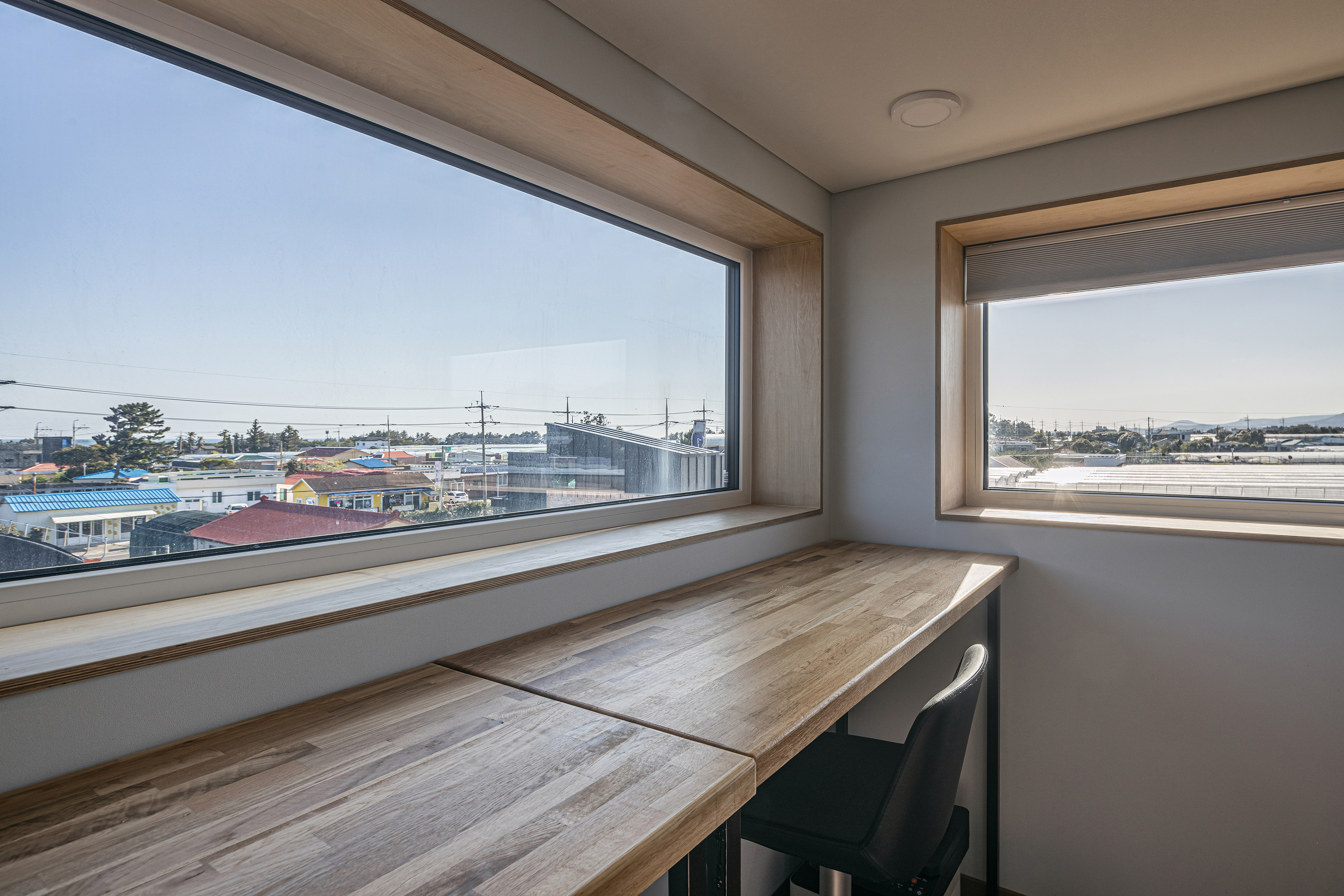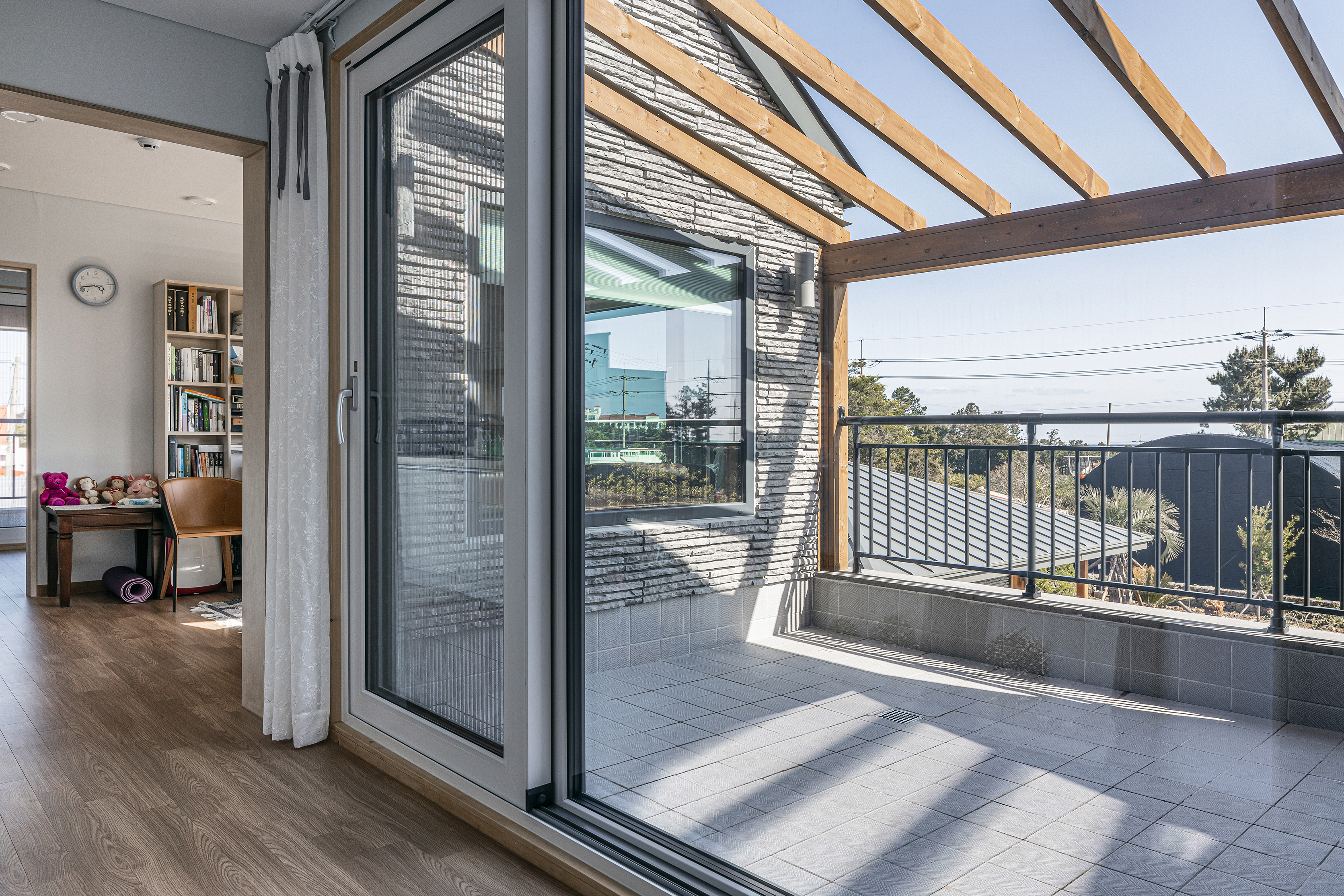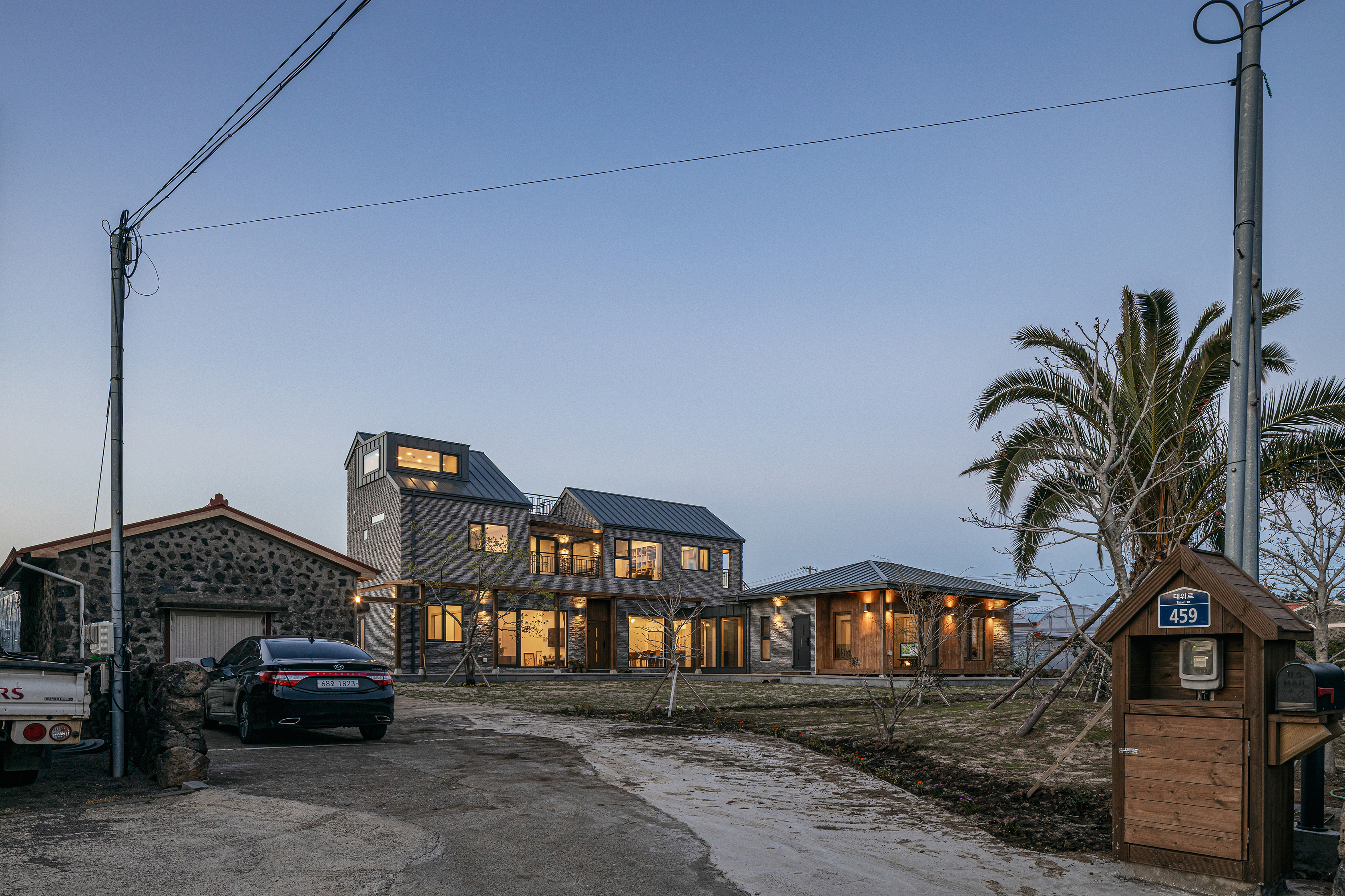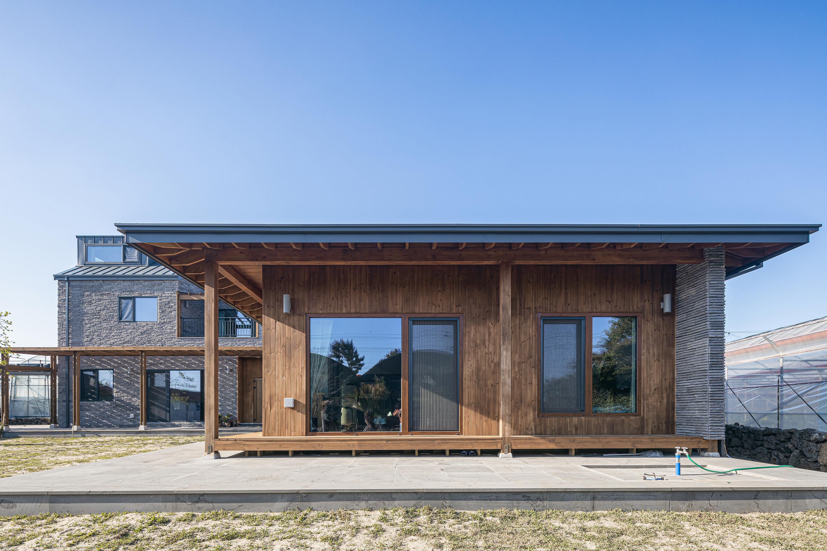 The client came to Seoul from Jeju Island when he was young, and now he has reached the age of retirement beyond middle age, returning to the place where he was born and raised again, off the coast of Seogwipo, and behind Hallasan Mountain to build a house with his mother and father. It was named ‘Jehoga’ after the owner's name, ‘Jaeho.’ His parents are not the only ones waiting for him who went up to Seoul a long time ago. The house with memories, the nutmeg tree he rode when he was young, became a magnificent folding screen, and the tangerine trees my father used to take care of, stone walls, the path he walked on to school, and the house was old, but the trees grew up well and became great arms to embrace a new family. Many things there remained the same. As such, I wanted to protect the memories that his family had made together and many of them. In addition, the space for the family did not necessarily have to be new. In particular, the warehouse building on the left side of the site built by the owner's father was not bad in location, and the interior timber frame was quite impressive. Therefore, it was actively recommended to use it as a workplace or cafe in the future, and it was reflected in the deployment plan. The client, wife, father, mother, and son who can be together. It must be a family, but everyone has lived in different spaces for decades. Of course, the most important thing is the space to be with each other, but now the space that you like and need is inevitably different. Composition of internal and external spaces for each member of the family was also essential. An old house site and basalt that my father had been guarding for a long time. Basically, after securing a pleasant living environment, I wanted to protect the existing and familiar things as much as possible. The materials in the house stained with hands, the tangerine trees that always appeared over the window when I woke up, and the windowsill was lowered so that you could see them even if you were older, and a Toenmaru was also prepared under the warm sunken rafters. However, using some internal materials as they are was not realized by disagreement with the contractor. So, for now, the location of the parent's consent was maintained. The eldest son of the head family and the eldest daughter-in-law, the head of the owner couple Hyun's family, and a separate ritual room for various family events for the eldest daughter-in-law and a sufficient size water kitchen were requested. In particular, it is a good thing for a father and son to live together, but since they have lived apart from their son for a long time, appropriate spatial separation was also needed. Therefore, the parents' building was set up as a separate house in the existing house location and connected to the kitchen of the main building with a corridor of communication. It planned an outer space for the owner, an outer space connected to the water kitchen, and a tangerine tree yard for small things to be used as a greenhouse in the future. For privacy, the space for the son who will live together is composed of a studio on the right and east sides of the second floor, and a separate entrance and exit route are prepared. It is a house where not only family members but also people can gather for family events such as ancestral rites, and usually there is an outside space for each father, son, daughter-in-law and grandson, so they can live their own lives. As such, the old and the new seem to have no choice but to coexist.