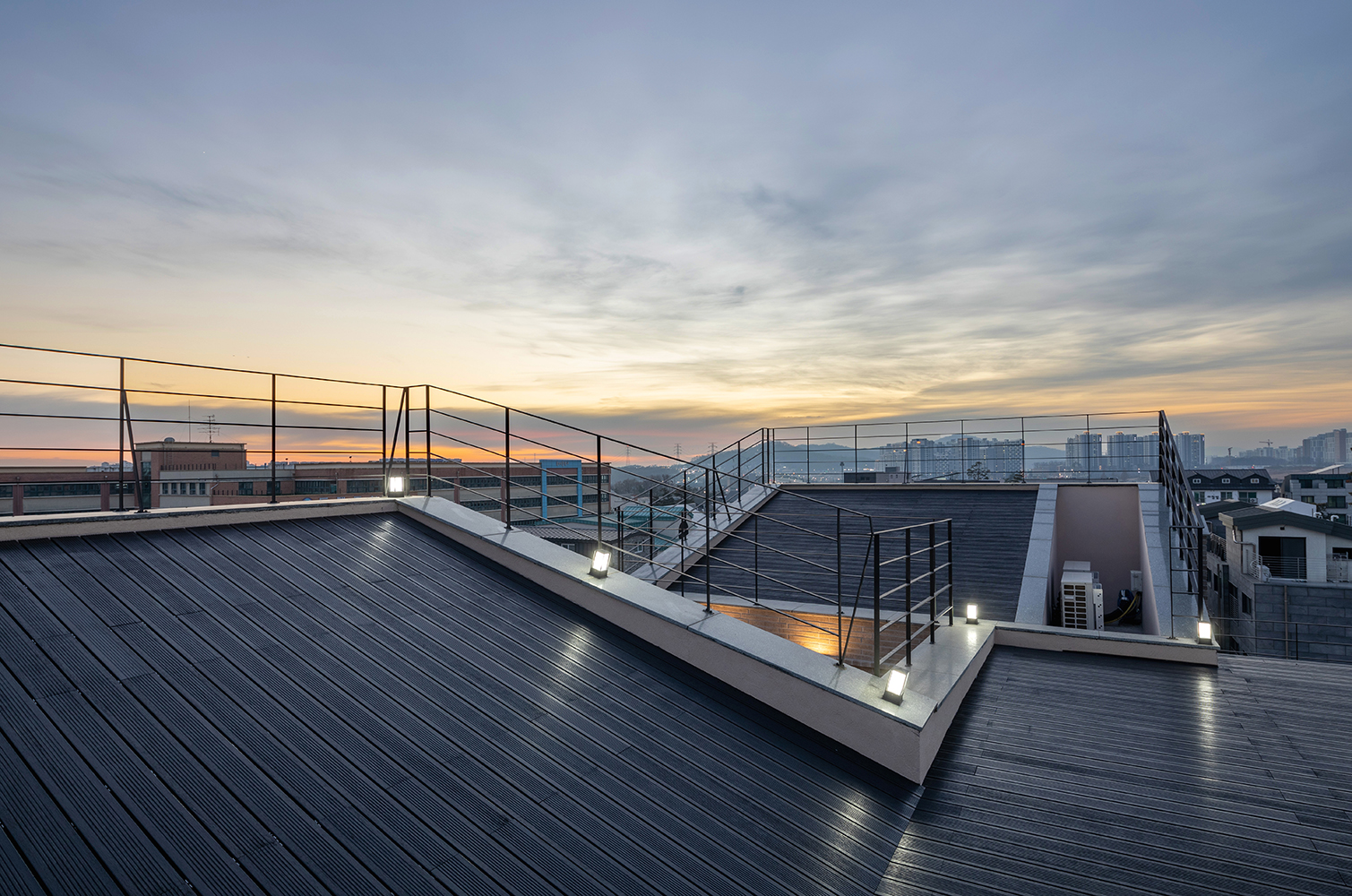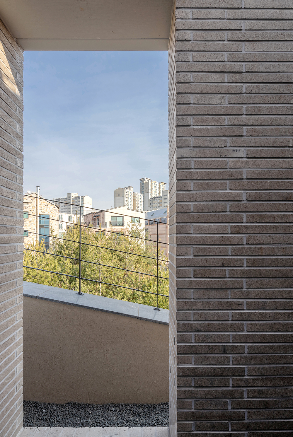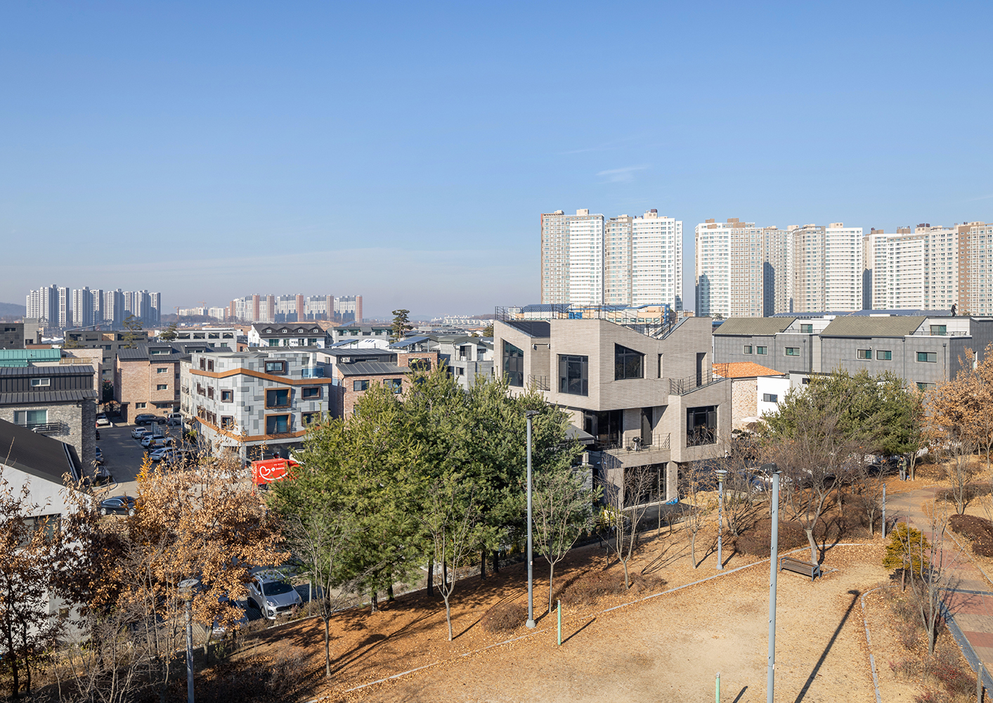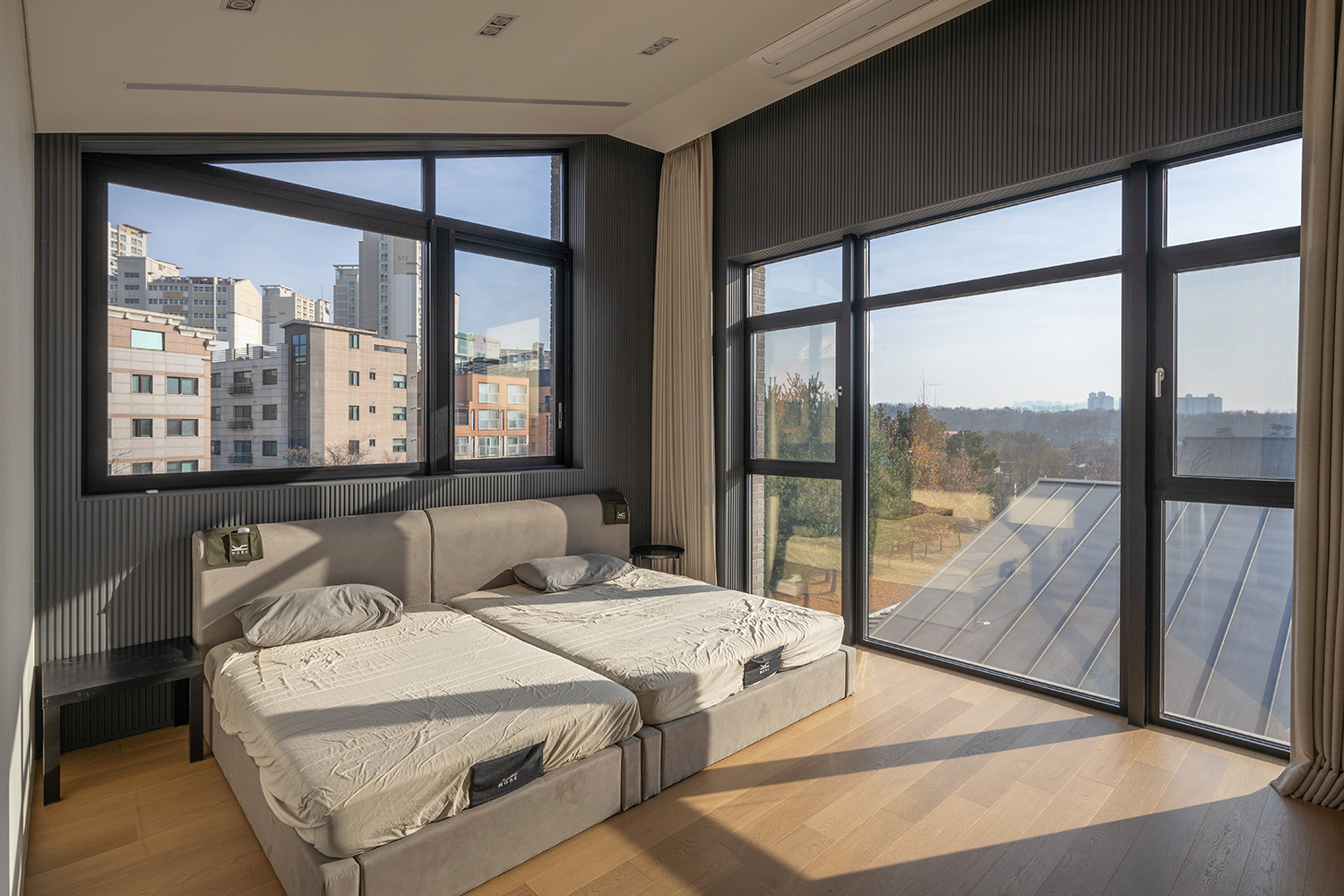 The bedrooms of each member are distributed on each floor to secure the position of an independent individual space, and the living room and the kitchen, shared by the family, were also made to have an independent structure. Each bedroom has a separate toilet, so that they may live independently. In addition, considering the fact that the size of the interior space cannot help being limited, a window was planned to visually bring in the natural and urban exterior space surrounding the site.