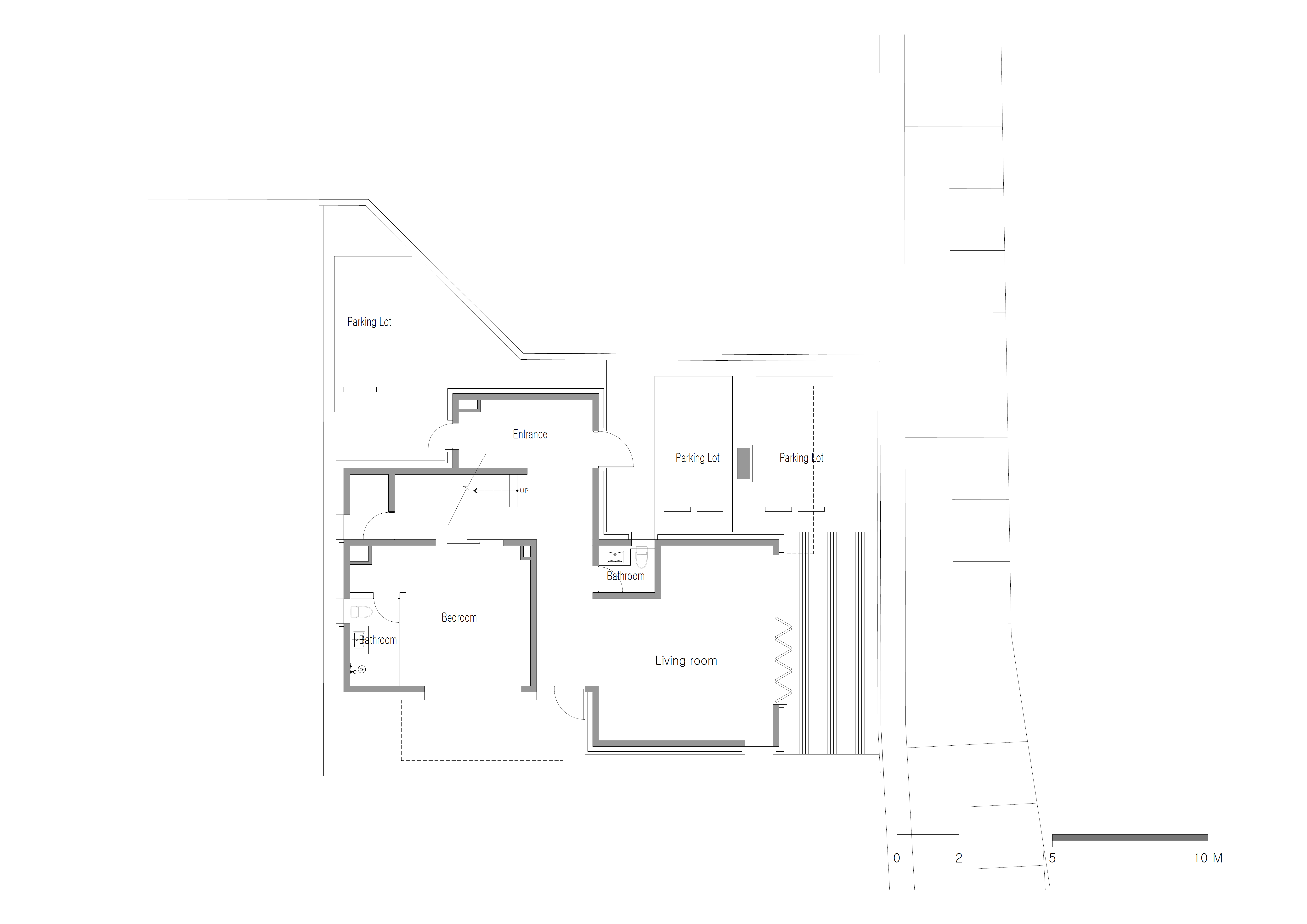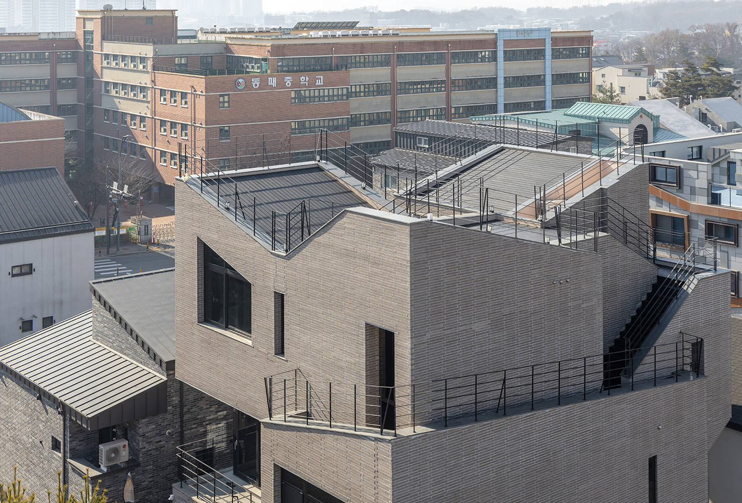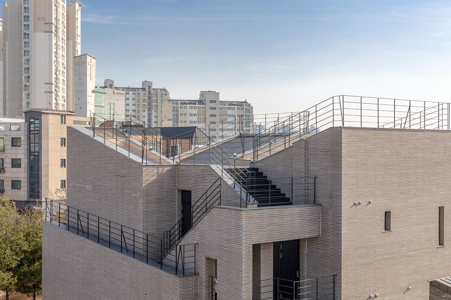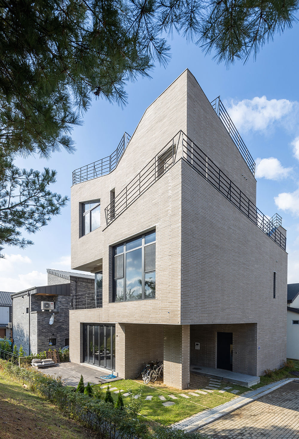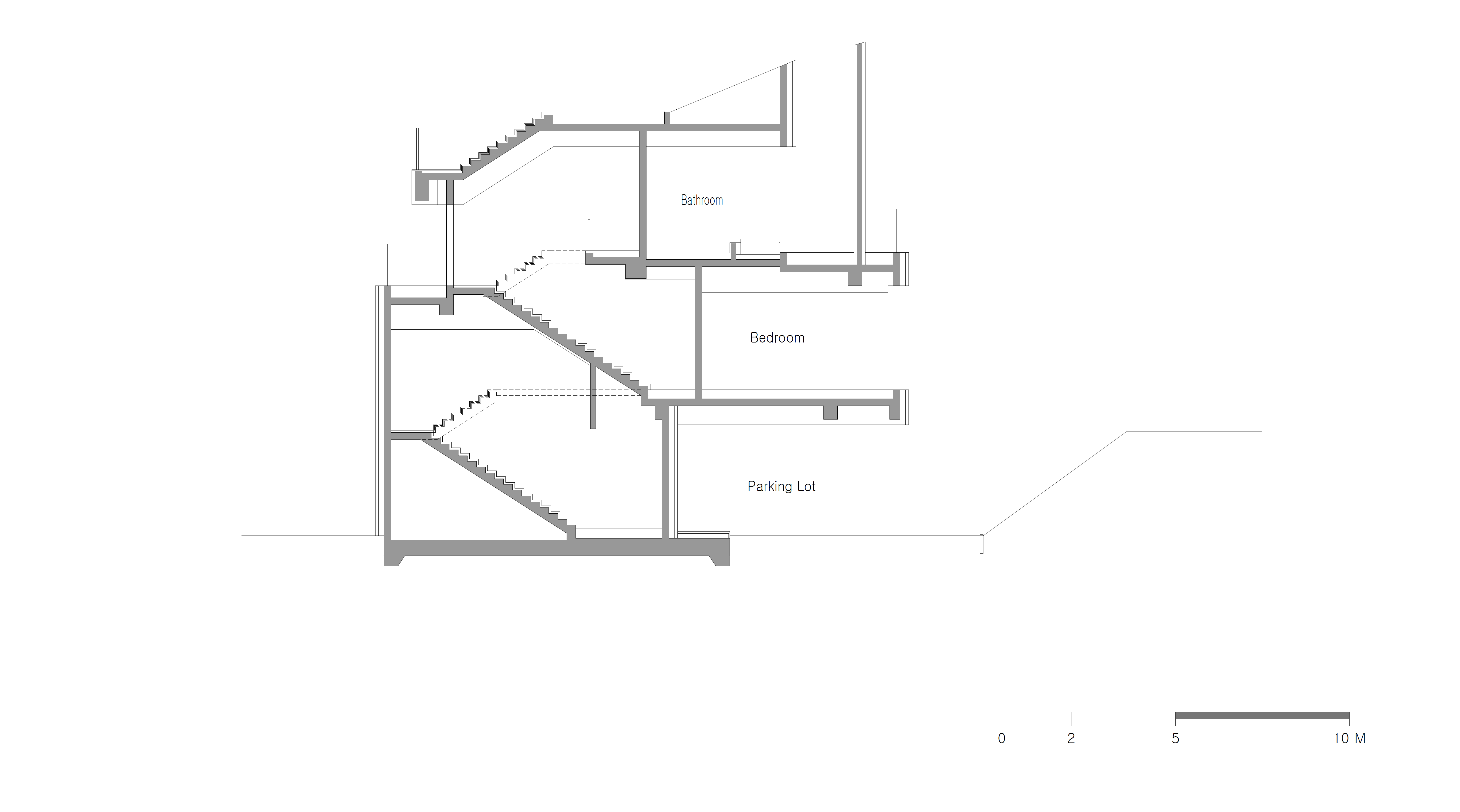 The bedrooms of each member are distributed on each floor to secure the position of an independent individual space, and the living room and the kitchen, shared by the family, were also made to have an independent structure. Each bedroom has a separate toilet, so that they may live independently. In addition, considering the fact that the size of the interior space cannot help being limited, a window was planned to visually bring in the natural and urban exterior space surrounding the site.