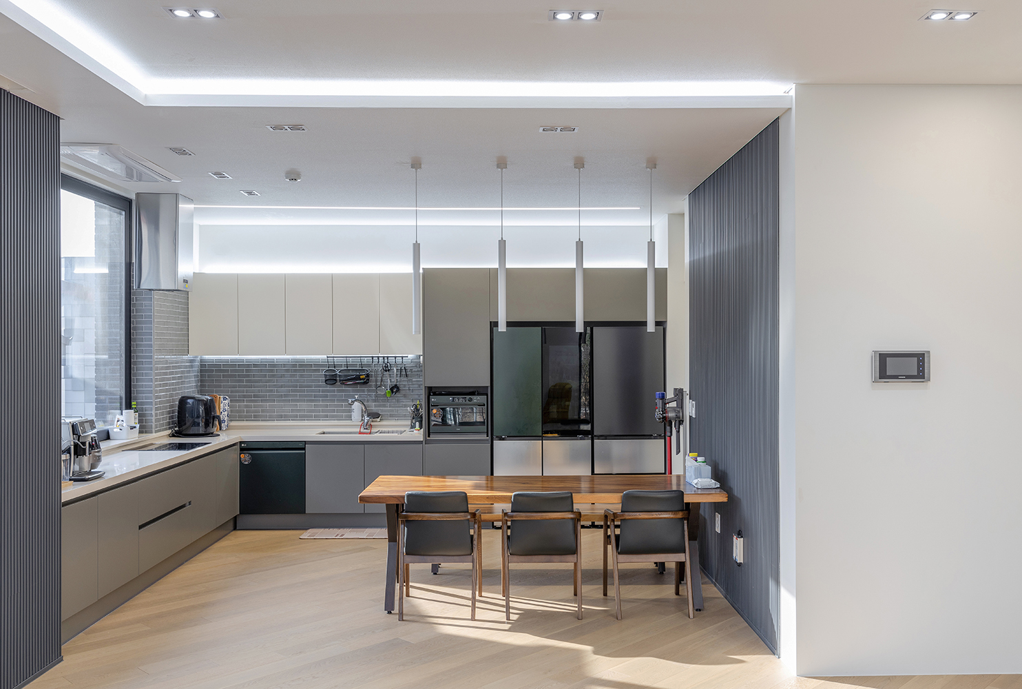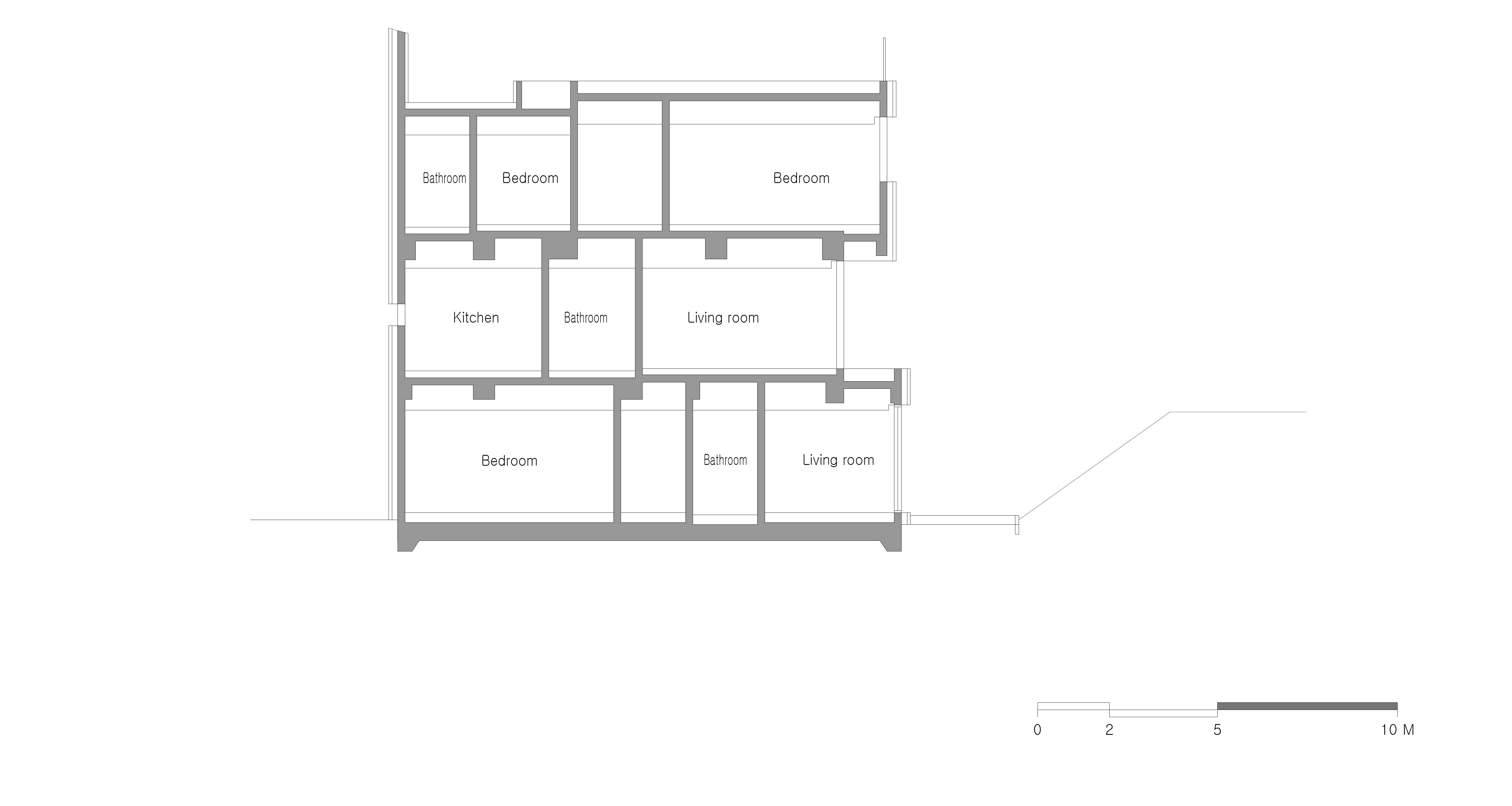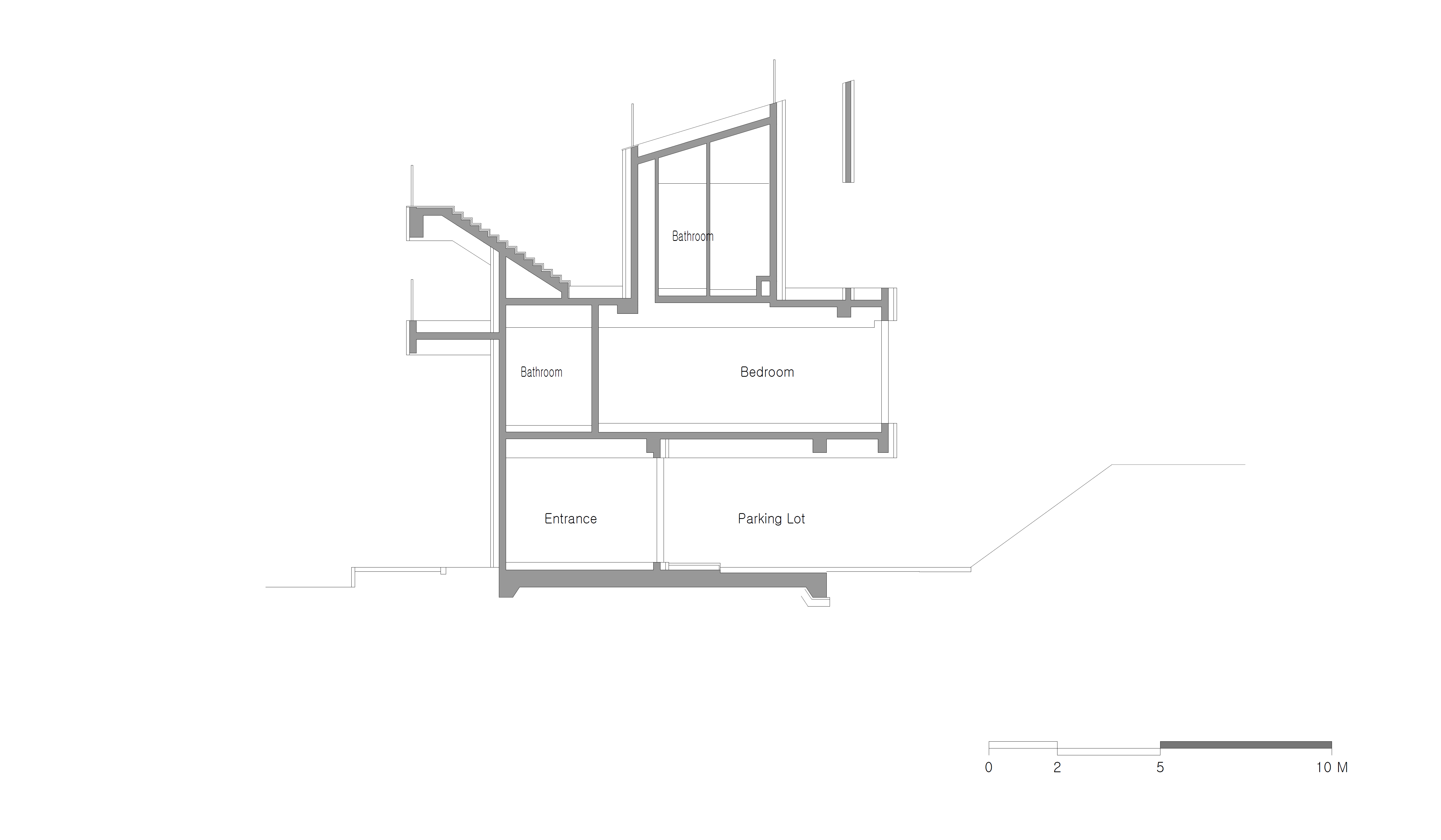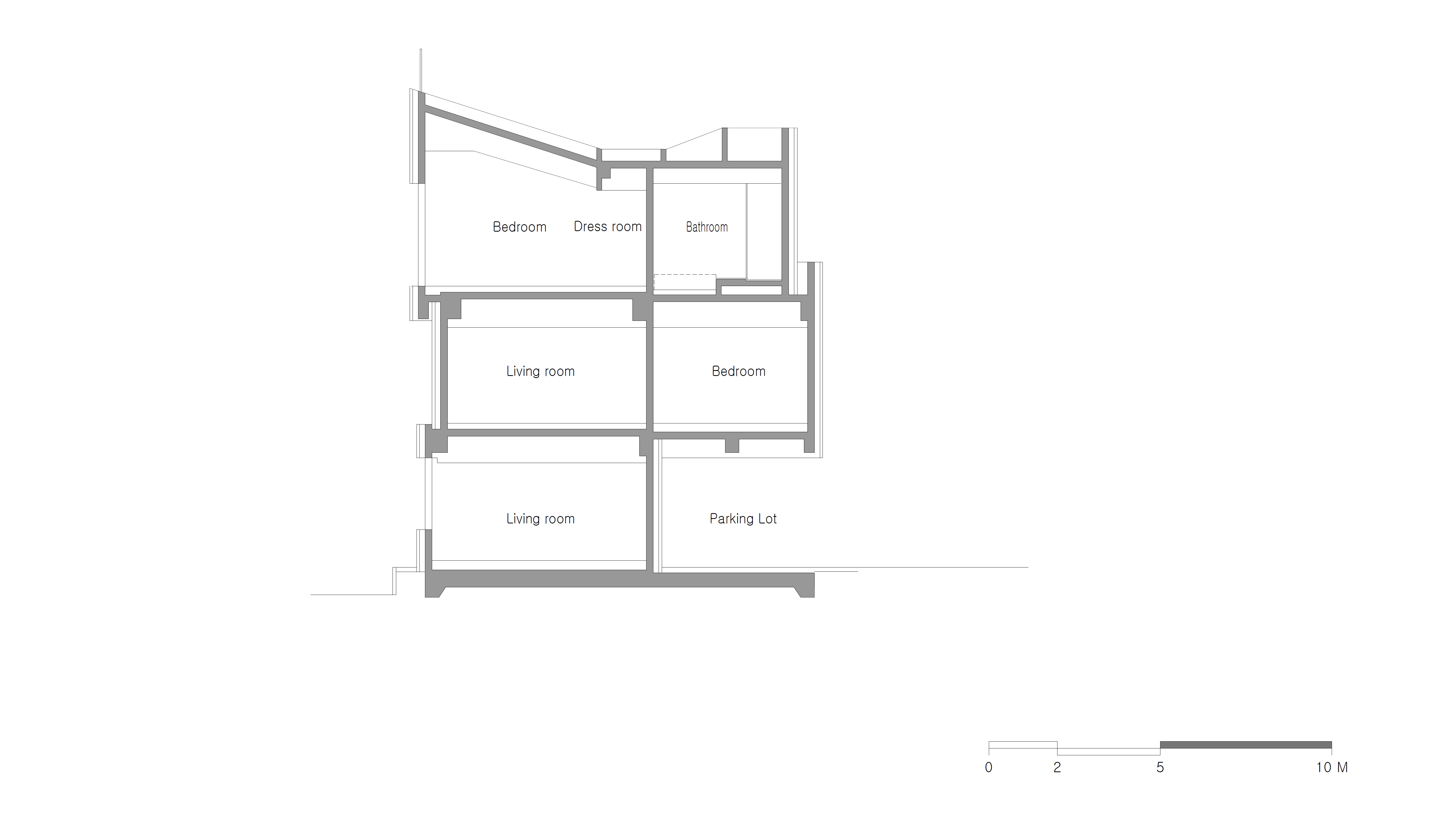The bedrooms of each member are distributed on each floor to secure the position of an independent individual space, and the living room and the kitchen, shared by the family, were also made to have an independent structure. Each bedroom has a separate toilet, so that they may live independently. In addition, considering the fact that the size of the interior space cannot help being limited, a window was planned to visually bring in the natural and urban exterior space surrounding the site.