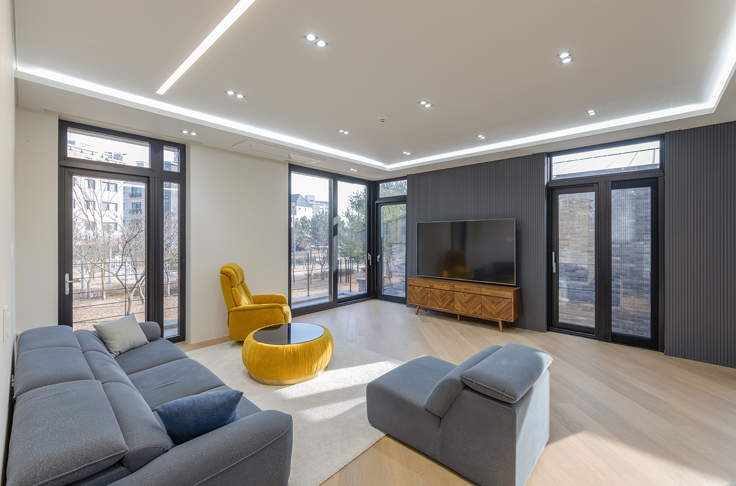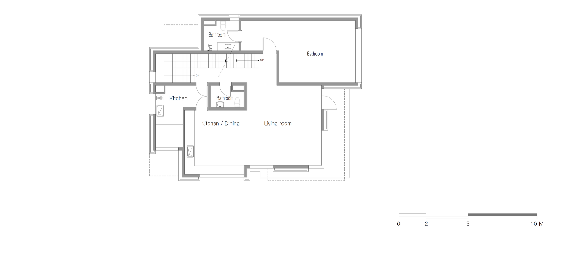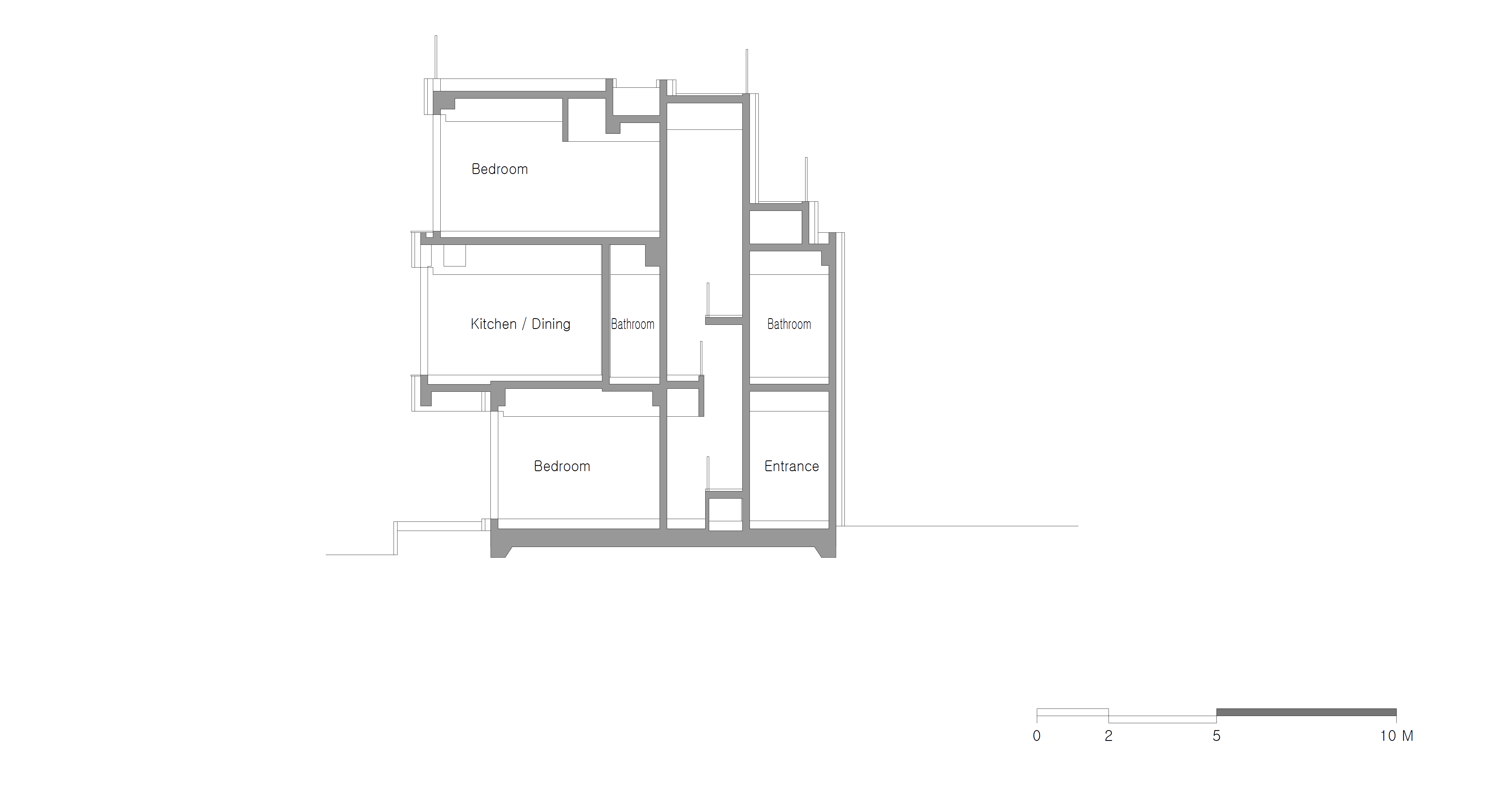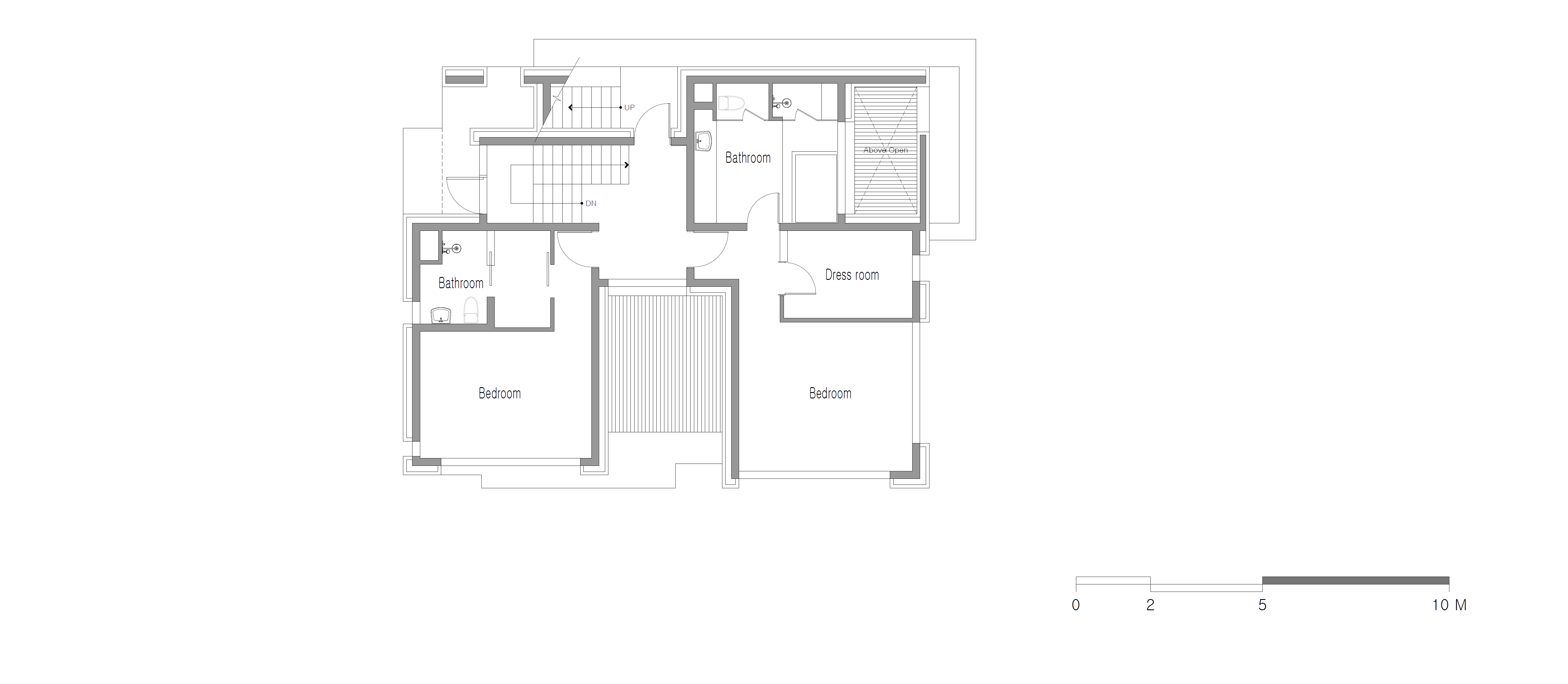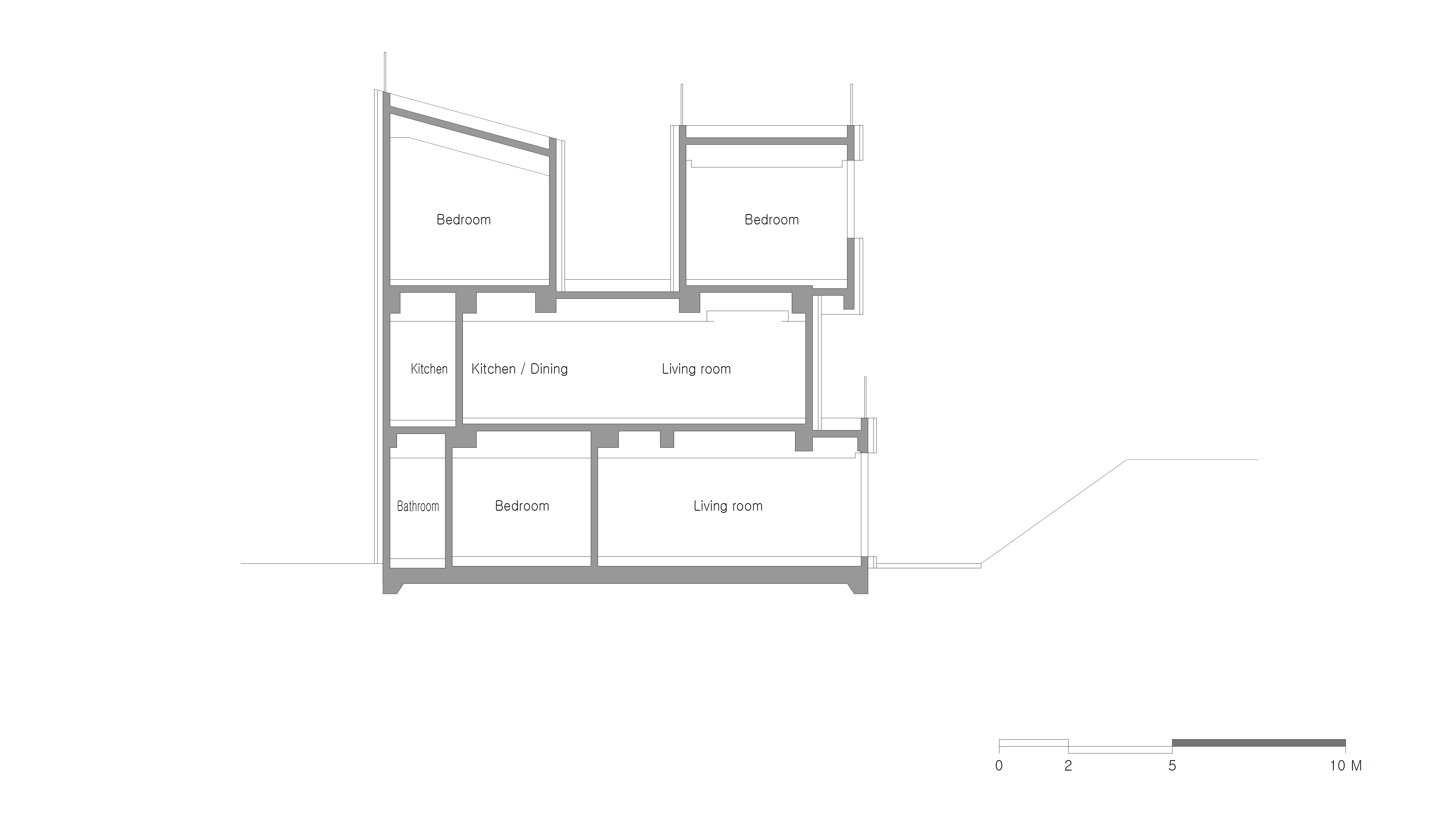 가족 구성원의 침실들은 층별로 분산되어 독립적인 개별공간의 위치를 확보하고, 가족이 공유하는 거실 주방도 독립적인 구조를 가진다. 각 침실에는 개별적인 화장실이 구성되어 있어 독립적으로 생활이 가능한 구조를 가지고 있다. 또한, 집 주변 자연과 도시의 외부공간을 시각적으로 내부로 들여오는 창들이 공간을 더욱 넓어보이게 한다.