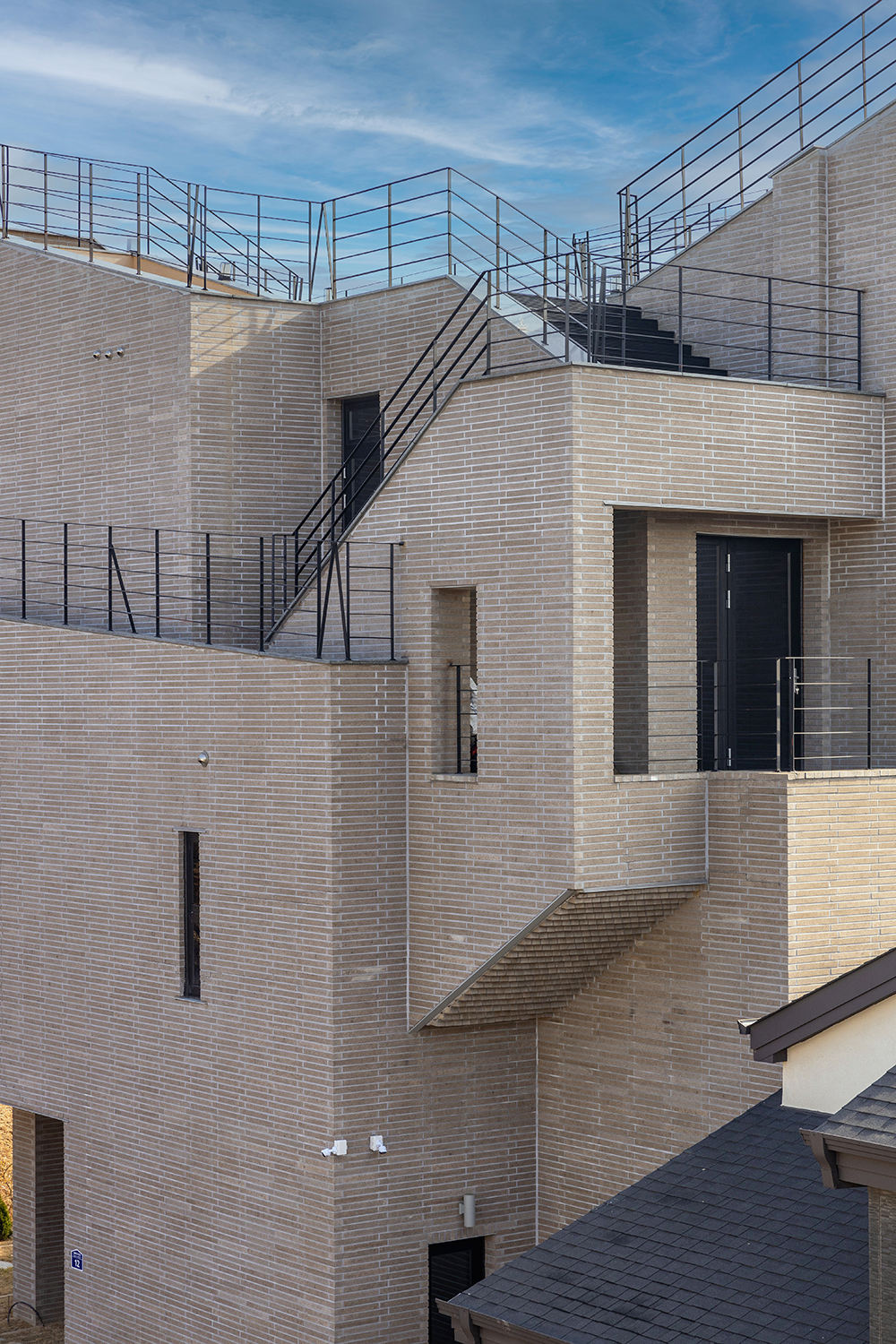 The longer the time spent at home becomes, the greater the requirements for external space will become naturally. Since the external space cannot be physically contained in the small-size site, the yard from a traditional concept was designed to be replaced with the balcony space prepared on the upper part of roofs and on each floor. Each balcony space is intended to be attached to the commonly-used space and to have the character as an expanded common-use space. In addition, by arranging windows so that the scenery of the park located on the east side of the site can be seen from the inside, it was intended to have the effect of expanding the space even if the client’s family might stay inside only. In terms of materials, bricks were utilized as a main material, since they could firmly hold its shape even while the time is accumulated with the client and this house and could contain the trace of years as stained more as time goes by. By using the roof gradient defined in the city planning, the shape of each space was made to be exposed to the outside to give visual properties, and the slope of the roof becomes the slope of the interior space to create a rich space.
