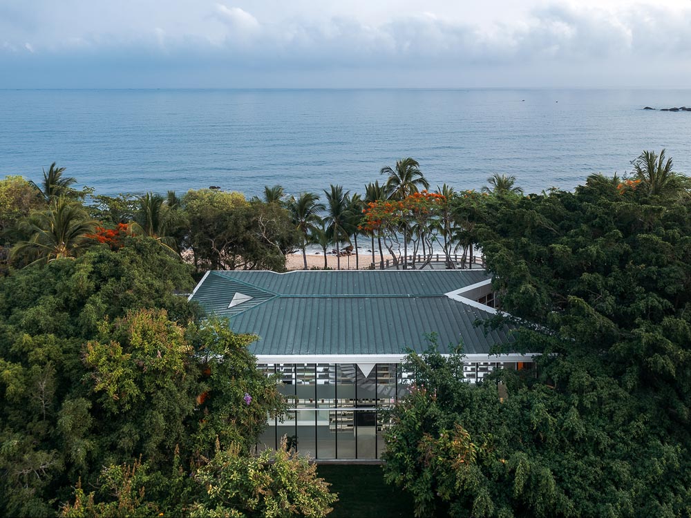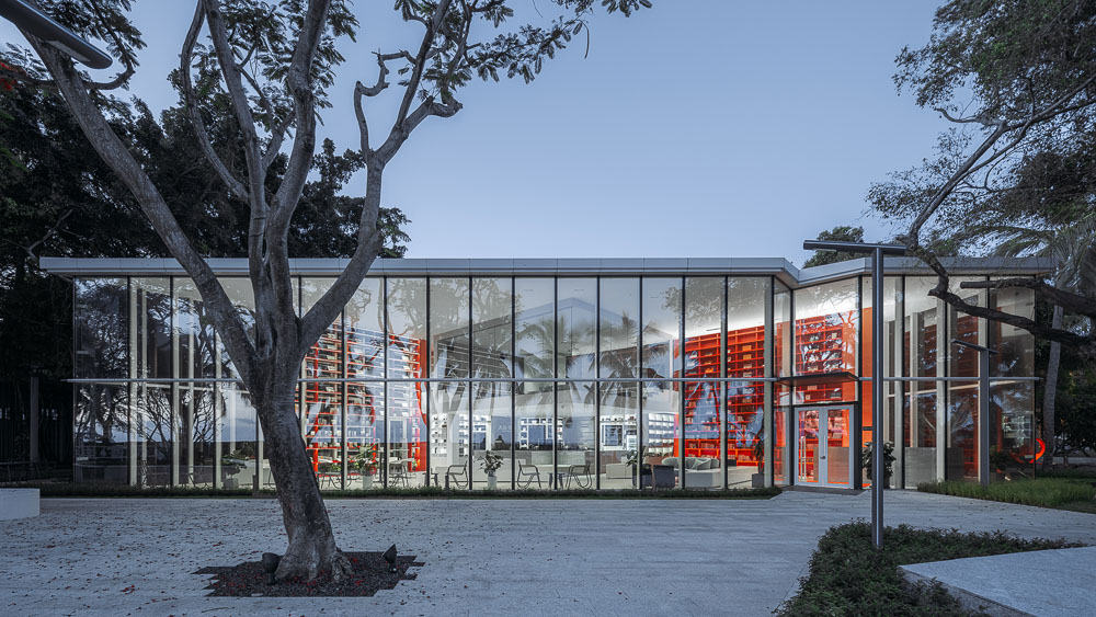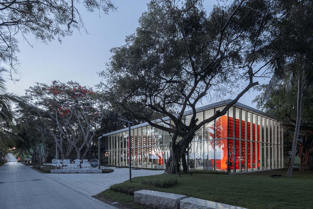 Tianya Books is the southernmost bookstore in China in terms of geographical latitude. The client and I coincidentally didn’t choose a site that left the bookstore alone on the beach, but in the woods closest to the beach. The original design was a purely transparent glass box. Because abstract geometry as a creation of human ideas can be contrasted with the richness and diversity of nature. This purity is reflected in many of my designs that incorporate natural landscapes. But a huge banyan tree on site created a little difficulty first. I had to cut a triangle on the short side of the original rectangular bookstore to preserve the banyan tree, while the 27-meter length of the sea-facing facade was also preserved.