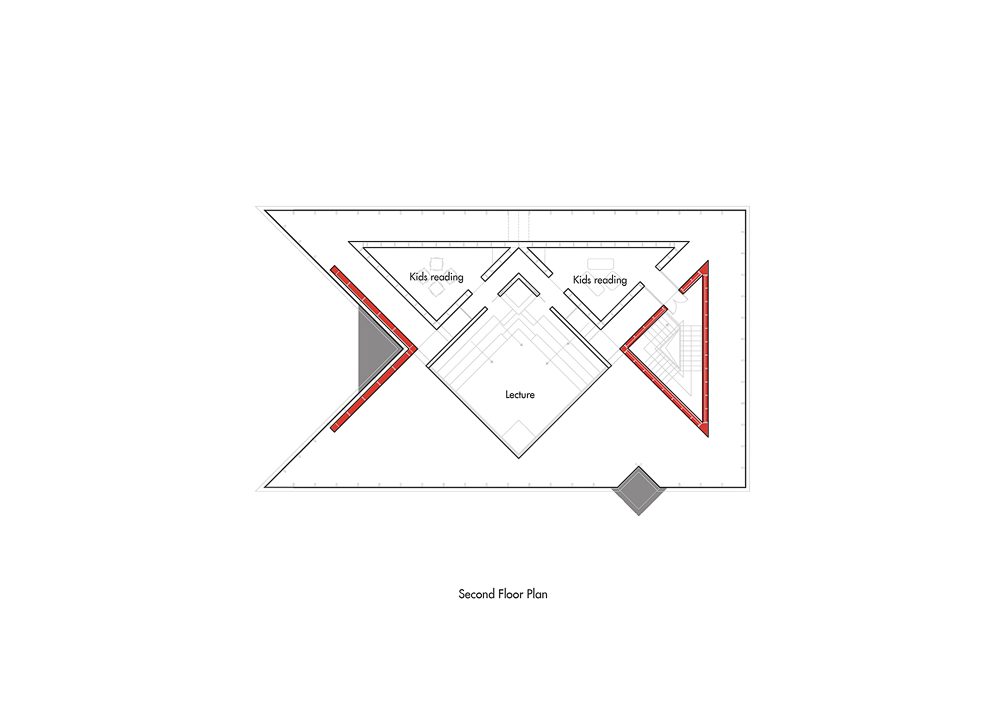 The function of the Tianya books is cafe, lecture and bookstore. The bookstore is divided into a general reading area and a children’s reading area. These functions need to be arranged in layers. The architects placed the children’s reading area and the lecture area on the second floor, which also compensates for the loss of area due to the preservation of the banyan tree. To ensure the continuity of the glass box around the perimeter. This partial second floor was to be completely disconnected from the facade to create a house within house type of space. The architects chose a triangular shape for the staircase and second floor plan and echoed the triangular outdoor space on the west side formed to preserve the Ficus tree.