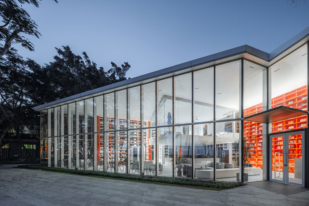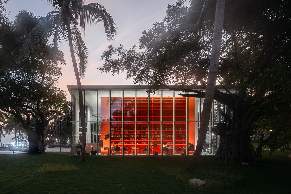 텐야 북스는 중국 최남단에 바닷가와 가까운 숲 속에 세워진 서점이다. 건축가는 설계 초기 단계에서 자연의 모습과는 대조되는 단순한 투명한 유리 상자의 서점 공간을 구상하고 있었지만, 결국 자연경관을 반영한 이곳만의 특별한 형태를 만들어 냈다. 현장에는 거대한 반얀 나무가 있었는데, 이 나무를 보존하기 위해 원래 직사각형 서점의 짧은 면에 삼각형을 잘라야 했고, 바다를 마주한 27m 길이의 입면 파사드는 유지되며 지금의 평면 형태를 가지게 됐다.