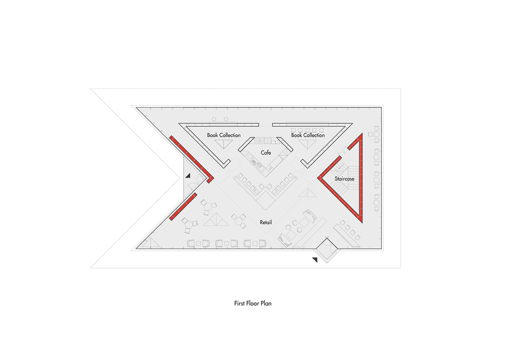 실내의 삼각형이 서점의 모티브가 됐다. 진열대와 계단실, 테이블, 카페의 주문 제작된 책상, 의자들은 각기 다른 크기로 인간의 생각과 감정의 풍부함과 날카로움을 표현하도록 돕는다. 강당 무대의 대각선에 작은 높이의 플랫폼이 있다. 플랫폼에 의자를 놓고 안에 앉아 마치 바다에 있는 것처럼 발아래 바닥을 바라볼 수 있어 물리적인 경계를 허물고 세상을 상상할 수 있다. 서점 전체의 중심은 강의실 무대다.