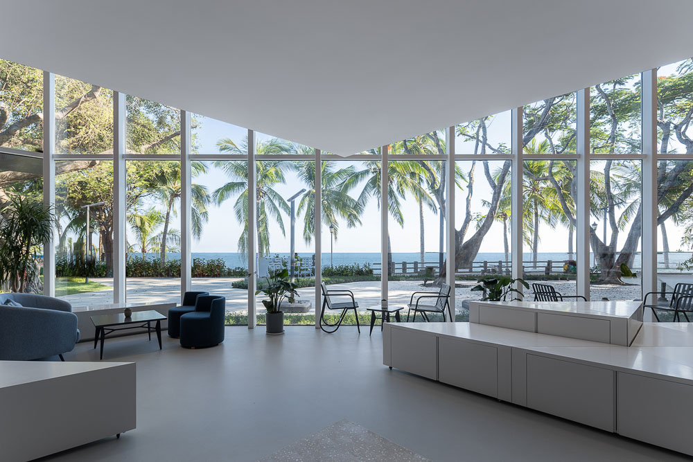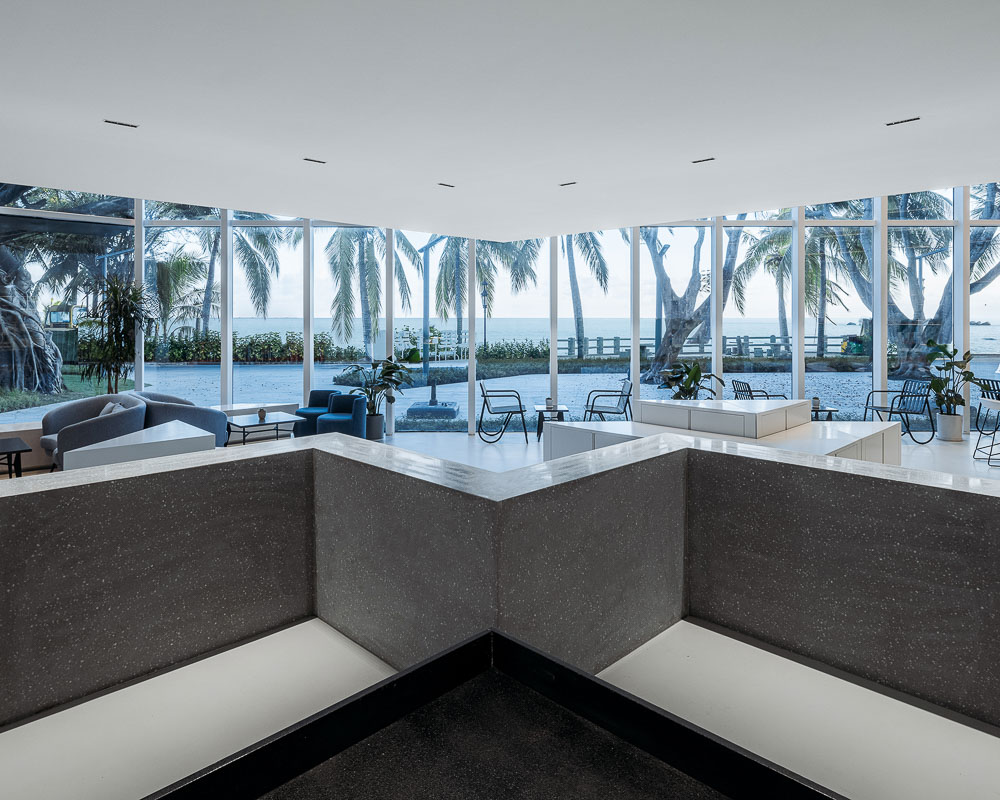 The glass on the facade seems to be fragile before a storm, and then seems to be non-existent when the sky is clear, and this fragile and changing feeling expresses exactly the kind of mood I feel when facing the sea. The ubiquitous triangle in the interior has become the motif of the bookstore. The exhibition hall, staircase hall, retail tables, cafe bar, custom-made book tables and seats form right angles of different sizes vying to point towards the sea, they express the richness and sharpness of human thoughts and feelings, and finally stop in front of the glass, echoing the sea that stops outside in front of the glass.