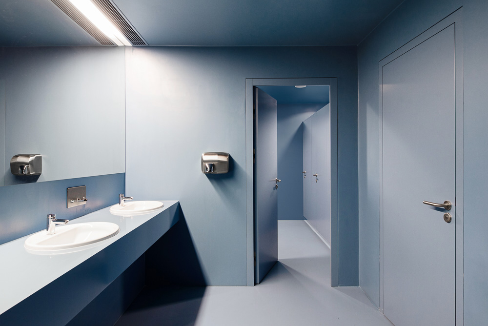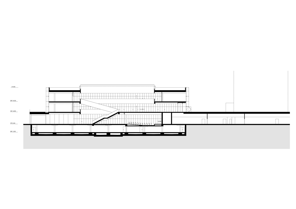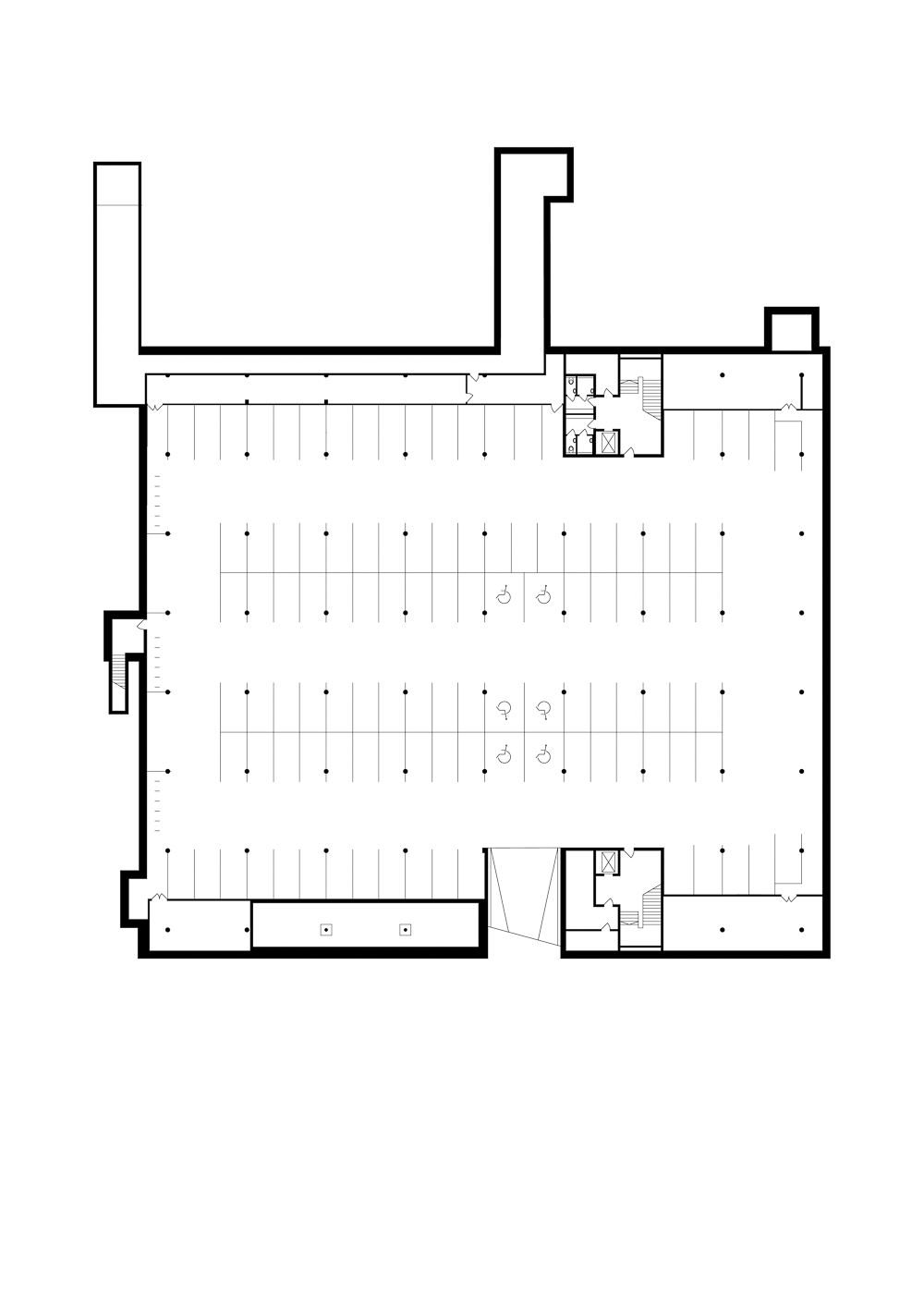 The conversion project preservers the external shape, height and proportions of the original canteen building. The main intervention is the creation of a generous central hall, illuminated from above, with daylight coming in between the trusses of the skylights. The hall is the heart and the social center of the faculty which spatially connects all three floors of the building. The entrance, located on the level of a raised plateau, enables a simple connection of all floors by two differently shaped one-flight staircases. Cantilevered galleries along the perimeter of the hall provide access to seminar rooms, teachers’ offices and two lifts with fire escape staircases. The lowest level of the hall accommodates large common lecture halls, auditorium, faculty’s library and the deanery.