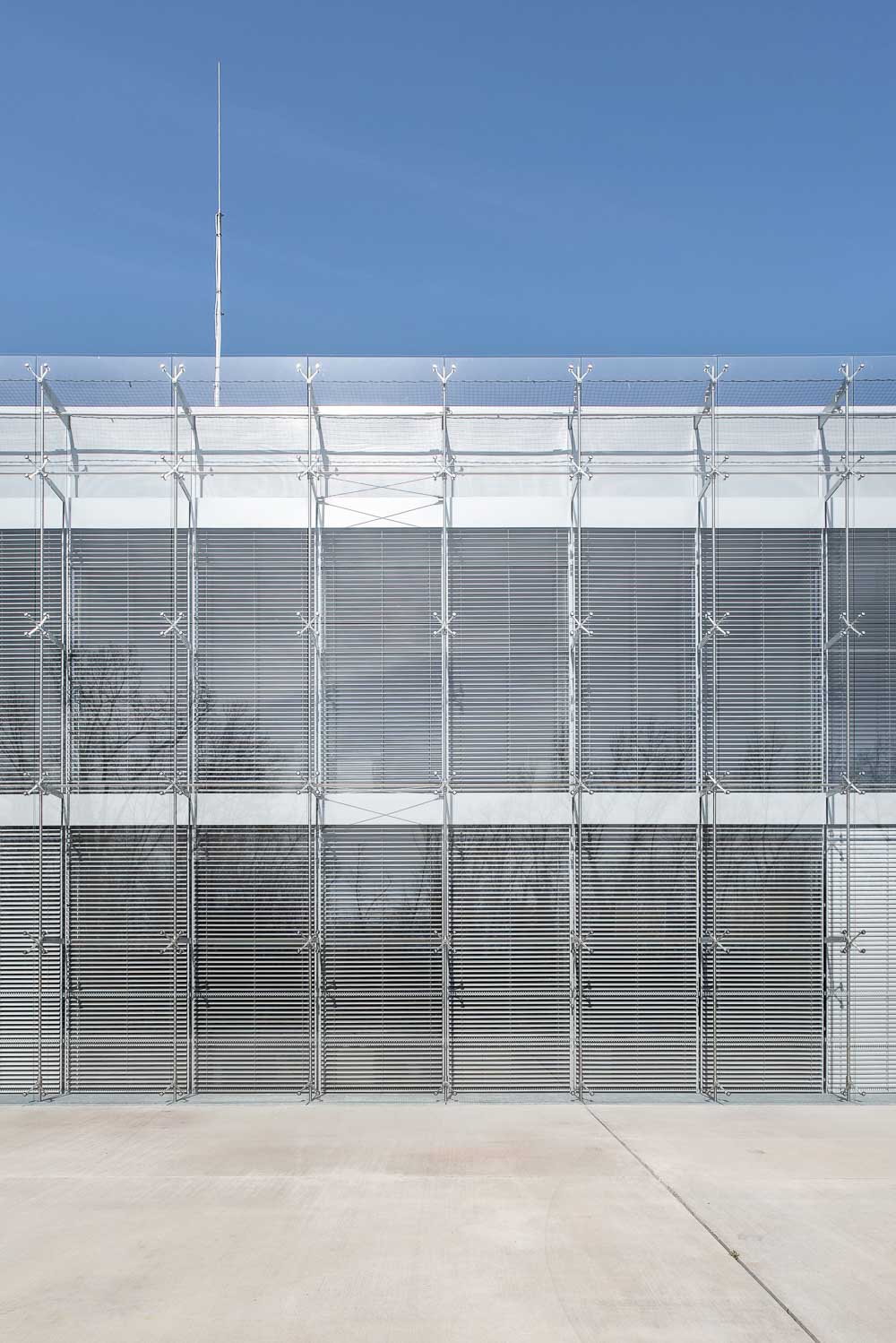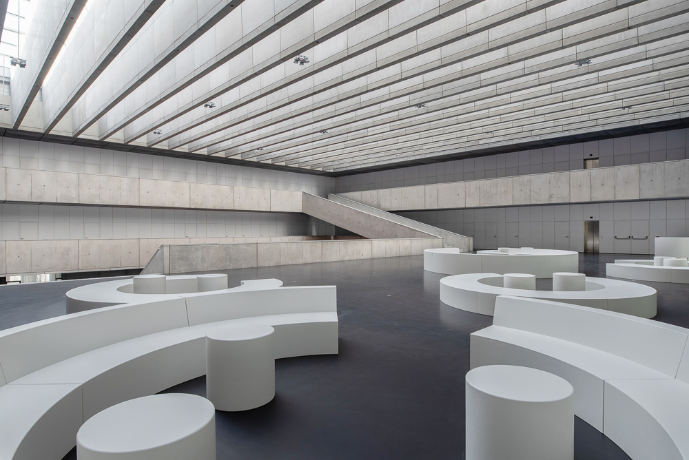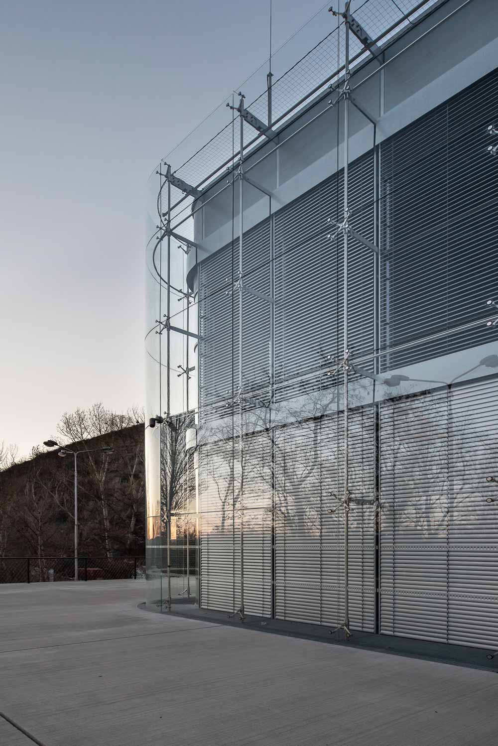 내부는 노출 콘크리트와 고급 금속 메쉬 천장, 검은색 스크리드 바닥으로 마감했으며, 흰색 목재 가구와 조형물이 주로 사용됐으며, 다양한 형태의 주황색 의자가 홀 공간을 채우고 있다. 외부를 감싼 유리는 건물 바로 옆에 있는 6차선 순환 도로에서 오는 소음을 막기 위해 사용되었다. 이중 스킨 파사드는 자연 환기와 실내 공간의 차양을 조절해준다. 둥글게 처리된 유리의 모서리는 원래 건물과 연결된다.