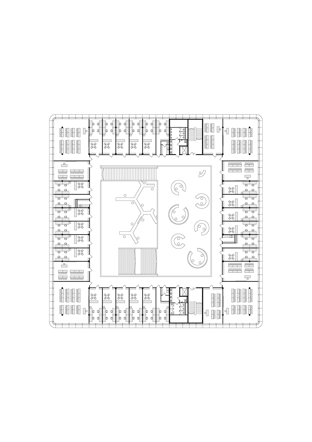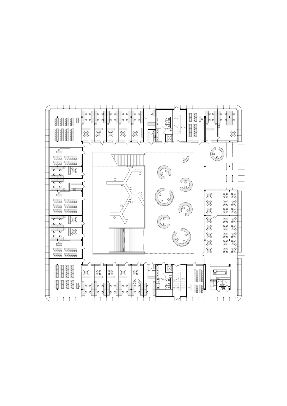The original canteen and dormitory buildings by the architect Karel Prager are only the torso of an unfinished university campus on the banks of the Vltava River. The canteen itself was never fully used as intended. The 1980s building, built using a demanding lift-slab construction method with its deep central square disposition, had an indisputable architectural quality at the time of its construction. However, a radical change was necessary to accommodate new needs of the Faculty of Humanities.