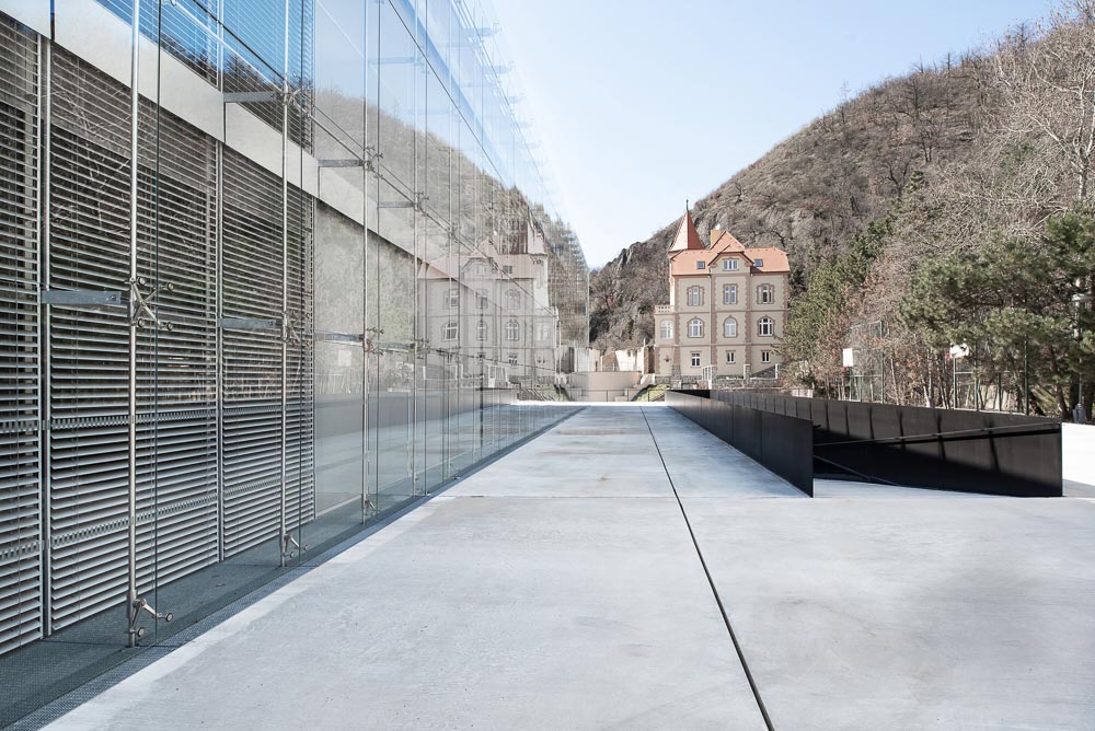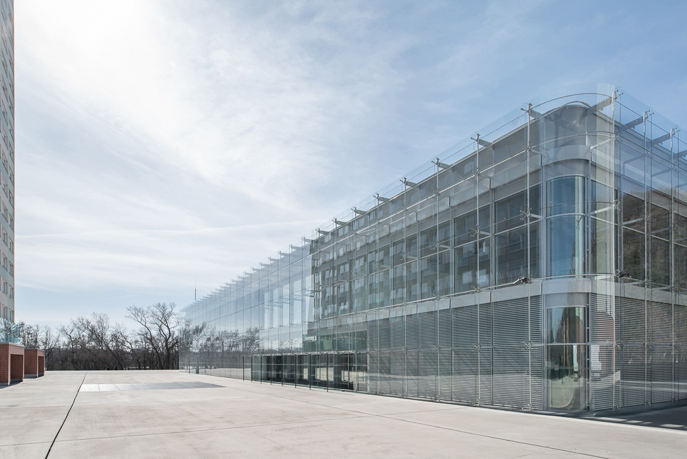 Prevailing materials in the interior are exposed concrete combined with a fine metal ceiling mesh, black floor screed and white wooden elements and furniture. The space is dominated by a variably set seating furniture in orange. The external structural glazing is designed primarily as an effective acoustic protection against the noise from a six-lane ring road in the immediate vicinity of the building. Double-skin facade allows for natural ventilation and regulated sun shading of the interior space. Rounded glass corners are a link to the original architecture.