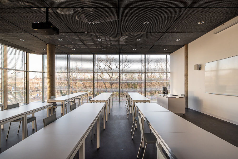 새로운 본관건물은 기존의 건물이었던 구내식당 건물의 외부 형태와 높이는 거의 그대로 유지됐다. 건축가들의 주된 작업은 채광창인 트러스 사이로 넓게 들어오는 빛을 이용하여 중앙 홀을 만드는 것이었다. 중앙 홀은 건물의 3개 층을 연결해 주는 곳으로, 교수진의 사교 공간이자 주된 활동 공간이다. 바닥이 올라온 것 같은 높이에 있는 입구를 통하면, 두 개의 다른 모양으로 된 단층 계단을 이용해 모든 층에 쉽게 접근할 수 있다. 홀 주변을 따라 있는 캔틸레버 화랑을 통해 세미나실, 교사 사무실과 비상계단이 있는 2개의 엘리베이터로 갈 수 있다. 홀의 가장 낮은 층에는 공용 대형 강당, 강당, 교수 도서관과 집무실이 있다.