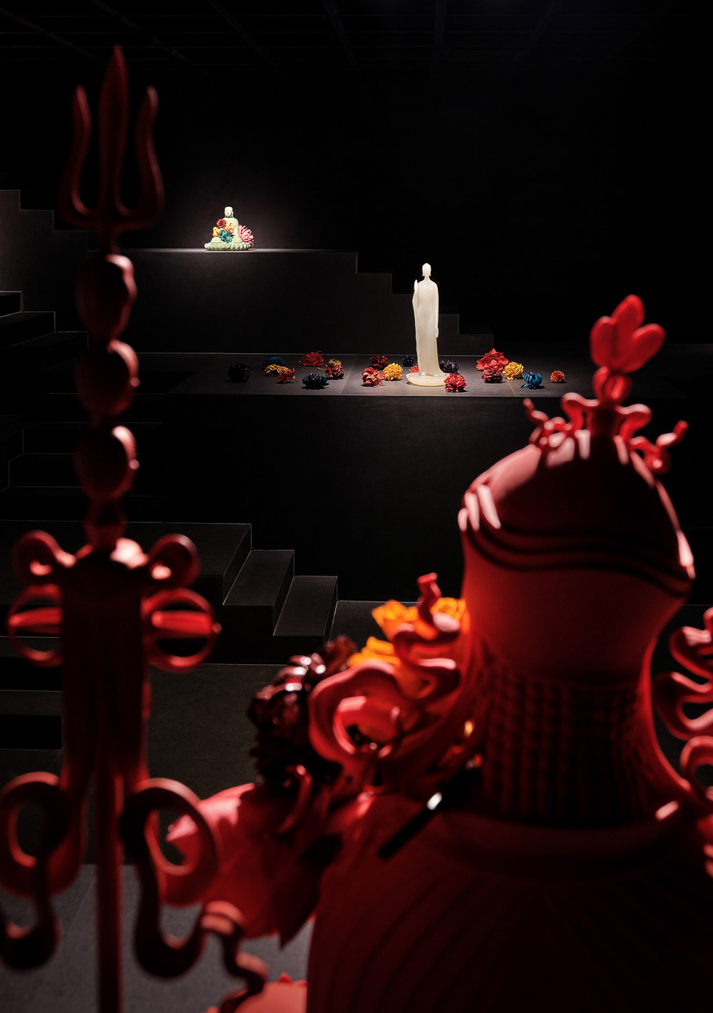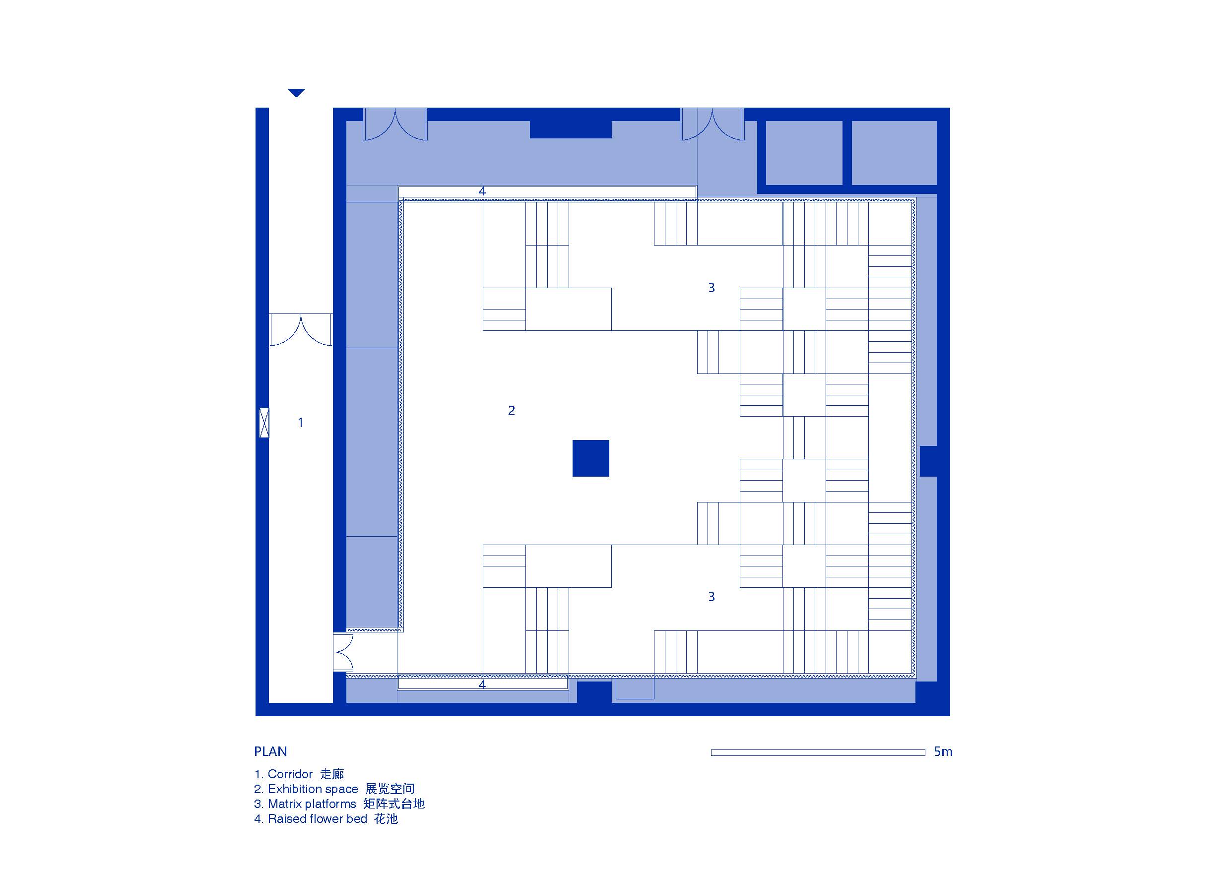 인도의 계단식 우물에서 영감을 받아 색상 속성과 장식 요소 없이 공간을 디자인하기로 결정했다. 단순한 기하학적 모양을 사용하여 주어진 면적에 계층화된 질서 감각을 만든다. 기복이 심한 지형과 허공만 있는 극적인 “빈 공간”이다. 매트릭스 플랫폼은 132개의 1m x 1m 입방 단위가 서로 겹쳐져 구성되어 있다. 공간의 높이를 최대한 활용하여 사람들이 거의 천장에 닿을 정도로 공간 끝부분에 계단을 올렸다. 전시물이 플랫폼에 자유롭게 배치될 수 있도록 공간에 단단한 칸막이를 설정하지 않았다. 방문객들은 조명과 배치된 불상을 통해 “유연하게” 안내된다. 기복이 있는 플랫폼 위를 관람객들이 자유롭게 걸을 때면 전시물과의 거리는 가깝기도 하고 멀기도 하고 전시물은 눈높이에 있기도 하고 고지대에 있기도 하다. 따라서 전시의 경로를 결정짓는 것은 관람객의 다양한 선호도일 것이다.