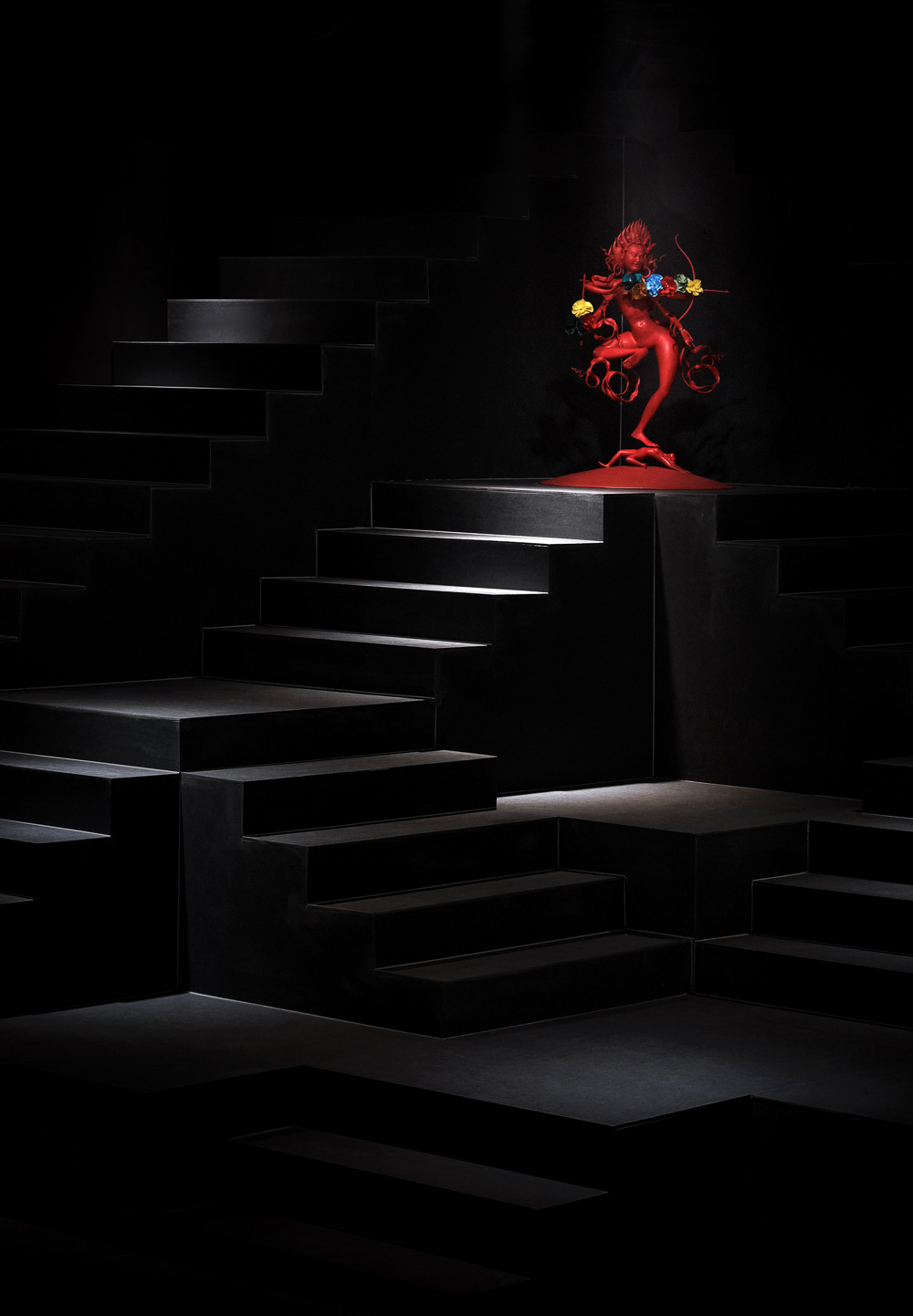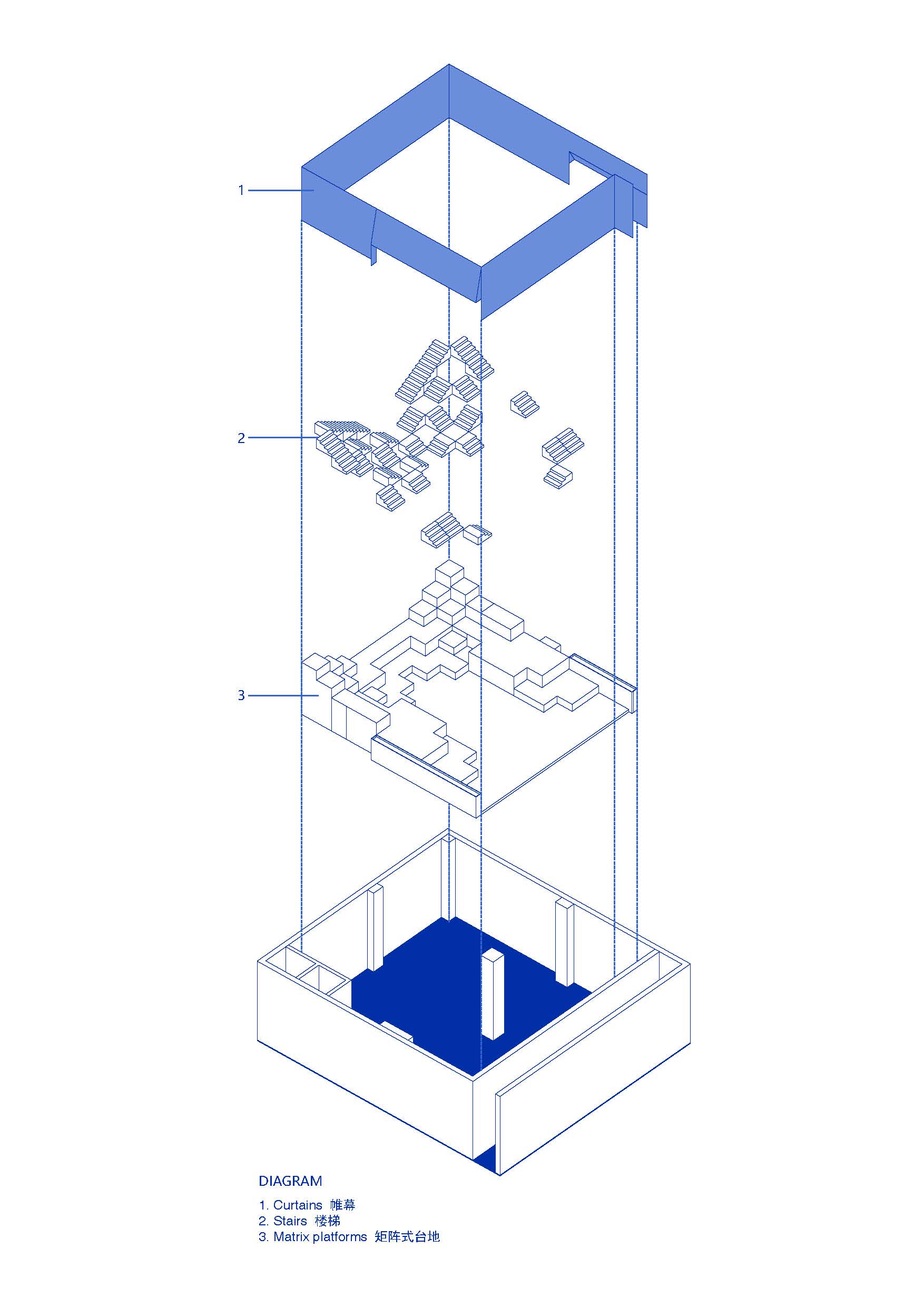 Inspired by the Indian stepwells, we decided to design the space without color attributes and decorative elements. Using simple geometric shapes to create a layered sense of order in the site - a dramatic "empty room" with only undulating topography and air. The matrix platforms consist of 132 1m x 1m cubic units stacked on top of each other. We raised the steps at the end of the space to the height where people almost touch the ceiling, making full use of the height of the space. We did not set any rigid partitions in the space, so that the exhibits can be freely placed on the platforms. The visitors are guided "flexibly" through the light and shade of the lights and the placed Buddha statues. When the visitors walk freely on the undulating platforms, the distance between them and the exhibits is sometimes close, sometimes far away, and the exhibits is sometimes at eye level, sometimes on the high ground. So, what really determines the route of the exhibition would be various preferences of different visitors.