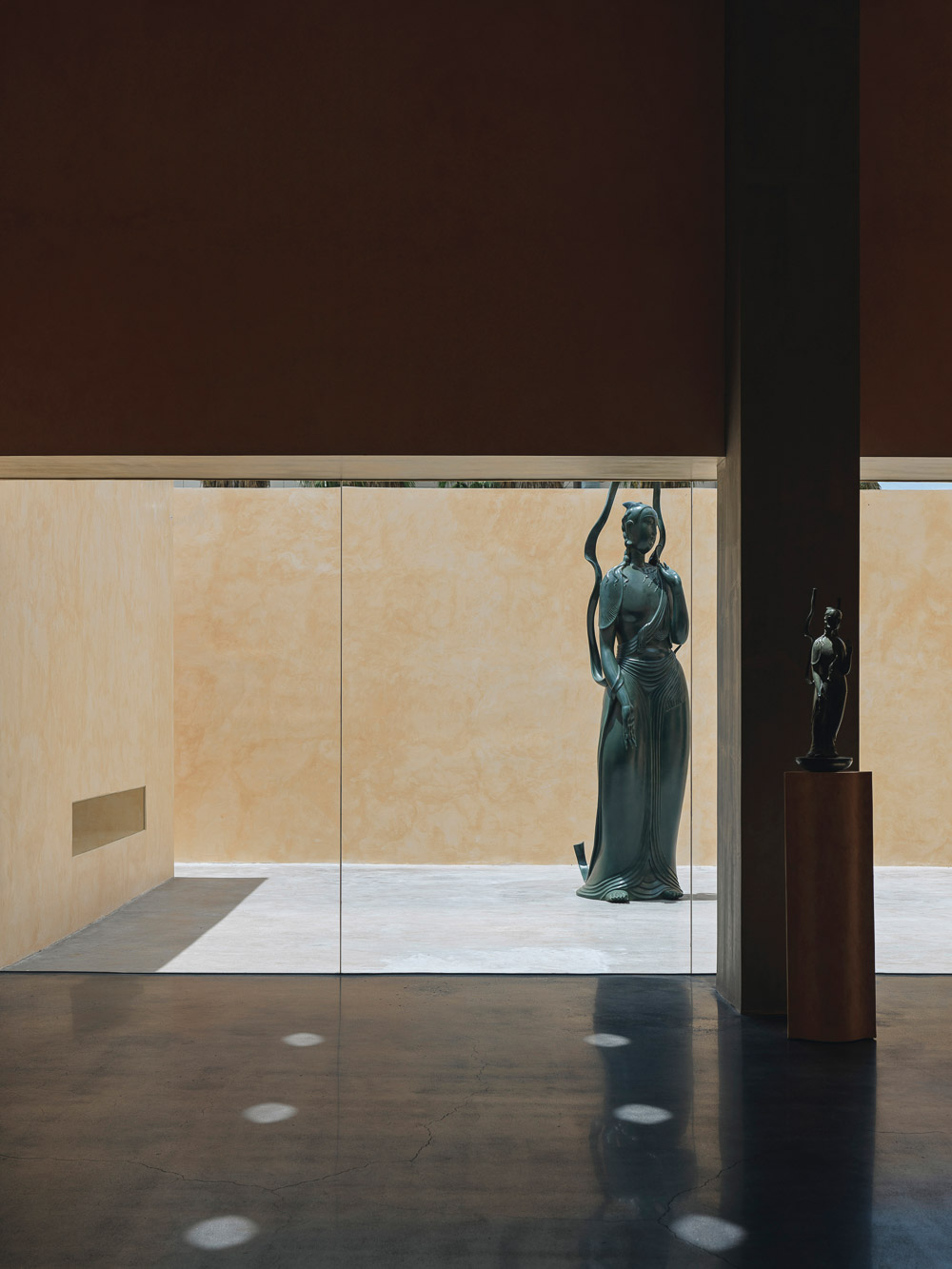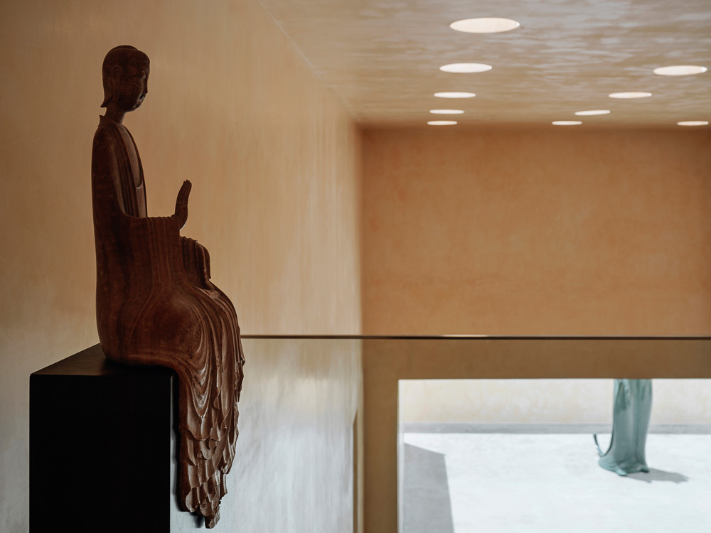 The one-story space connected to the south of the main hall is the “dark room”. We opened two square skylights of different sizes at the top of the dark room and a horizontal strip window at the bottom of one wall. Compared to the main hall, the light in the dark room is more diffuse and hazy, so the Buddha statues in the dark room are made of transparent materials such as glaze and jade. Under the reflection of light and shadow, the edges of the Buddha's image are blurred, sometimes resulting in a Zen state of "rainbowing".