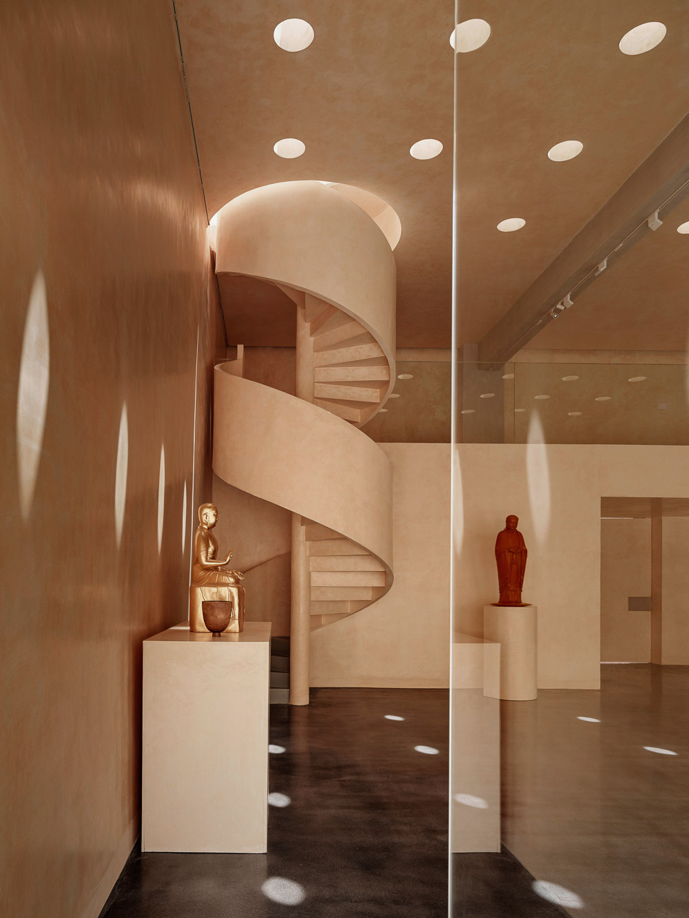 The entire building is connected as the "magnolia tree - Buddha statues and light - roof terrace - office space - fashion showroom - magnolia tree" route, forming a cyclical circulation in and out the building. The magnolia tree guides and speaks within the circulation, which is both the start and the end of it.