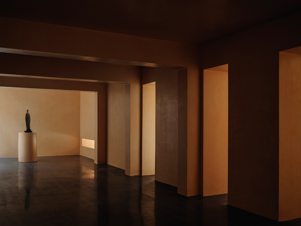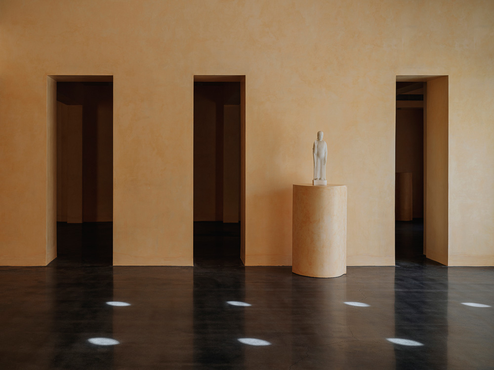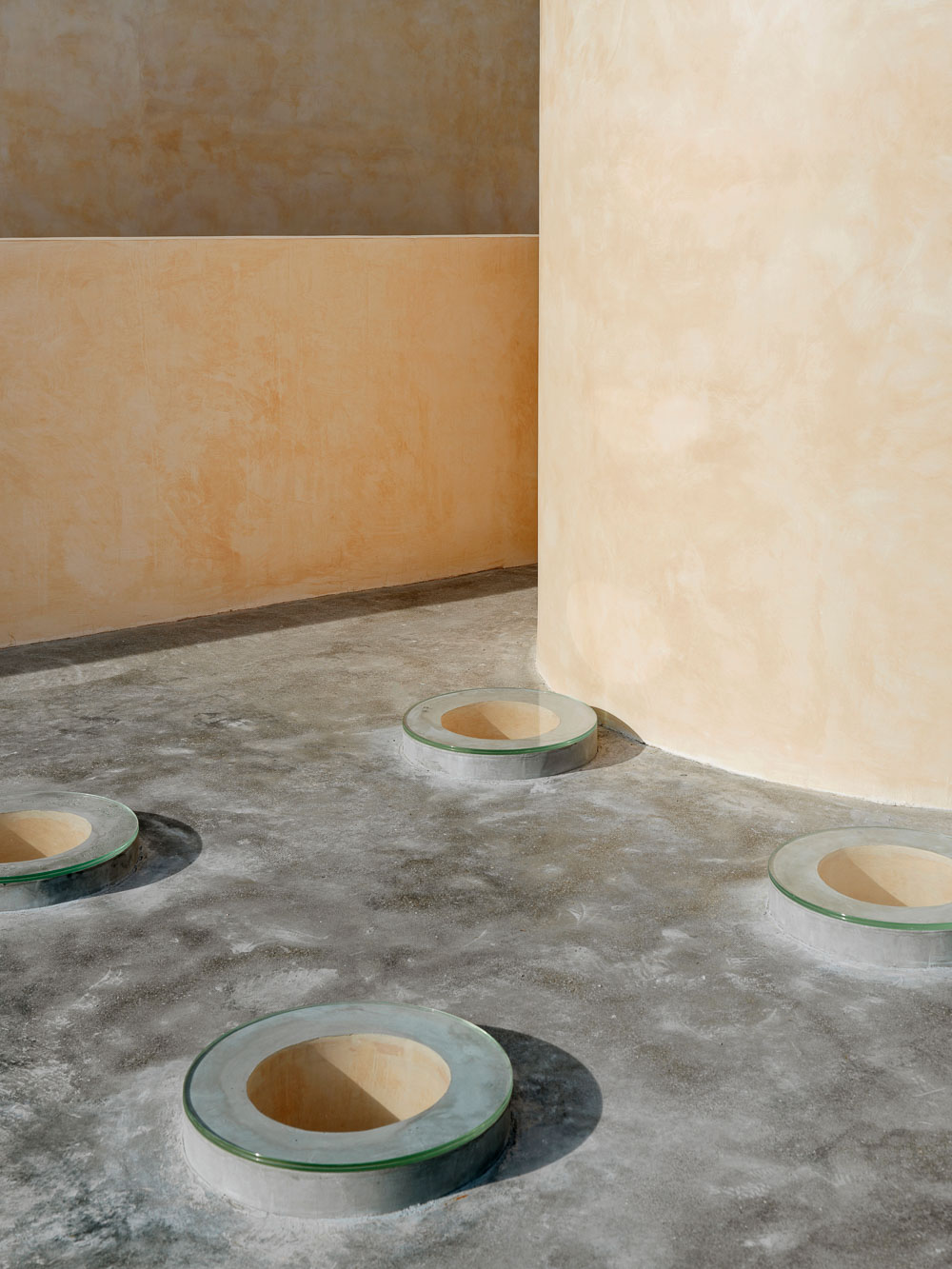 방문객들은 목련 나무의 안내를 받으며 벽을 지나 캐노피 아래 회전문을 통해 전시장으로 들어간다. 낮은 로비에 도착하면, 늘어선 원형 채광창이 만든 ‘빛의 비’가 층고가 높은 전시장으로 자연스레 안내한다. 안뜰과 연결되는 메인 홀의 한쪽 면은 천장부터 바닥까지 내려오는 대형 창문을 두어 실내와 실외의 경계를 최대한 흐리게 했다. 메인 홀의 남쪽에는 4개의 출입구가 있어 빛과 어둠을 질서정연하게 구분하는 1층짜리 ‘어두운 방’으로 이어진다.