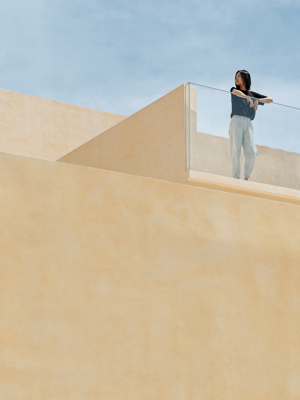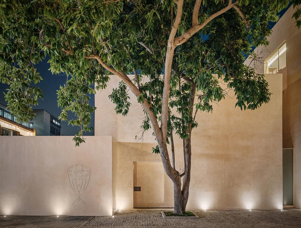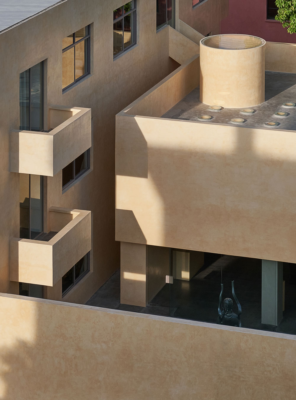 그 후 건물의 외부를 재배치하면서 단순화했고, 볼륨의 일부를 솔리드로 만들었다. 건물의 외부는 내부와 동일한 백단향 노란색으로 도색했으며, 벽의 특수한 질감은 작업자가 수작업으로 칠해 파사드가 달랐던 세 건물의 놀라운 무결성과 인지성을 되찾았다. 멀리서 보면 높고 울창한 목련나무가 시야의 중심을 차지하고 있는데, 건물은 캐노피 아래에 더 가려져 있어, 보이지 않는 듯 은은하고 절제되어 있다.