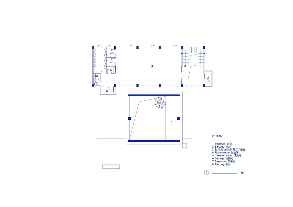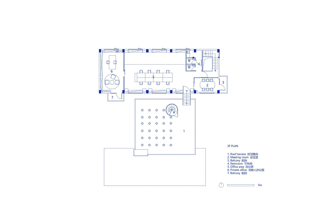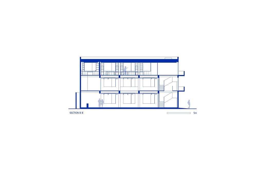 또한, 건물 2관과 3관을 연결하기 위해 테라스 모서리에 야외 계단을 추가했다. 사무실은 공간의 공간감과 투명성을 향상시키기 위해 두꺼운 엘리베이터 샤프트 벽을 제거하고 계단실 상단에 채광창을 추가했다. 빛과 그림자가 변화하는 수직 계단은 사무실 건물의 1층과 2층에 있는 패션쇼룸과 워크숍룸으로 이어진다.