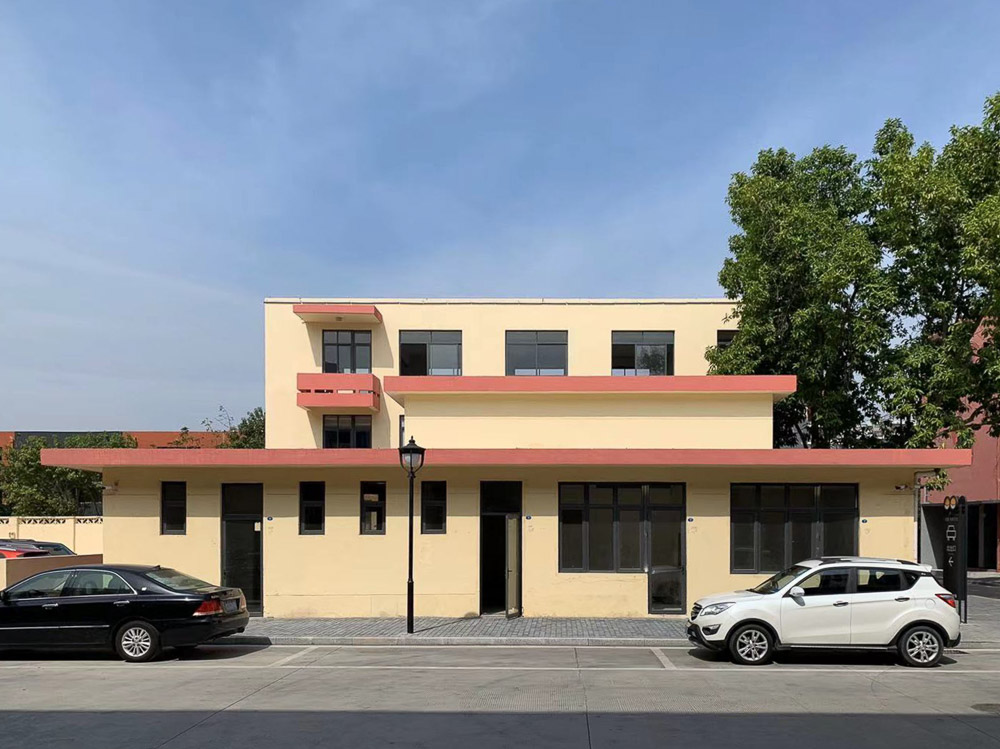 Afterwards, we rearrange and simplified the exterior of the building, making part of the volume solid. The exterior of the building is painted with the same sandalwood yellow color as the interior, and the special texture of the wall was hand-painted by the workers, thus making the three buildings, whose façades were originally different, regain the remarkable integrity and recognition. From a distance, a tall and dense magnolia tree occupies the center of the sight, and the building appears more obscured under the cover of the canopy, becoming more subtle and restrained, seemingly absent.