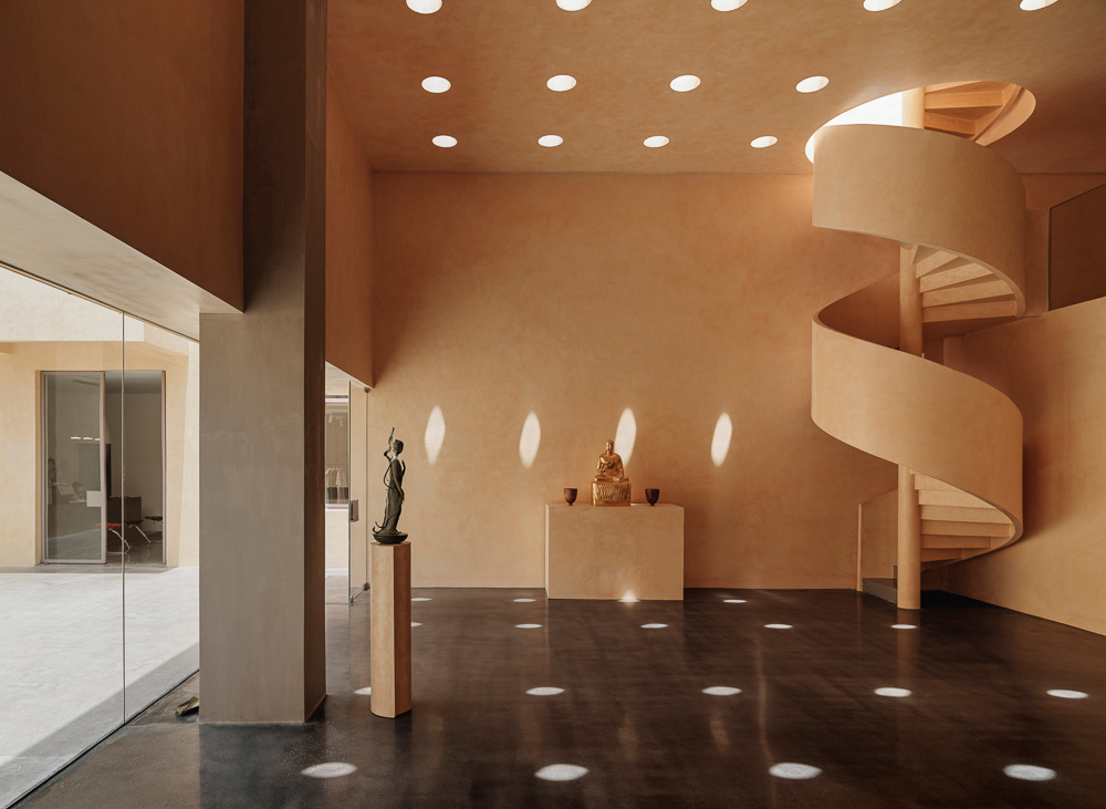 In one corner of the main exhibition hall, a spiral staircase leads vertically upward to the roof terrace, where the magnolia tree is just close at hand reach, and the fragrance of leaves and flowers welcomes you.