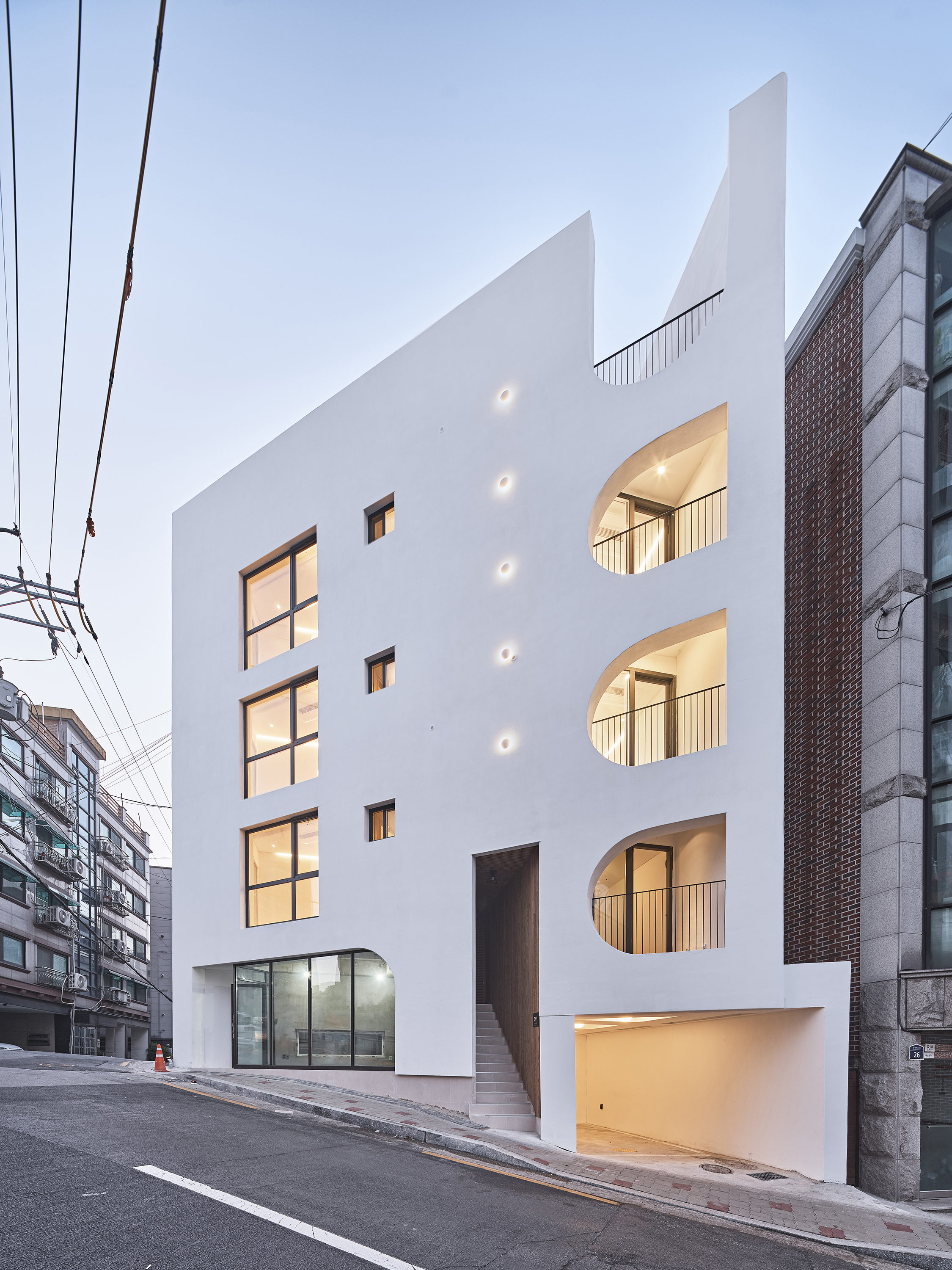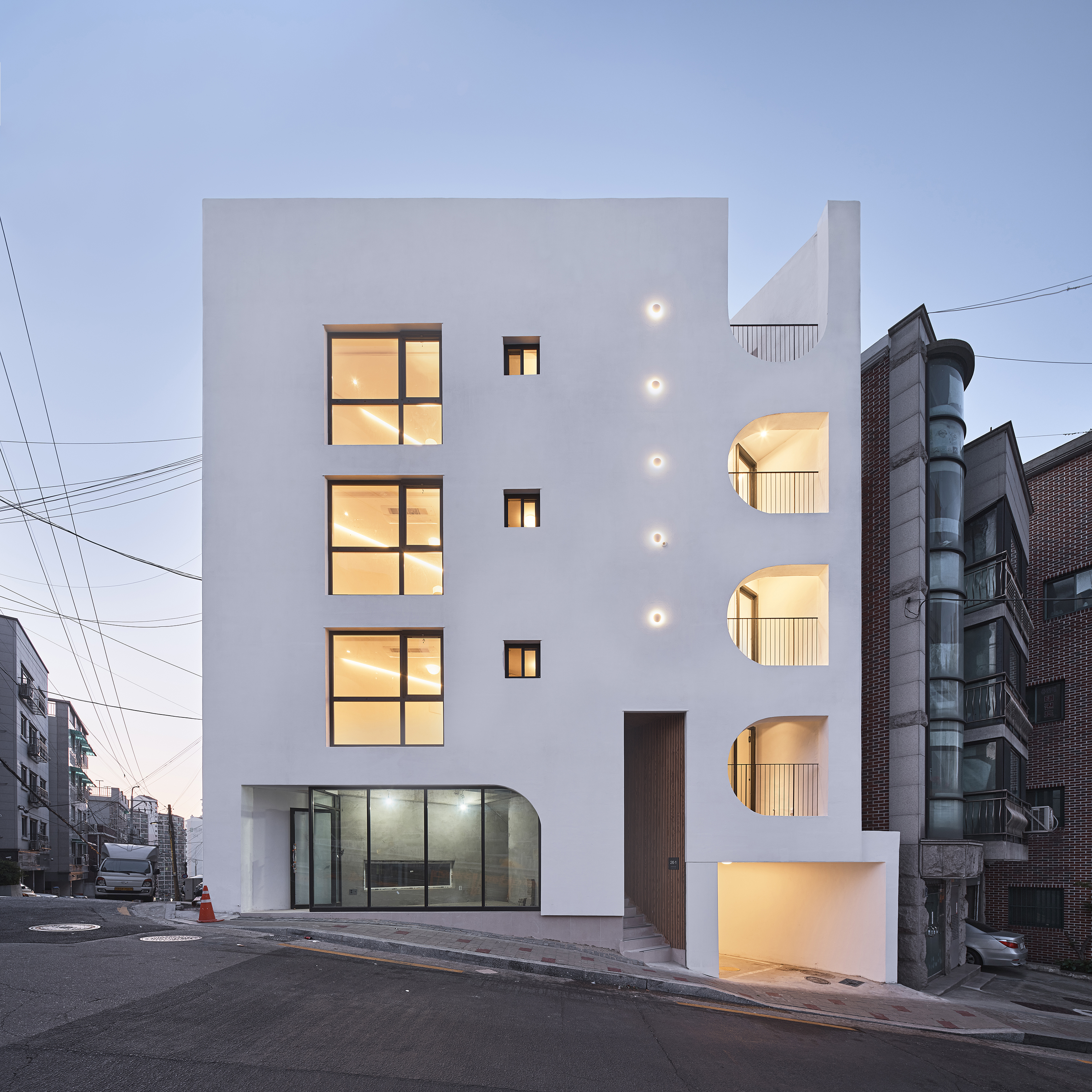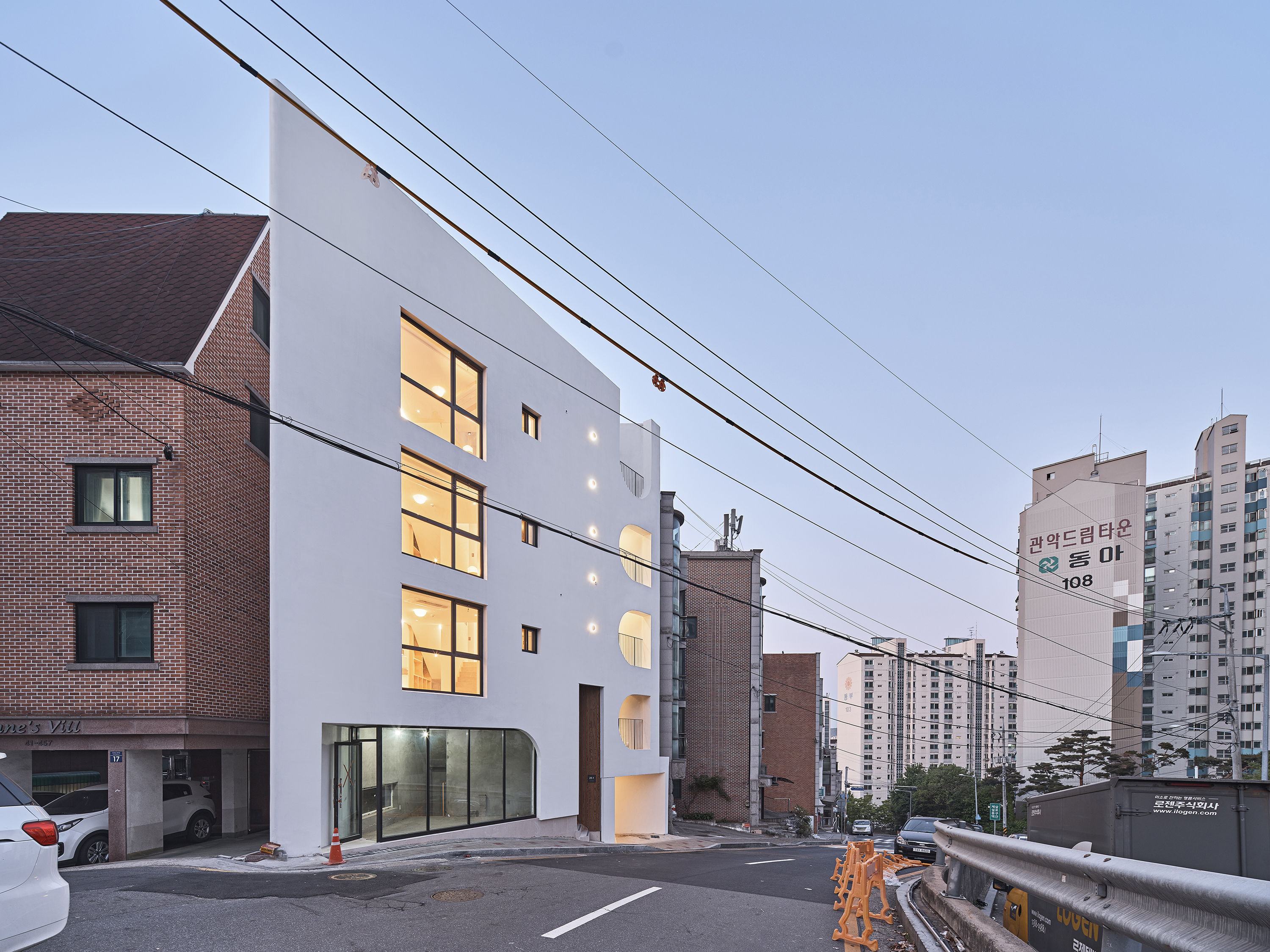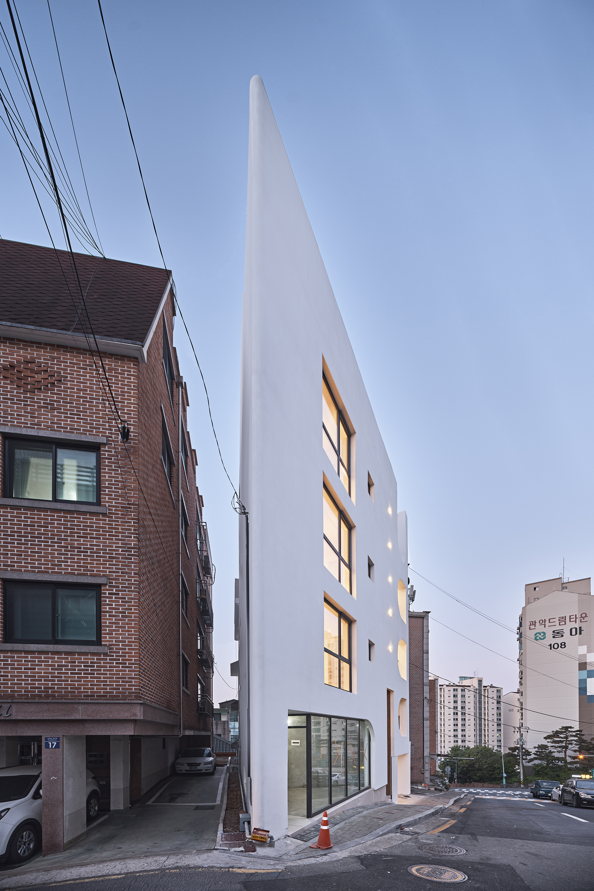 Bongcheon Yeonga(奉天聯家) is located on one side of Bongcheon Hill, at the corner of the road and at the intersection of the road, between the forests of five-story buildings, and is on 10-pyeong lot next to the sloping road. A beautiful streetscape that catches the curiosity and attention of residents while adapting to the existing city skyline was completed in a location where anyone passing by could see it but passed by without seeing it. In a limited space of 10 pyeong, a skip floor using stair landings connects the spaces above and below, and with 4 private rooms and 3 bathrooms, 3 generations from old parents to their children will live in the future.