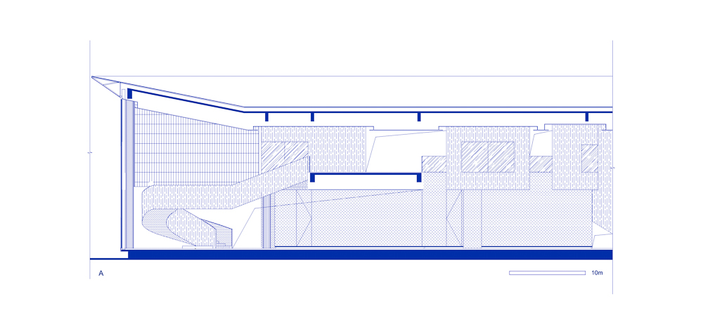 남쪽의 이중 높이 공간에 매달린 목재 스크린은 그늘을 만드는 동시에 구역 설정에 기여하도록 설계되었다. 이 수직적인 물결 형태의 스크린은 2층의 기능적인 영역과 관련하여 매스를 형성하는 동시에 외부 기둥을 모방하여 정적이고 조용한 분위기를 풍요롭게 한다.