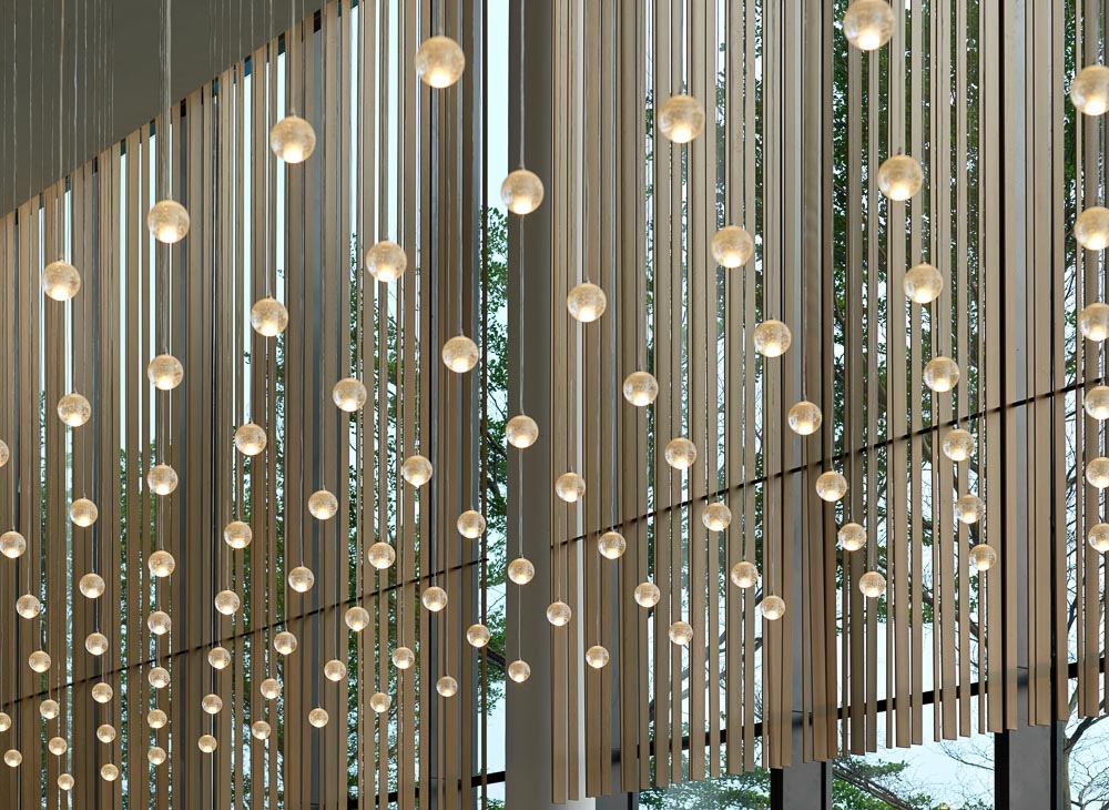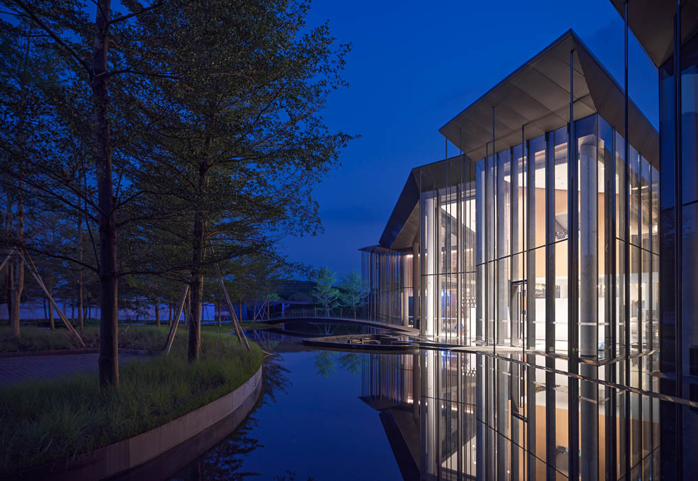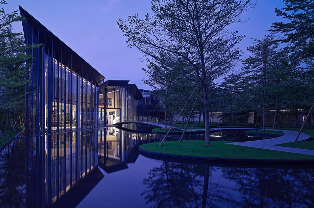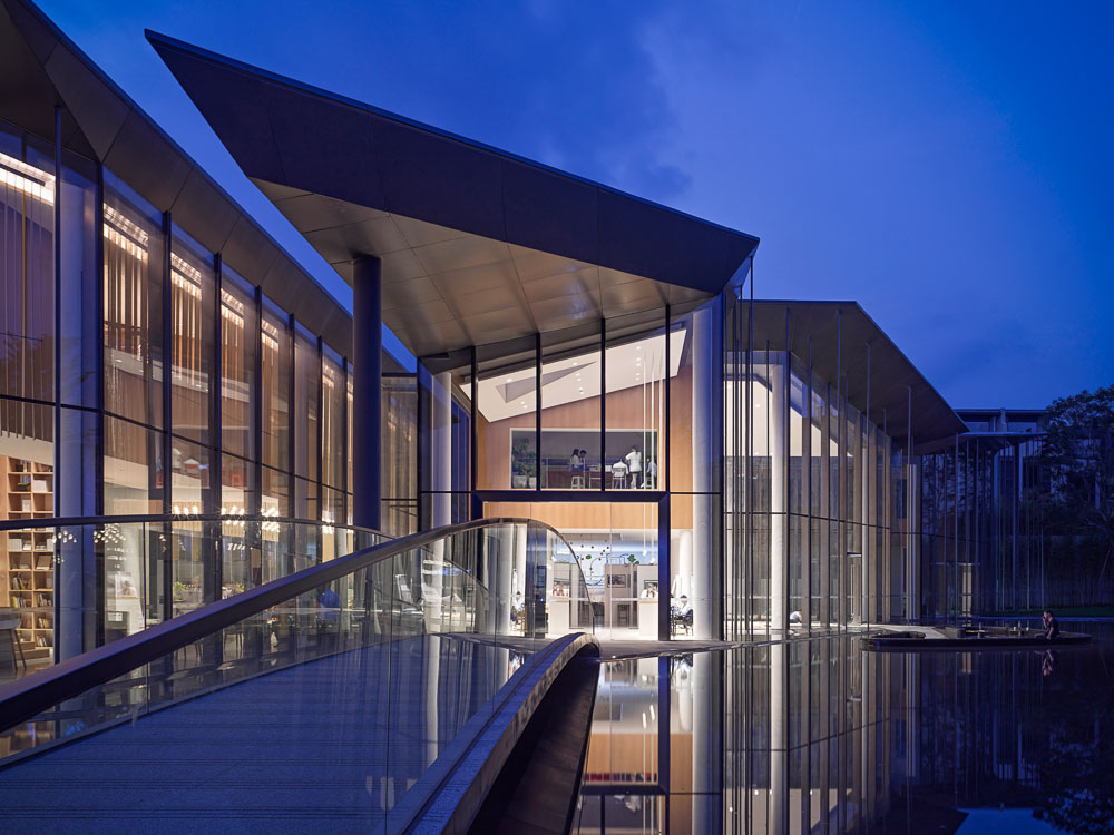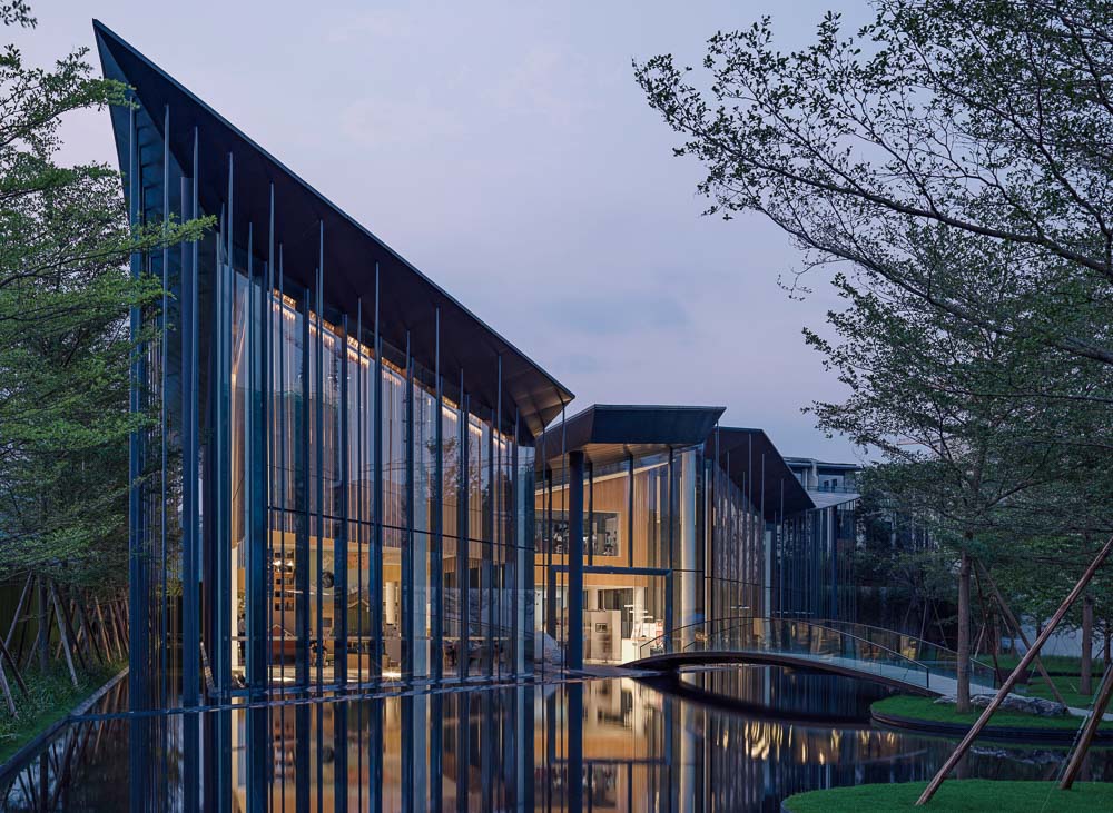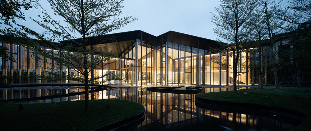 10m 두 배 높이에 매달린 나무 상자가 있는 넉넉한 캐노피는 방문객을 환영한다. 커튼월은 모든 각도에서 동일하게 투명한 시각적 경험을 보장한다. 선큰 휴게 공간, 천장에 매달린 목제 스크린, 계단과 책장 사이의 회의 공간, 2층의 프라이빗 VIP 라운지 등 다양한 기능을 가진 공간은 전체적인 통합성을 유지하면서 분리되도록 정교하게 배치되어 있다. 선큰 휴게 공간은 물로 둘러싸여 있어, 우수를 모으고 배수하는 하카 건축의 안뜰에 비유된다. 물은 빛과 그림자의 변화를 반영할 뿐만 아니라 공간에 푸르름을 불어넣고 인간과 자연이 통합된 조화로운 환경을 조성한다.