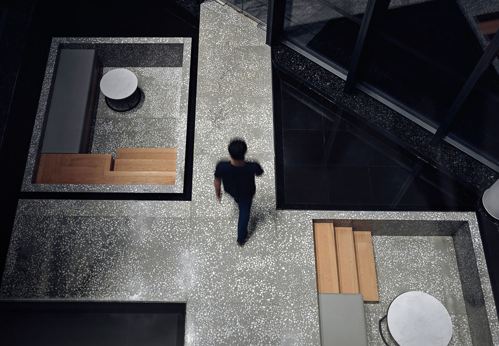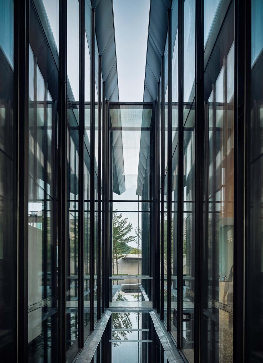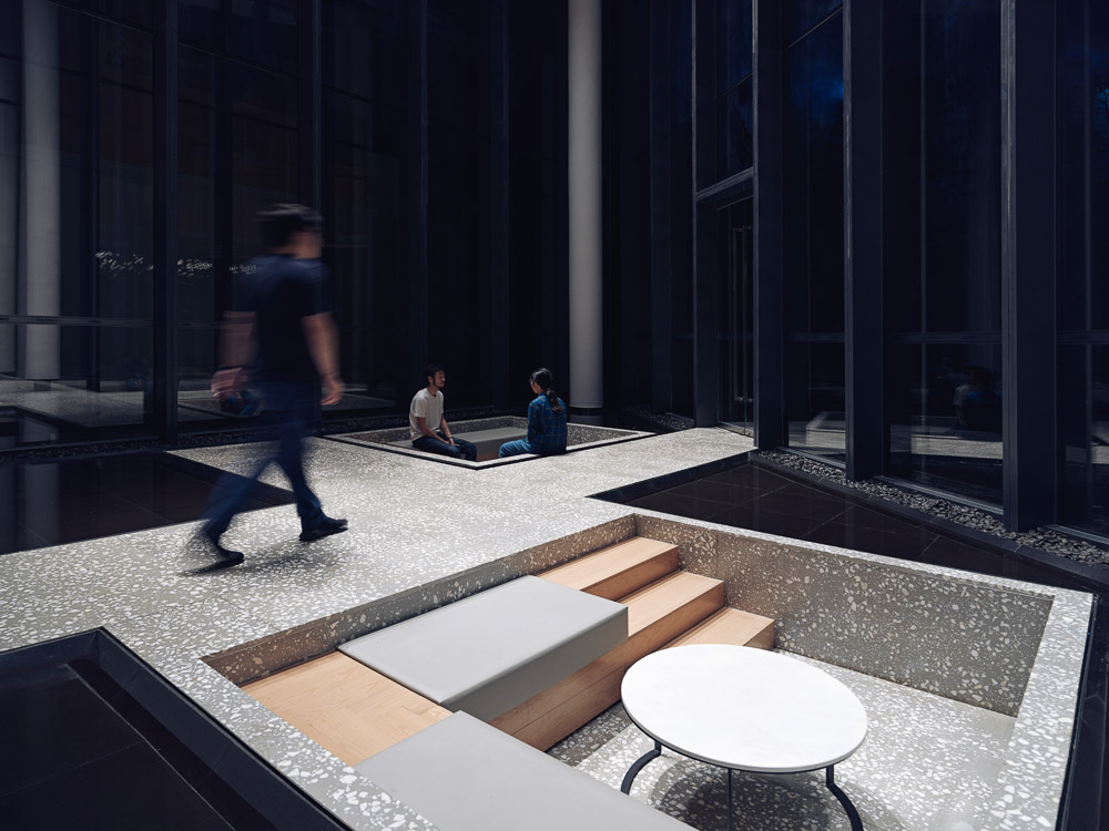 The sunken resting area is surrounded by water creating an analogy of the patio in Hakka architecture which collects and drains rainwater. The water not only reflects the variations of light and shadow, it also brings greenery into the space and builds up a harmonic environment integrating human and nature.
