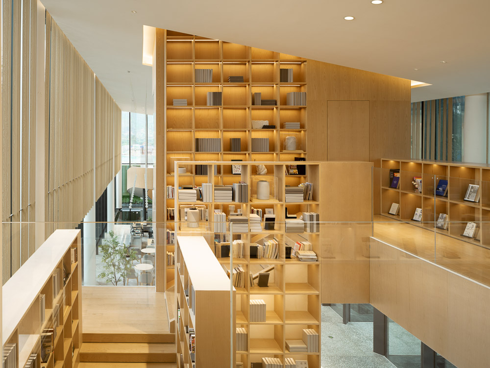 A generous canopy welcomes the visitors into the space, a 10m double height featuring suspended wooden boxes. The curtain wall guarantees the same transparent visual experience at all angles. Spaces with different functions are sophisticatedly arranged to be separated while keeping overall integrity: the sunken resting area, the wooden screen hanging from the ceiling, the meeting spaces in between stairs and bookshelves, the private VIP lounge on the second floor.