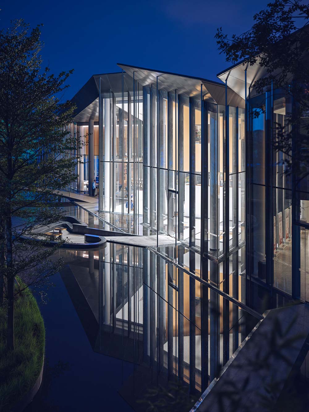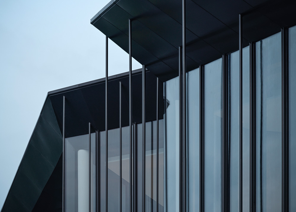 As Hakka buildings are located in the nature, this double-story building has a close relationship to the surrounding environment: the silhouette of the triangular roof overshadows the ground like a mountain while the metal columns supporting the triangular roof connect with the outdoor trees like a forest. Waterscape around the site smoothens the strict geometries. Large areas of glazing and surrounding green space redefines the relationship between the building and the environment. Elegant roofs, clusters of poles, full height curtain walls: a poem of mountains, trees and water.