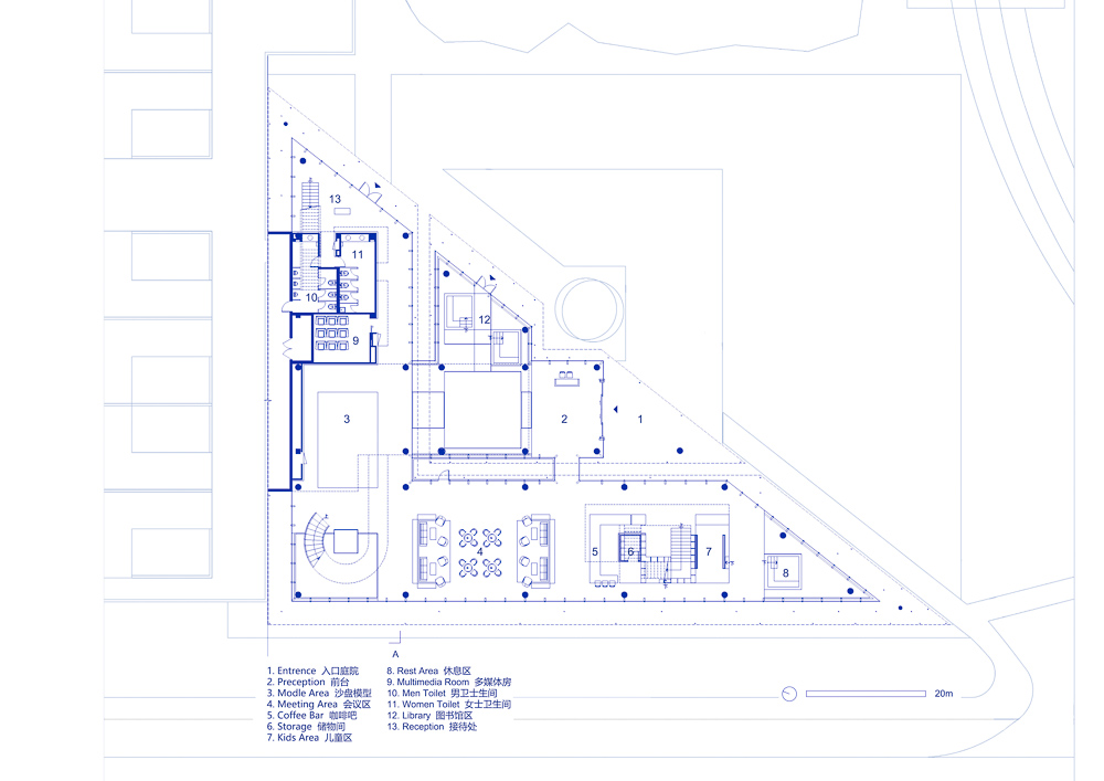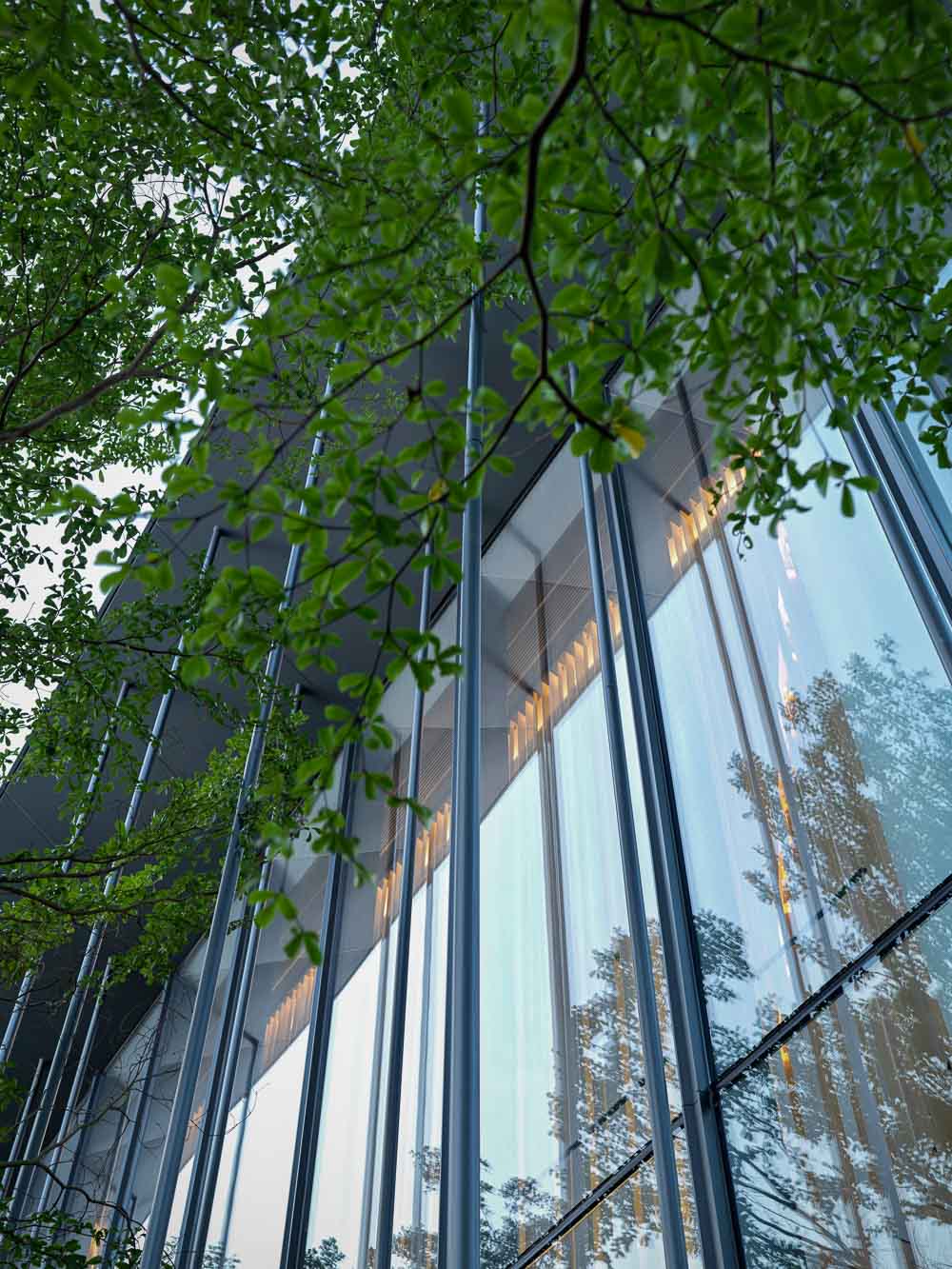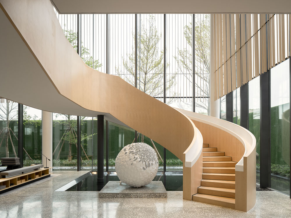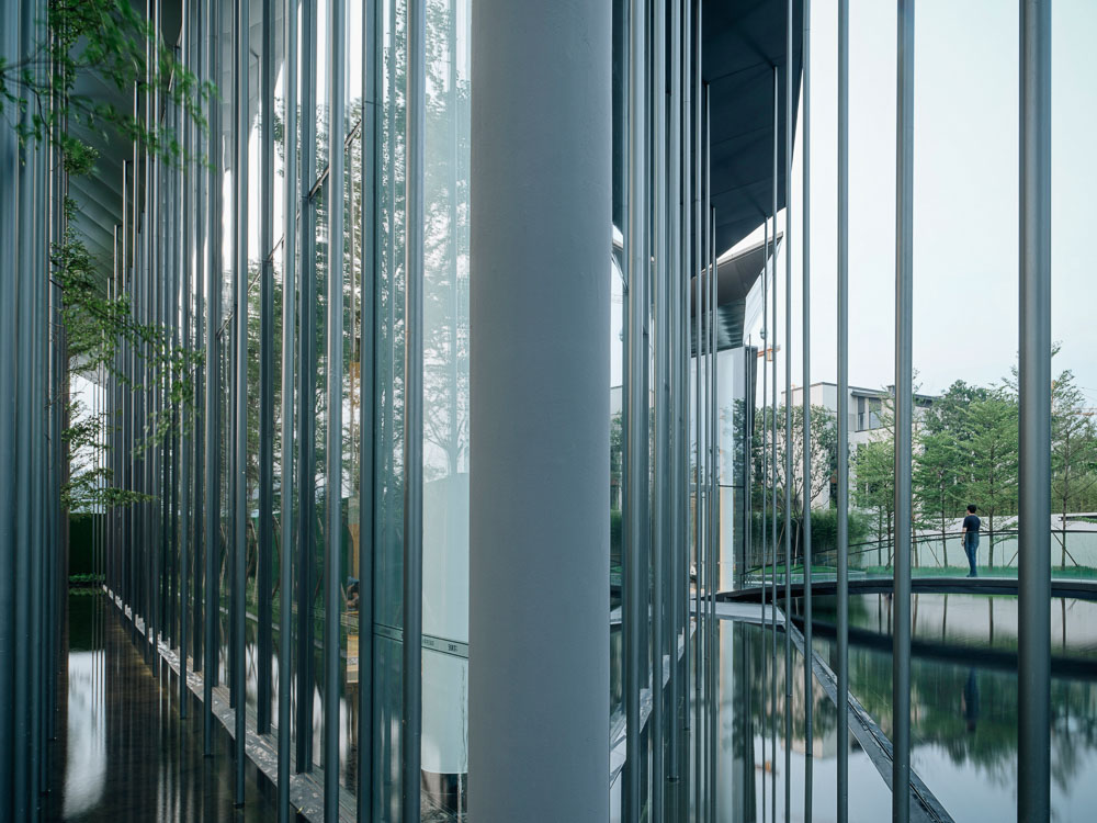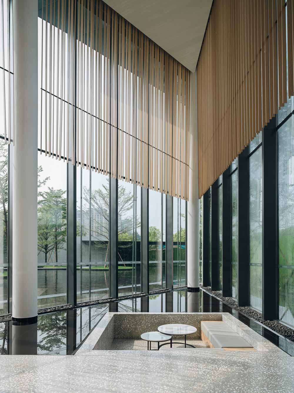 10m 두 배 높이에 매달린 나무 상자가 있는 넉넉한 캐노피는 방문객을 환영한다. 커튼월은 모든 각도에서 동일하게 투명한 시각적 경험을 보장한다. 선큰 휴게 공간, 천장에 매달린 목제 스크린, 계단과 책장 사이의 회의 공간, 2층의 프라이빗 VIP 라운지 등 다양한 기능을 가진 공간은 전체적인 통합성을 유지하면서 분리되도록 정교하게 배치되어 있다. 선큰 휴게 공간은 물로 둘러싸여 있어, 우수를 모으고 배수하는 하카 건축의 안뜰에 비유된다. 물은 빛과 그림자의 변화를 반영할 뿐만 아니라 공간에 푸르름을 불어넣고 인간과 자연이 통합된 조화로운 환경을 조성한다.