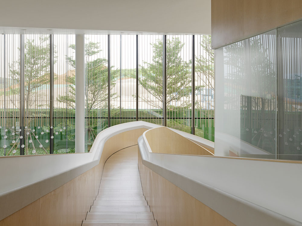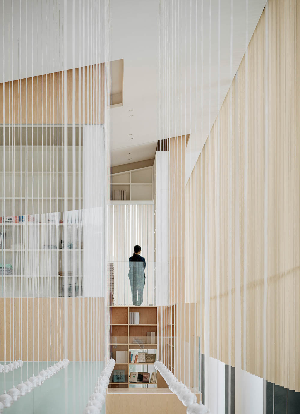 To adapt to the local climate, suspended wooden screen in the double height space on the south side are designed to create shading while also contributing to zoning. This vertical waving screen enriches the static and quiet mood echoing the exterior poles while also forming a volume in relation to the functional areas on the second floor.