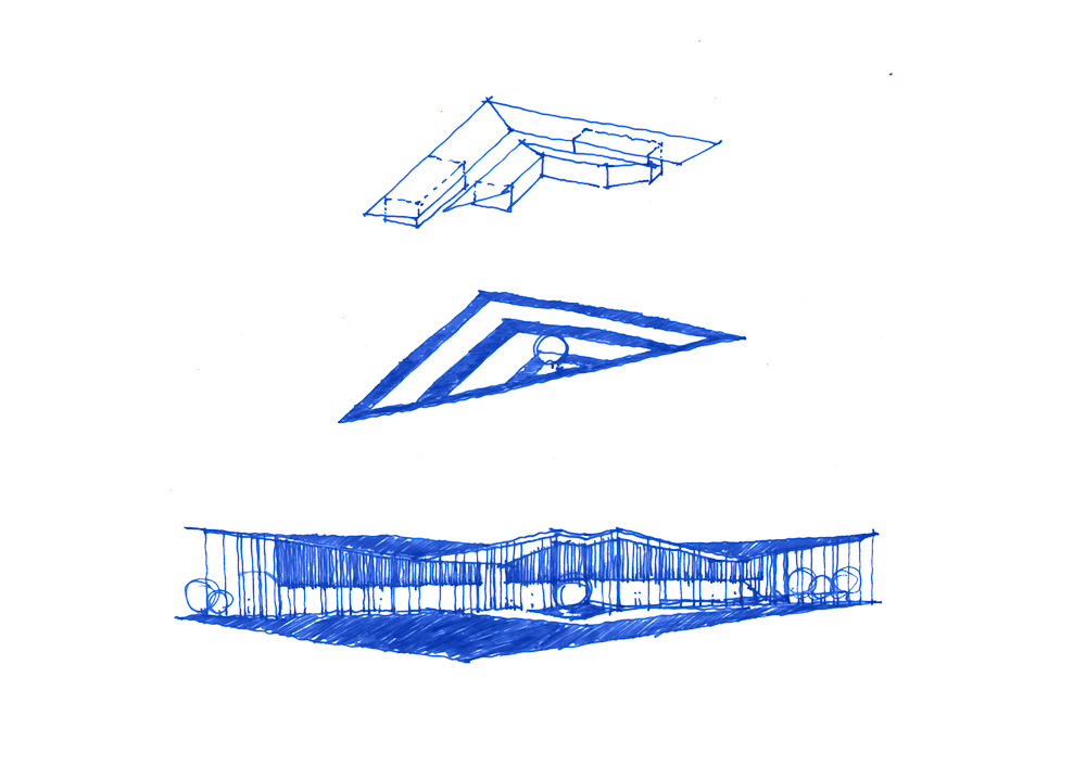 “Wei Long Wu” (Round Dragon Housing), also named “Long Wu”, is a variation of Hakka architecture, mostly spread around Guangdong Province and is a common form of traditional clan housing. Wei Long Wu uses rammed earth as the outer wall to enclose inner housing which forms multiple concentric semi-circular structures, which have distinct functional zoning. In this project, the design adopts a contemporary composition to break the traditional Hakka architecture's layout. The geometric space is transformed from multiple concentric semicircles into similar triangles. The frames repetition, the plane and the overall scheme emphasizes the depth of field. The resulting configuration creates a visual sensation of layers while maintaining an open space.