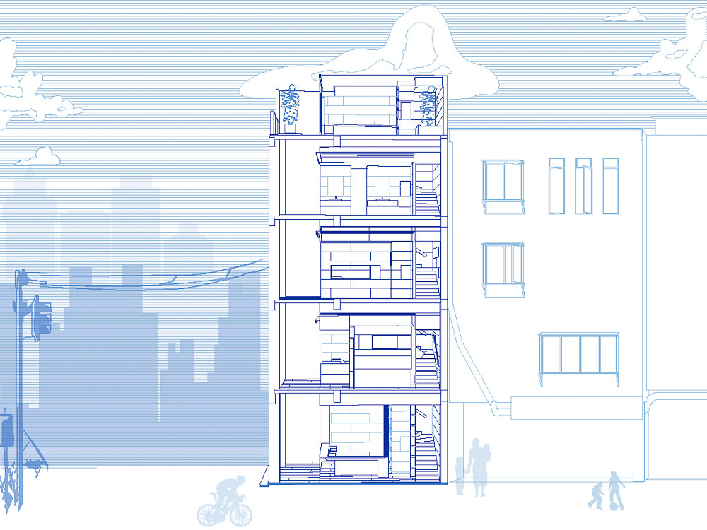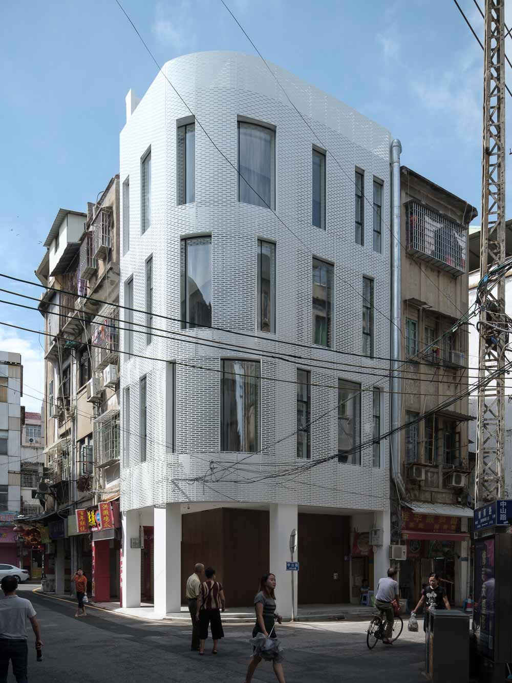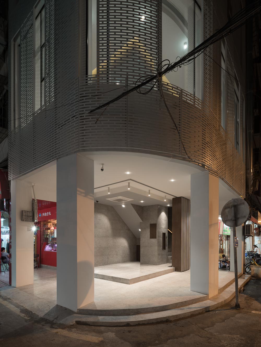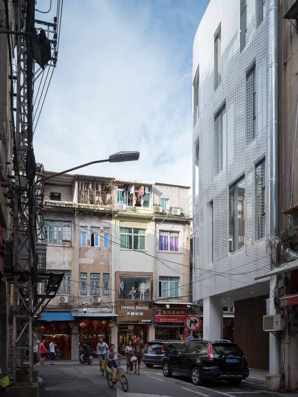 대지의 맥락 및 건축적 기능은 기능적 요구 사항을 만족시키면서 동시에 설계시, 고려해야 하는 중요요소다. 주변의 모든 건물은 아케이드이지만, 도로 측 입면은 오랜 시간과 유지 관리 부족으로 다소 지저분해 보였다. 새롭게 디자인된 입면은 옛 거리에 경쾌하고 활기찬 분위기를 불어넣고, 전통적인 건축양식과 새로운 내적 관계를 형성한다. 따라서 건축가는 파사드의 기존 디자인을 알루미늄 격자로 수정하고 샤먼 현지 붉은 벽돌 크기를 모듈로 채택하여 현대적인 재료로 전통적 형태로 표현하며, 오래된 골목에 새로운 감각을 더했다. 또한, 건축가는 일일 일조량 데이터에 따라 변화되는 값을 계산하여 격자에 있는 개구부의 리듬을 형성하고, 단열과 차양을 동시에 해결했다.