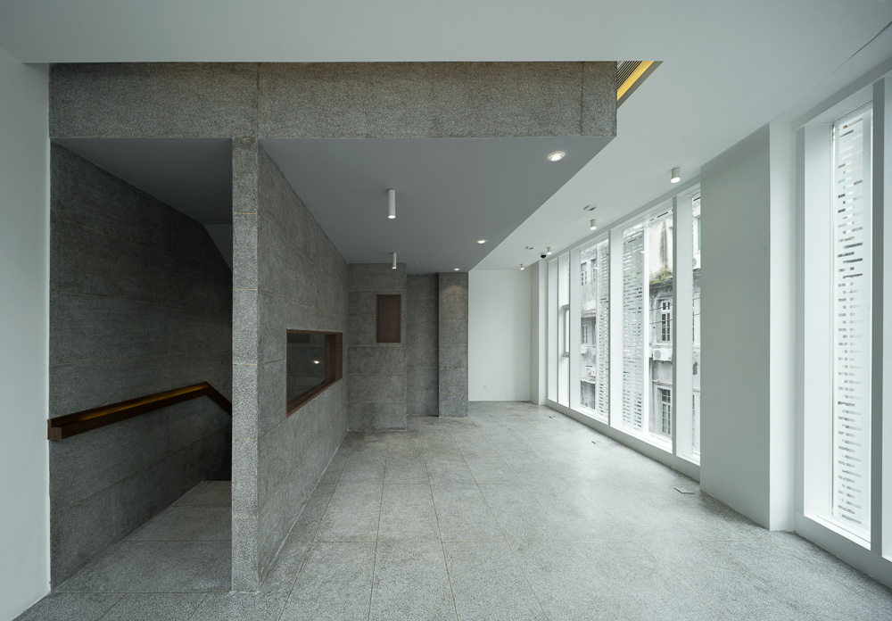 Interior design emphasizes the contrast of light and heavy, dark and light to the external facade. In addition, terrazzo is applied in the area of floor and wall, and consequently forms a grey core vertically running through 5 floors. In the evening, the livest time in the Zhongshan Road area, it can be seen even in the distance as a self-luminous volume with massive inner core and lightsome frock.