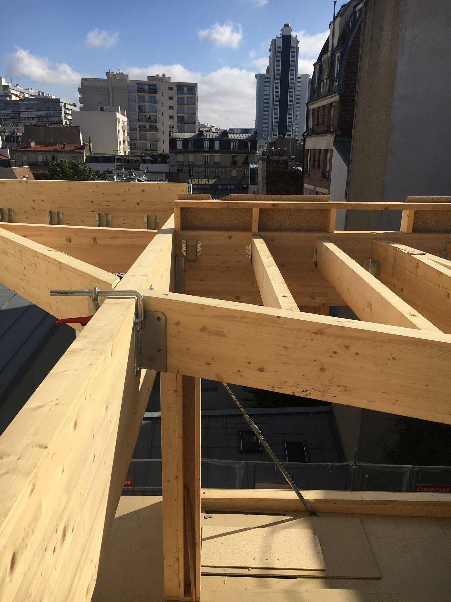 The project is located between two social housing buildings of five and six floors. Built at the end of the 19th century, the existing building was restructured in 1997 with is in good structural condition. The administrative and technical feasibility leads the architects to offer their client an elevation made up of two levels (each of around 60m2) with one accommodation per level. The accommodation on the 4th floor has terraces and a roof with a green hill and the 3rd floor has a planted balcony.