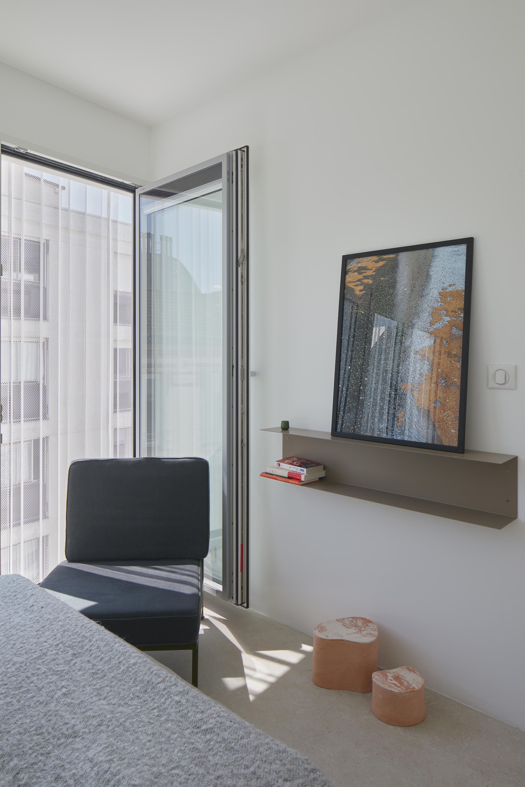 At the 4th and last floor the apartment becomes a house with its terrace and roof garden. Generous volumes, high ceiling and a fluid layout define a spacious and homogeneous accommodation. The glass wall open to the courtyard side favor natural light and views of the Paris urban Lanscape. The 3rd floor crossing apartment is more classic in style. He has a distribution that promotes fluidity and decompartmentalization of the space. To highlight the transversality of the whole the kitchen worktop continues with a seat on the lounge side. From the rolling balcony plants filter the views of the building opposite.
