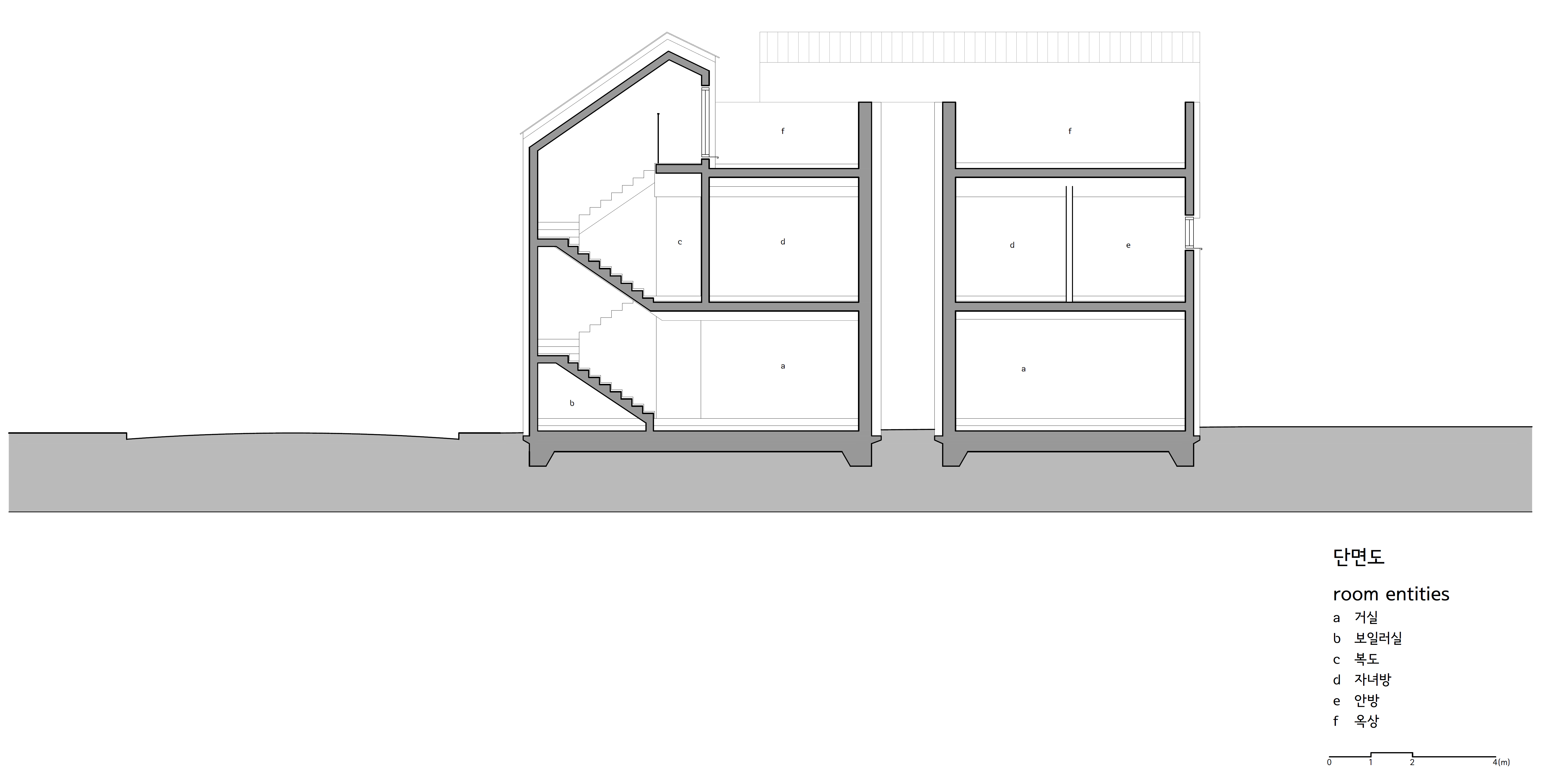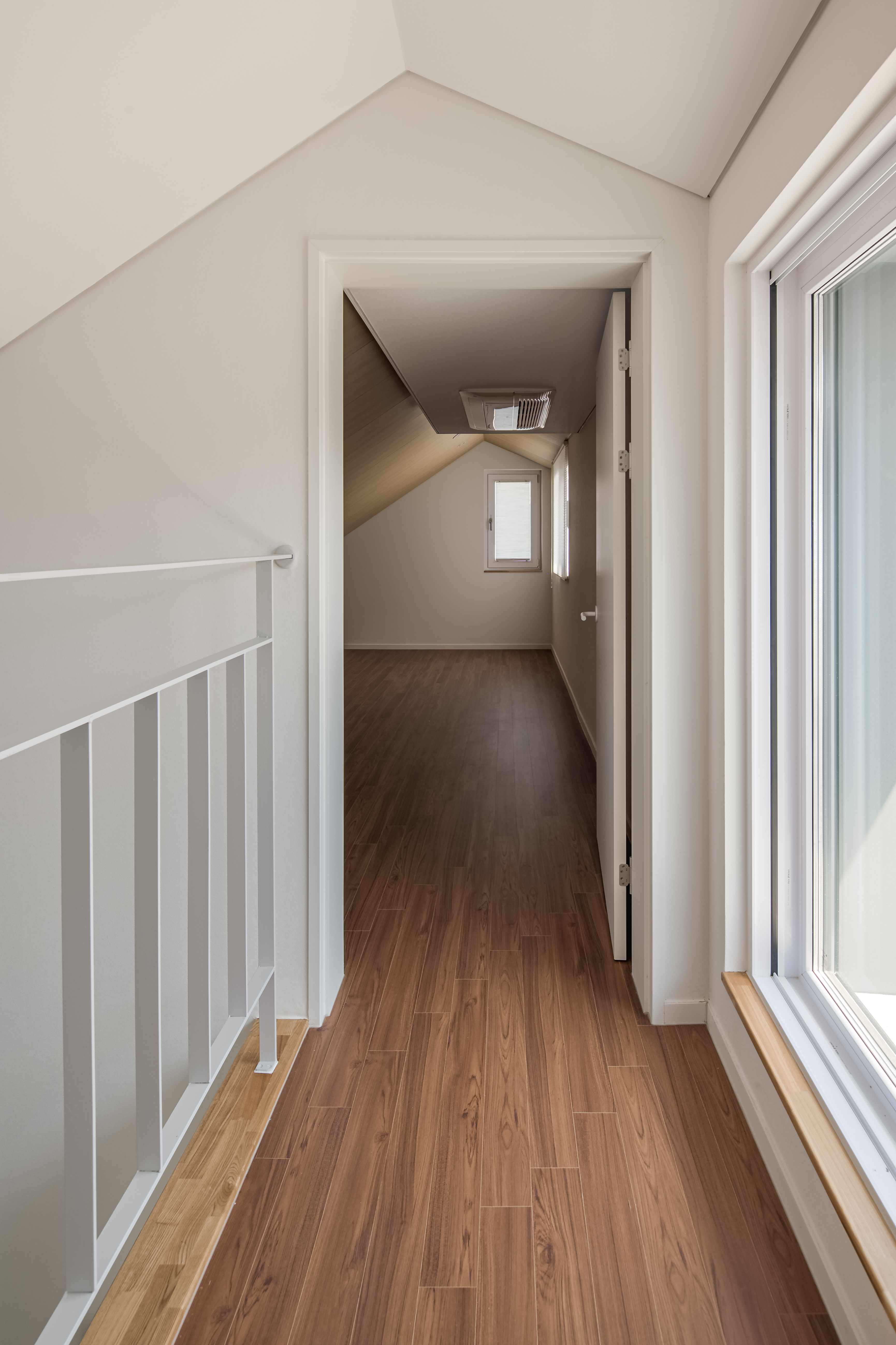 집 내부로 들어서면 복도를 중간으로 한쪽은 화장실, 주방, 보조 주방 등의 서브 공간이 있으며, 반대편은 거실, 안방, 자녀 방이 나타난다. 옥상 테라스를 넓게 계획하여 외부공간의 활용성을 제고했다.
